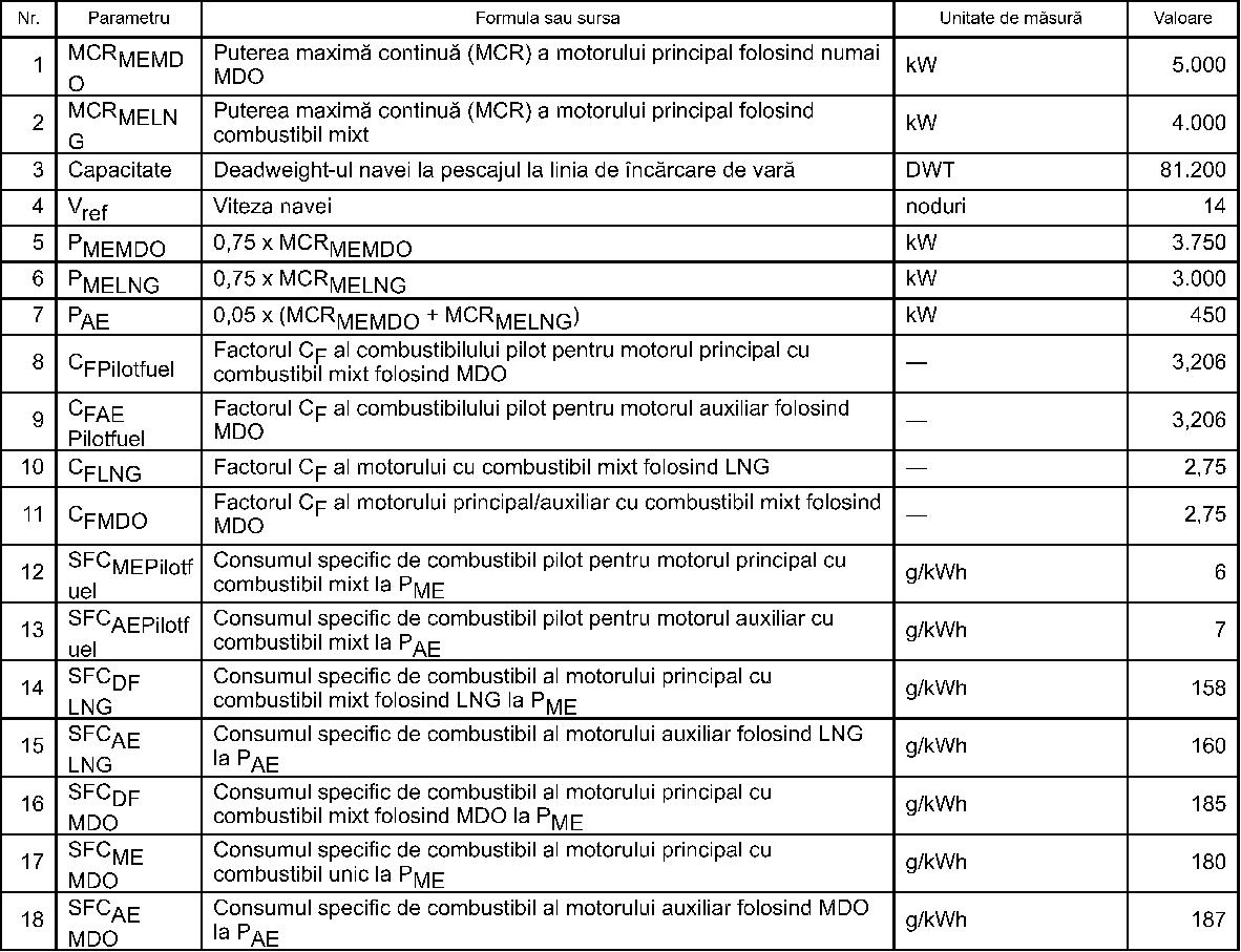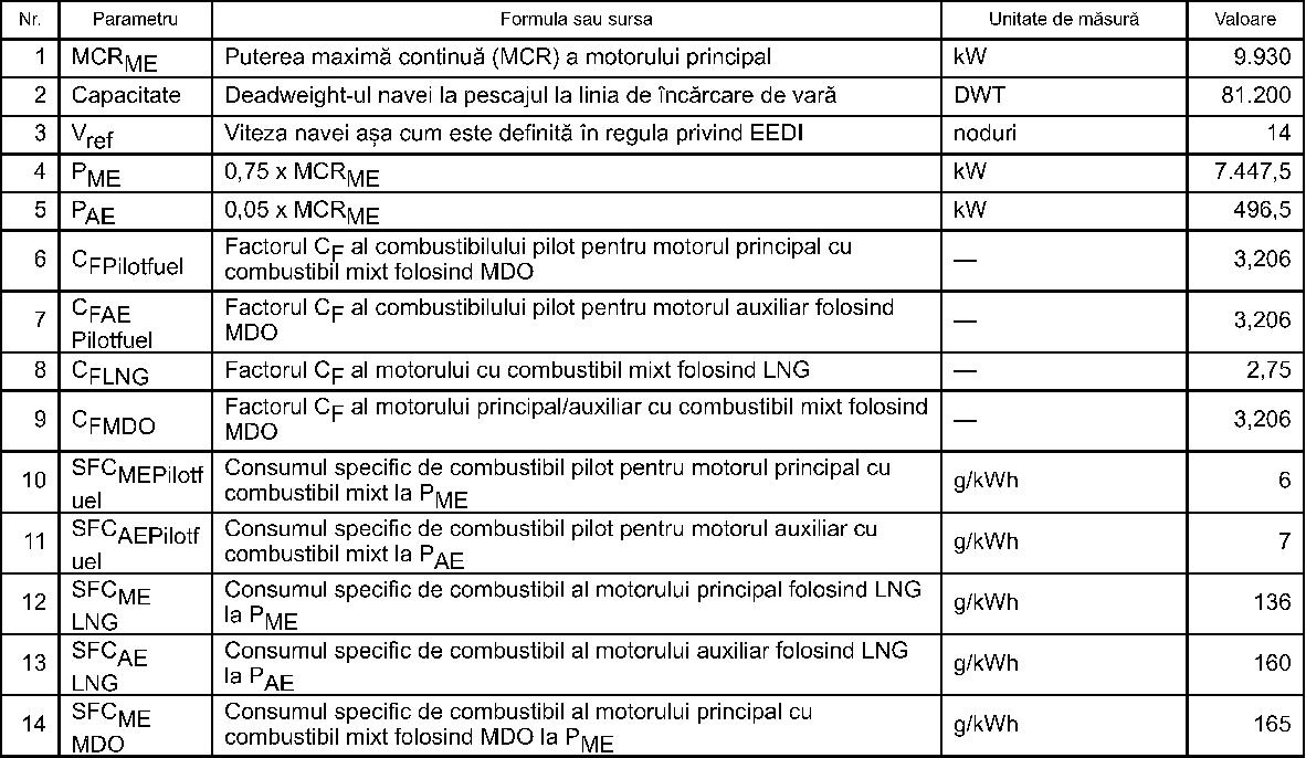 Figura 2 - Exemplu de plan de conversie de la condiţia de efectuare a probei la condiţia indicelui EEDI la puterea corespunzând lui EEDI NOTĂ: AR FI NECESARĂ EXAMINAREA ÎN CONTINUARE A METODOLOGIEI DE AJUSTARE A VITEZEI MENŢIONATE ÎN PARAGRAFUL 4.3.9.2 DIN PREZENTELE LINII DIRECTOARE. UNA DINTRE PREOCUPĂRI SE REFERĂ LA O SITUAŢIE POSIBILĂ ÎN CARE CURBA DE PUTERE PENTRU CONDIŢIA PROBEI DE MARE ESTE ESTIMATĂ ÎNTR-O MANIERĂ EXCESIV DE PRUDENTĂ (DE EXEMPLU, CURBA PUTERII ESTE DEPLASATĂ ÎNSPRE STÂNGA) CU INTENŢIA DE A DA O AJUSTARE CRESCĂTOARE A VITEZEI NAVEI, FĂCÂND CA VITEZA MĂSURATĂ A NAVEI ÎN TIMPUL PROBEI DE MARE SĂ DEPĂŞEASCĂ UŞOR VITEZA SUBESTIMATĂ PENTRU CONDIŢIA PROBEI DE MARE, LA STADIUL DE PROIECTARE. ANEXA Nr. 4REZOLUŢIA MEPC.262(68) (adoptată la 15 mai 2015) Amendamente la Liniile directoare interimare din 2013 pentru determinarea puterii minime de propulsie pentru menţinerea manevrabilităţii navelor în condiţii nefavorabile [Rezoluţia MEPC.232(65), aşa cum a fost amendată prin Rezoluţia MEPC.255(67)] Comitetul pentru protecţia mediului marin, amintind articolul 38(a) al Convenţiei privind crearea Organizaţiei Maritime Internaţionale referitor la funcţiile Comitetului pentru protecţia mediului marin conferite acestuia prin convenţiile internaţionale pentru prevenirea şi controlul poluării marine de la nave, amintind, de asemenea, că la cea de-a şaizeci şi doua sesiune a sa Comitetul a adoptat, prin Rezoluţia MEPC.203(62), Amendamente la anexa Protocolului din 1997 privind amendarea Convenţiei internaţionale din 1973 pentru prevenirea poluării de către nave, aşa cum a fost modificată prin Protocolul din 1978 referitor la aceasta (includerea regulilor referitoare la randamentul energetic al navelor în anexa VI la MARPOL), luând notă de faptul că amendamentele la anexa VI la MARPOL sus-menţionate au intrat în vigoare la 1 ianuarie 2013, luând notă, de asemenea, de faptul că regula 21.5 din anexa VI la MARPOL, aşa cum a fost amendată, prevede că puterea de propulsie instalată nu trebuie să fie mai mică decât puterea de propulsie necesară pentru menţinerea manevrabilităţii navei în condiţii nefavorabile, aşa cum sunt ele definite în liniile directoare care urmează să fie elaborate de către Organizaţie, luând notă, în continuare, de faptul că la cea de-a şaizeci şi cincea sesiune a sa Comitetul a adoptat, prin Rezoluţia MEPC.232(65), Liniile directoare interimare din 2013 pentru determinarea puterii minime de propulsie pentru menţinerea manevrabilităţii navelor în condiţii nefavorabile (liniile directoare interimare) şi, la cea de-a şaizeci şi şaptea sesiune a sa, prin Rezoluţia MEPC.255(67), amendamente referitoare la acestea, recunoscând că amendamentele la anexa VI la MARPOL impun adoptarea de linii directoare relevante pentru implementarea uşoară şi uniformă a regulilor şi pentru a oferi timp suficient industriei să se pregătească, luând în considerare, la cea de-a şaizeci şi opta sesiune a sa, propunerile de amendamente la liniile directoare interimare, 1 adoptă amendamentele la Liniile directoare interimare din 2013 pentru determinarea puterii minime de propulsie pentru menţinerea manevrabilităţii navelor în condiţii nefavorabile, aşa cum au fost amendate, al căror text este prezentat în anexa la prezenta rezoluţie; 2 invită administraţiile să ia în considerare amendamentele sus-menţionate atunci când elaborează şi adoptă actele normative naţionale care dau forţă şi pun în aplicare dispoziţiile stabilite în regula 21.5 din anexa VI la MARPOL, astfel cum a fost amendată; 3 solicită părţilor la anexa VI la MARPOL şi altor guverne membre să aducă amendamentele în atenţia proprietarilor, operatorilor, constructorilor şi proiectanţilor de nave, precum şi oricăror altor grupuri interesate; 4 este de acord să ţină aceste linii directoare, aşa cum au fost amendate, sub observaţie în lumina experienţei acumulate prin aplicarea lor. ANEXĂla Rezoluţia MEPC.262(68) Amendamente la Liniile directoare interimare din 2013 pentru determinarea puterii minime de propulsie pentru menţinerea manevrabilităţii navelor în condiţii nefavorabile [Rezoluţia MEPC.232(65), aşa cum a fost amendată prin Rezoluţia MEPC.255(67)] Apendice - Proceduri de evaluare pentru menţinerea manevrabilităţii în condiţii nefavorabile, aplicabile în faza 0 şi faza 1 a punerii în aplicare a EEDI Tabelul 1 de la paragraful 2 se înlocuieşte după cum urmează: Tabelul 1: Parametrii a şi b pentru determinarea valorilor liniei de putere minimă pentru diferite tipuri de nave