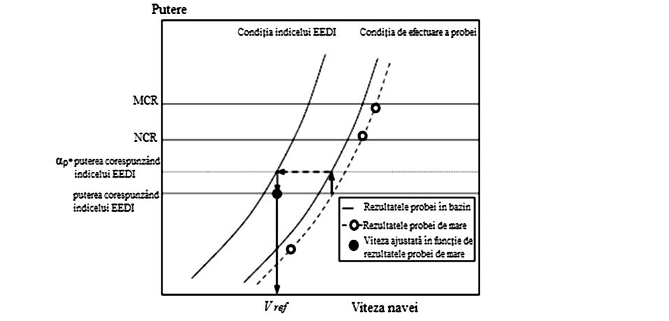 unde: PTrial,P: puterea în condiţia de efectuare a probei prezisă de probele în bazin PTrial,S: puterea în condiţia de efectuare a probei obţinută de probele de viteză şi de putere αP: raportul de putere Fig. 2 arată un exemplu de sistem de conversie ce permite obţinerea vitezei navei în condiţia de efectuare a probei (Vref ) la puterea corespunzând indicelui EEDI.
