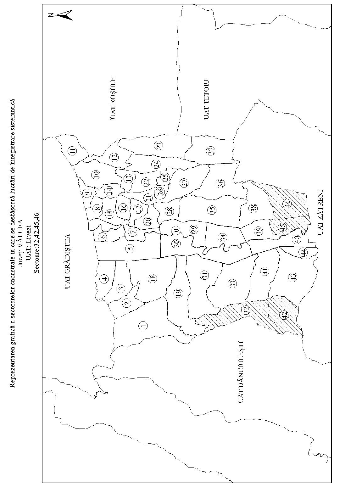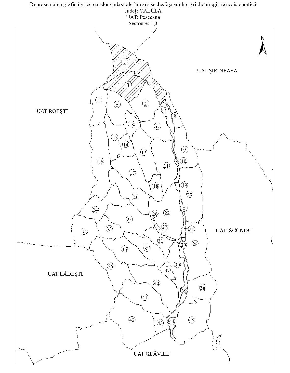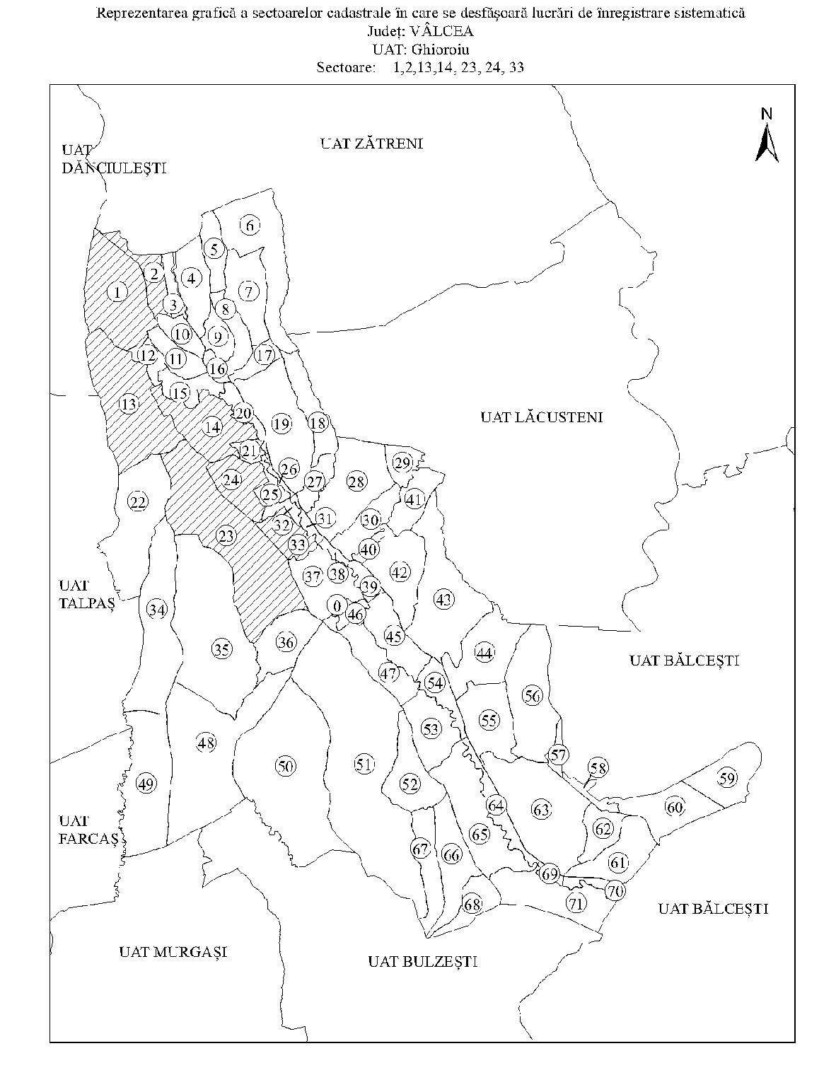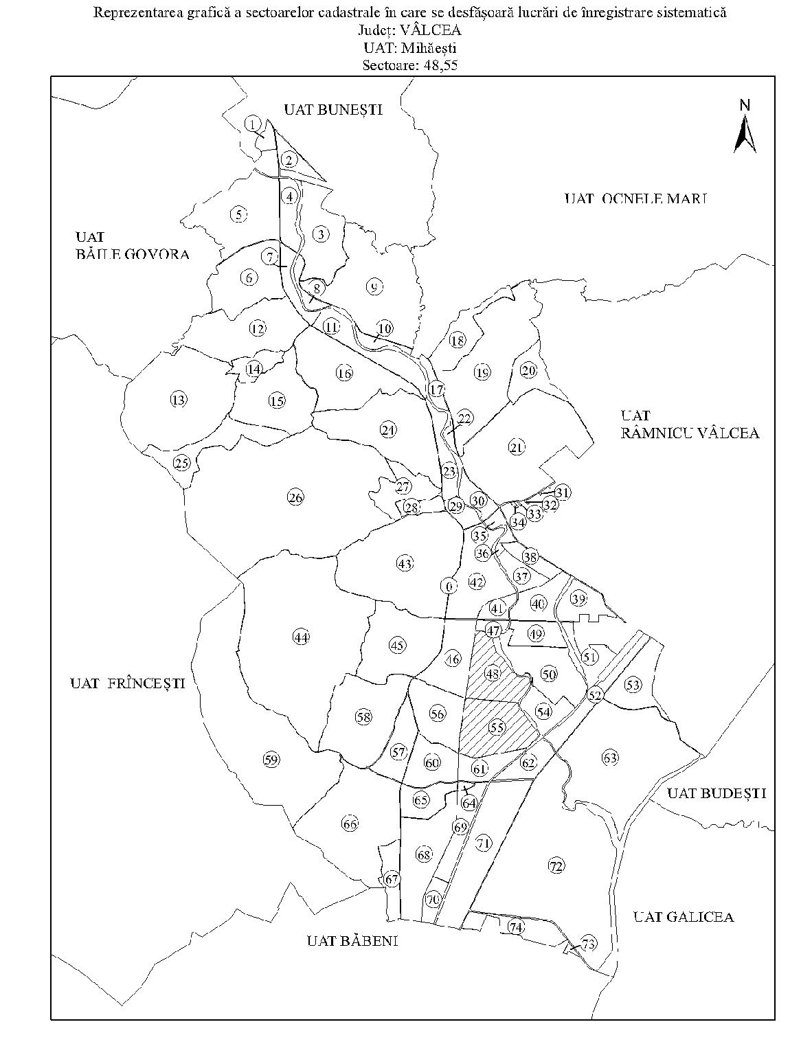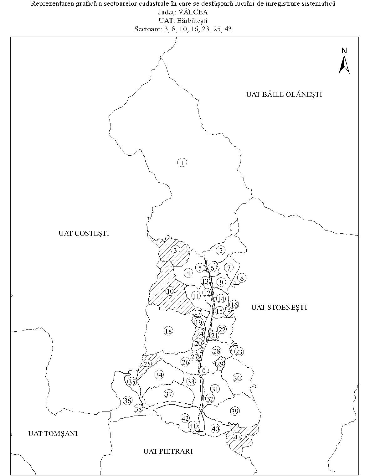 Având în vedere prevederile art. 11 alin. (1) din Legea cadastrului şi a publicităţii imobiliare nr. 7/1996, republicată, cu modificările şi completările ulterioare, şi ale art. 15 alin. (3) din Regulamentul de organizare şi funcţionare a Agenţiei Naţionale de Cadastru şi Publicitate Imobiliară, aprobat prin Hotărârea Guvernului nr. 1.288/2012, cu modificările şi completările ulterioare, în temeiul art. 3 alin. (13) din Legea cadastrului şi a publicităţii imobiliare nr. 7/1996, republicată, cu modificările şi completările ulterioare, directorul general al Agenţiei Naţionale de Cadastru şi Publicitate Imobiliară emite prezentul ordin. Articolul 1 Se aprobă începerea lucrărilor de înregistrare sistematică a imobilelor, pe sectoare cadastrale, situate pe teritoriul a 10 unităţi administrativ-teritoriale din judeţul Vâlcea, după cum urmează: a)unitatea administrativ-teritorială Bărbăteşti - sectoarele cadastrale nr. 3, 8, 10, 16, 23, 25 şi 43; b)unitatea administrativ-teritorială Ghioroiu - sectoarele cadastrale nr. 1, 2, 13, 14, 23, 24 şi 33; c)unitatea administrativ-teritorială Livezi - sectoarele cadastrale nr. 32, 42, 45 şi 46; d)unitatea administrativ-teritorială Mihăeşti - sectoarele cadastrale nr. 48 şi 55; e)unitatea administrativ-teritorială Orleşti - sectoarele cadastrale nr. 32, 33 şi 44; f)unitatea administrativ-teritorială Păuşeşti - sectoarele cadastrale nr. 13, 19, 30 şi 40; g)unitatea administrativ-teritorială Pesceana - sectoarele cadastrale nr. 1 şi 3; h)unitatea administrativ-teritorială Prundeni – sectoarele cadastrale nr. 9, 21, 32, 33 şi 42; i)unitatea administrativ-teritorială Roşiile - sectoarele cadastrale nr. 12, 14, 15, 16, 17, 21, 24, 36, 37, 38, 39, 51, 92, 109, 117 şi 119; j)unitatea administrativ-teritorială Tomşani - sectoarele cadastrale nr. 1, 2, 3, 7, 16, 26, 27, 59, 63, 64, 65, 68 şi 73. Articolul 2 Reprezentarea grafică a sectoarelor cadastrale în care se desfăşoară lucrările de înregistrare sistematică a imobilelor este prevăzută în anexele nr. 1-10 la prezentul ordin. Articolul 3 Anexele nr. 1-10*) fac parte integrantă din prezentul ordin. *) Anexele nr. 1-10 sunt reproduse în facsimil. Articolul 4 Prezentul ordin se publică în Monitorul Oficial al României, Partea I. Directorul general al Agenţiei Naţionale de Cadastru şi Publicitate Imobiliară, Radu-Codruţ Ştefănescu ANEXA Nr. 1