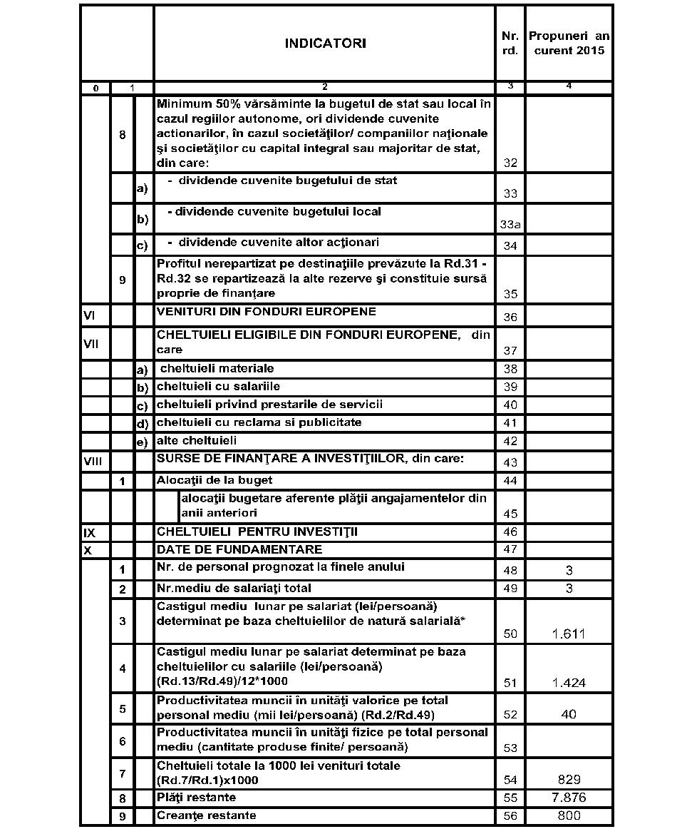 Având în vedere prevederile art. 4 alin. (1) lit. b) din Ordonanţa Guvernului nr. 26/2013 privind întărirea disciplinei financiare la nivelul unor operatori economici la care statul sau unităţile administrativ-teritoriale sunt acţionari unici ori majoritari sau deţin direct ori indirect o participaţie majoritară, aprobată cu completări prin Legea nr. 47/2014, cu modificările şi completările ulterioare,în temeiul prevederilor art. 9 alin. (6) din Hotărârea Guvernului nr. 47/2013 privind organizarea şi funcţionarea Ministerului Economiei, Comerţului şi Turismului, cu modificările şi completările ulterioare, ale art. 10 alin. (4) din Hotărârea Guvernului nr. 34/2009 privind organizarea şi funcţionarea Ministerului Finanţelor Publice, cu modificările şi completările ulterioare, şi ale art. 18 alin. (3) din Hotărârea Guvernului nr. 344/2014 privind organizarea şi funcţionarea Ministerului Muncii, Familiei, Protecţiei Sociale şi Persoanelor Vârstnice, precum şi pentru modificarea unor acte normative, cu modificările şi completările ulterioare,ministrul economiei, comerţului şi turismului, ministrul finanţelor publice şi ministrul muncii, familiei, protecţiei sociale şi persoanelor vârstnice emit următorul ordin: Articolul 1Se aprobă bugetul de venituri şi cheltuieli pe anul 2015 pentru Societatea CERTEJ - S.A. - filiala Companiei Naţionale a Cuprului, Aurului şi Fierului „MINVEST“ - S.A. Deva, prevăzut în anexa care face parte integrantă din prezentul ordin. Articolul 2Prezentul ordin se publică în Monitorul Oficial al României, Partea I. Ministrul economiei, comerţului şi turismului, Mihai Tudose p. Ministrul finanţelor publice, Enache Jiru, secretar de stat Ministrul muncii, familiei, protecţiei sociale şi persoanelor vârstnice, Rovana Plumb ANEXĂ*)*) Anexa este reprodusă în facsimil.MINISTERUL ECONOMIEI, COMERŢULUI ŞI TURISMULUI Compania Naţională a Cuprului, Aurului şi Fierului „MINVEST“ - S.A. Deva Filiala: Societatea CERTEJ - S.A. Str. Principală nr. 89, Certeju de Sus, judeţul Hunedoara Cod unic de înregistrare: RO 14271549 BUGETUL DE VENITURI ŞI CHELTUIELI pe anul 2015