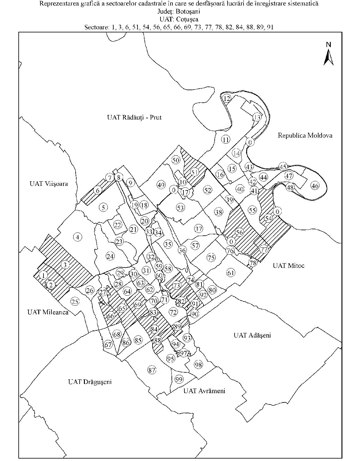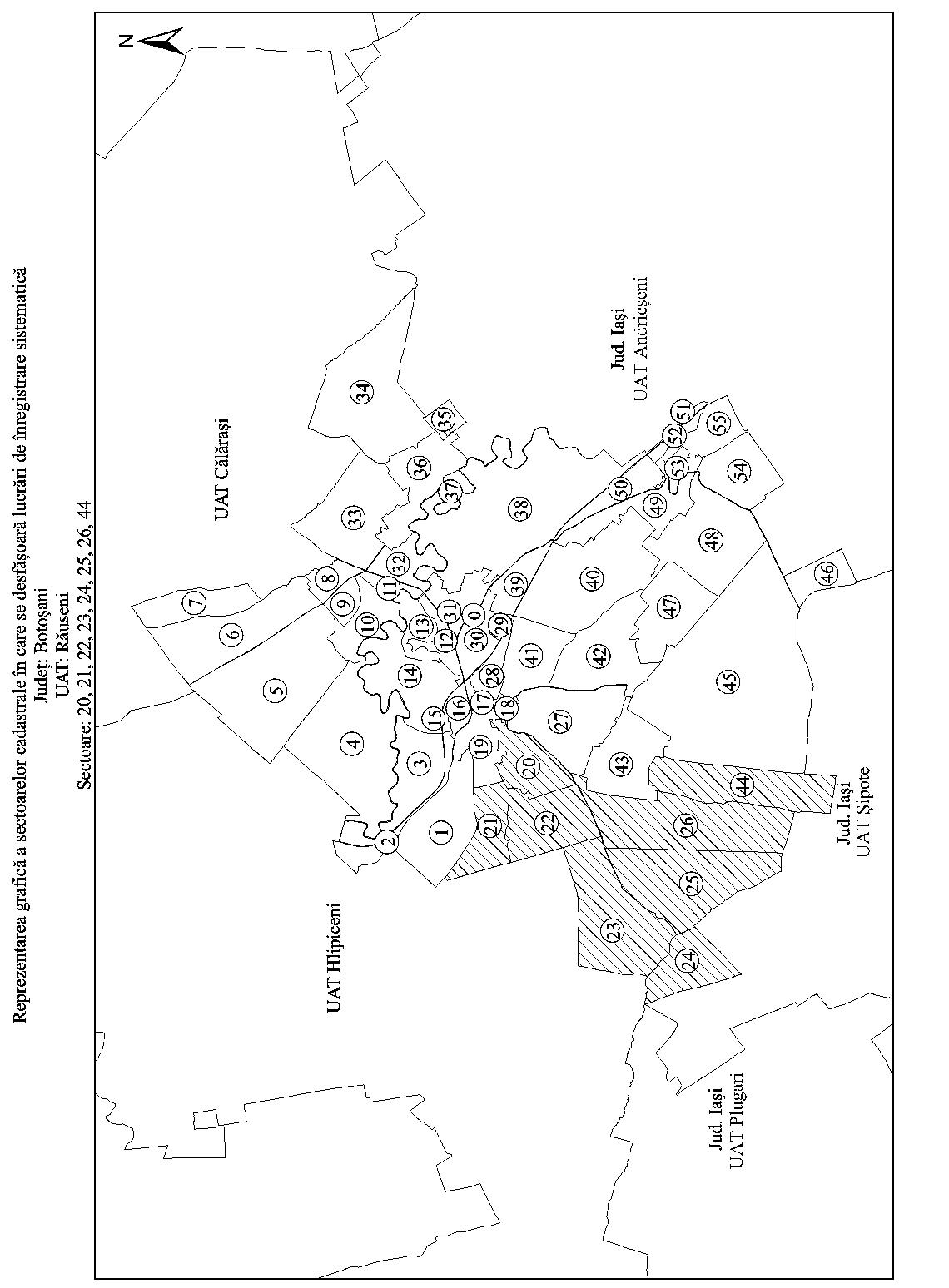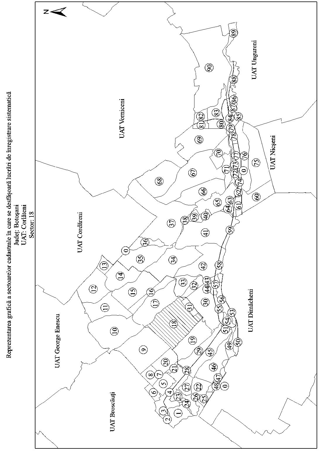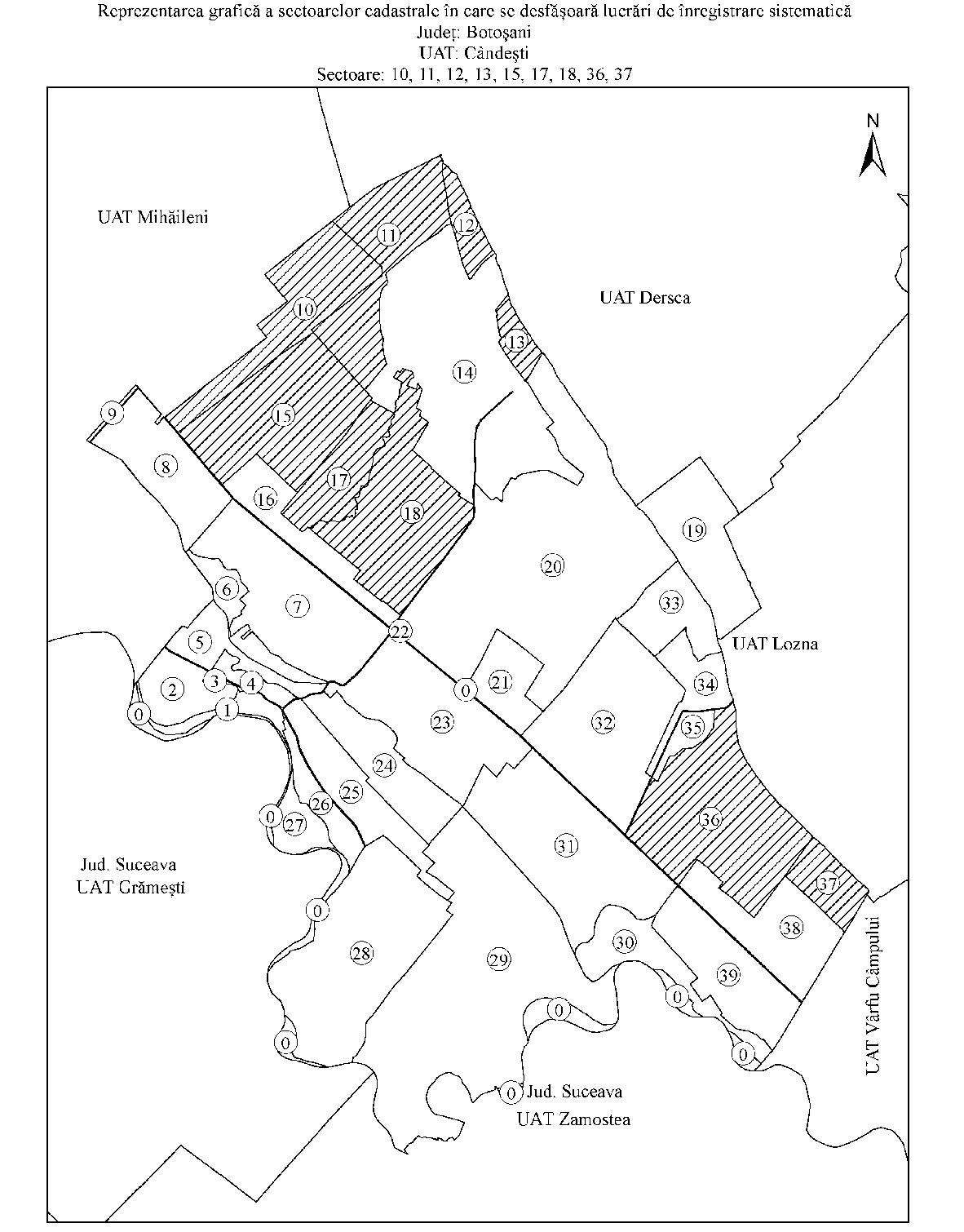Având în vedere prevederile art. 11 alin. (1) din Legea cadastrului şi a publicităţii imobiliare nr. 7/1996, republicată, cu modificările şi completările ulterioare,în temeiul art. 3 alin. (13) din Legea cadastrului şi a publicităţii imobiliare nr. 7/1996, republicată, cu modificările şi completările ulterioare,directorul general al Agenţiei Naţionale de Cadastru şi Publicitate Imobiliară emite prezentul ordin. Articolul 1Se aprobă începerea lucrărilor de înregistrare sistematică a imobilelor, pe sectoare cadastrale, situate pe teritoriul a 18 unităţi administrativ-teritoriale din judeţul Botoşani, după cum urmează: a)unitatea administrativ-teritorială Cândeşti - sectoarele cadastrale nr. 10, 11, 12, 13, 15, 17, 18, 36 şi 37; b)unitatea administrativ-teritorială Conceşti - sectoarele cadastrale nr. 22 şi 27; c)unitatea administrativ-teritorială Corlăteni - sectorul cadastral nr. 18; d)unitatea administrativ-teritorială Coţuşca - sectoarele cadastrale nr. 1, 3, 6, 51, 54, 56, 65, 66, 69, 73, 77, 78, 82, 84, 88, 89 şi 91; e)unitatea administrativ-teritorială Cristineşti - sectoarele cadastrale nr. 16, 17 şi 19; f)unitatea administrativ-teritorială Curteşti - sectoarele cadastrale nr. 44 şi 45; g)unitatea administrativ-teritorială Frumuşica - sectoarele cadastrale nr. 60, 61 şi 79; h)unitatea administrativ-teritorială Hilişeu-Horia - sectoarele cadastrale nr. 24, 25, 26 şi 28; i)unitatea administrativ-teritorială Ibăneşti - sectoarele cadastrale nr. 15 şi 44; j)unitatea administrativ-teritorială Lozna - sectoarele cadastrale nr. 1, 2, 3 şi 4; k)unitatea administrativ-teritorială Păltiniş - sectoarele cadastrale nr. 42, 46, 53 şi 54; l)unitatea administrativ-teritorială Răchiţi - sectoarele cadastrale nr. 8, 9,10 şi 11; m)unitatea administrativ-teritorială Rădăuţi-Prut - sectoarele cadastrale nr. 28, 34, 36, 37 şi 59; n)unitatea administrativ-teritorială Răuseni - sectoarele cadastrale nr. 20, 21, 22, 23, 24, 25, 26 şi 44; o)unitatea administrativ-teritorială Roma - sectoarele cadastrale nr. 1, 2, 3, 11 şi 24; p)unitatea administrativ-teritorială Todireni - sectoarele cadastrale nr. 55, 56 şi 63; q)unitatea administrativ-teritorială Vârfu Câmpului - sectoarele cadastrale nr. 29 şi 30; r)unitatea administrativ-teritorială Viişoara - sectoarele cadastrale nr. 40 şi 42. Articolul 2Reprezentarea grafică a sectoarelor cadastrale în care se desfăşoară lucrările de înregistrare sistematică a imobilelor este prevăzută în anexele nr. 1-18 la prezentul ordin. Articolul 3Anexele nr. 1-18*) fac parte integrantă din prezentul ordin.*) Anexele nr. 1-18 sunt reproduse în facsimil. Articolul 4Prezentul ordin se publică în Monitorul Oficial al României, Partea I. Directorul general al Agenţiei Naţionale de Cadastru şi Publicitate Imobiliară, Radu-Codruţ Ştefănescu ANEXA Nr. 1