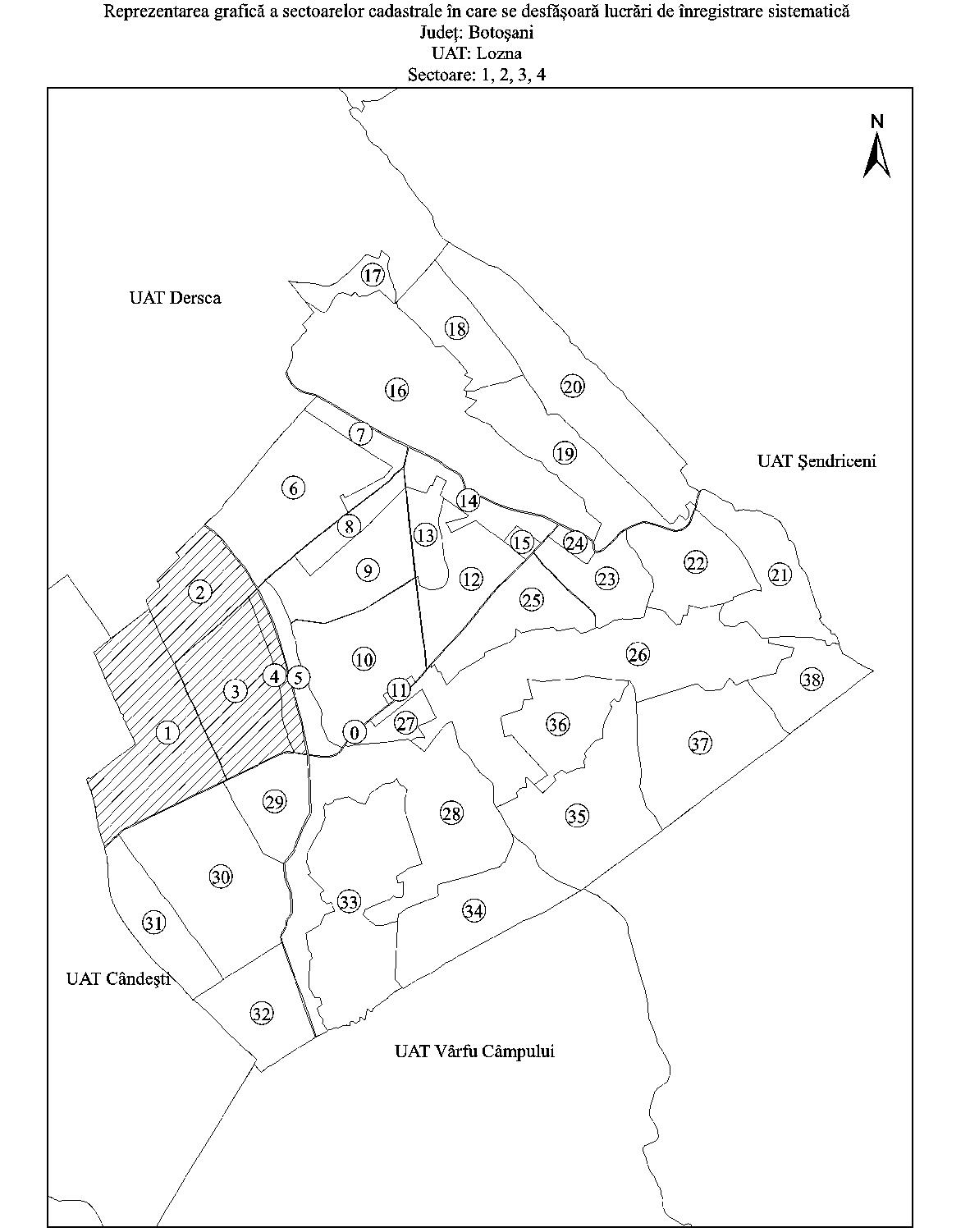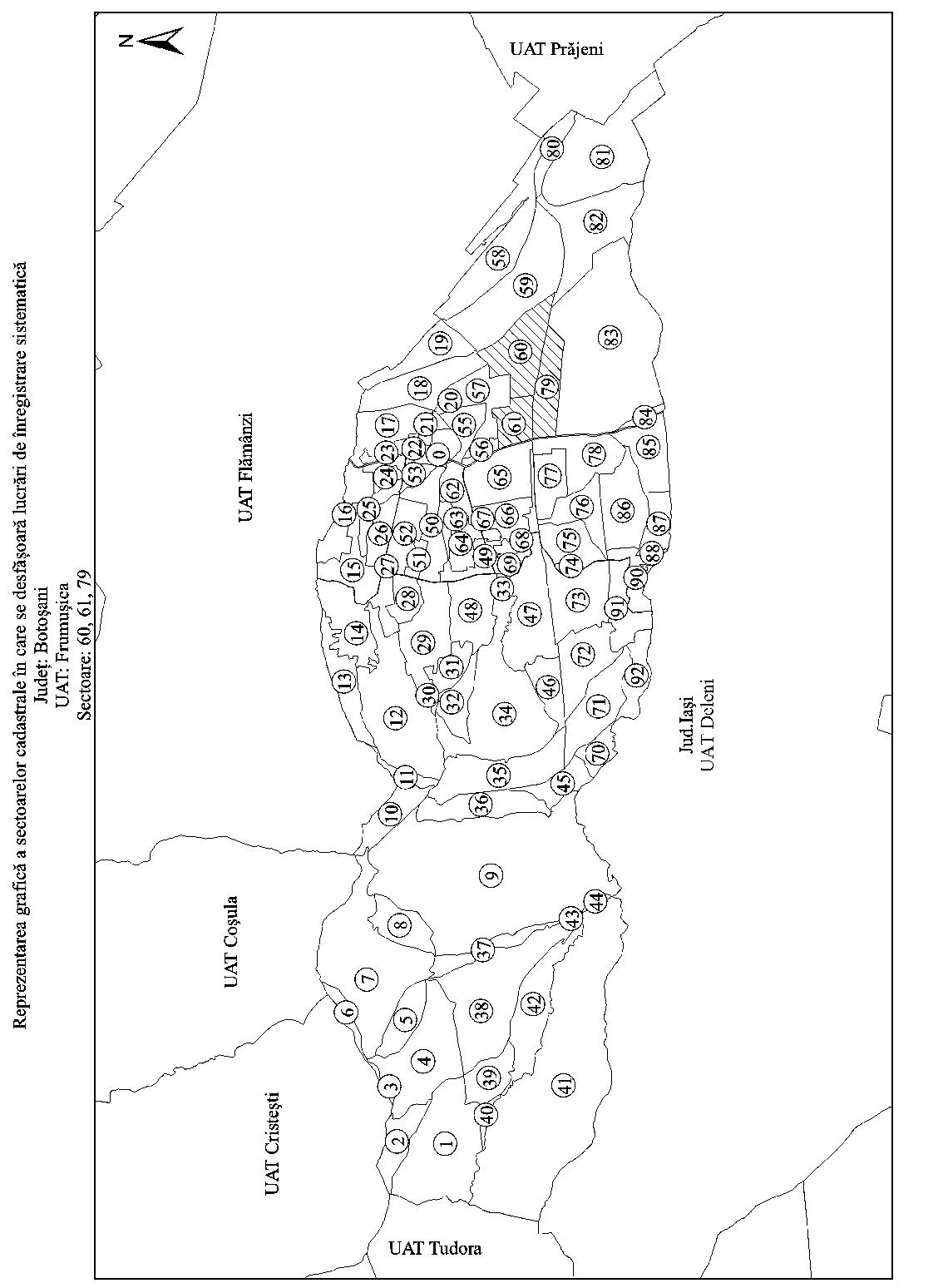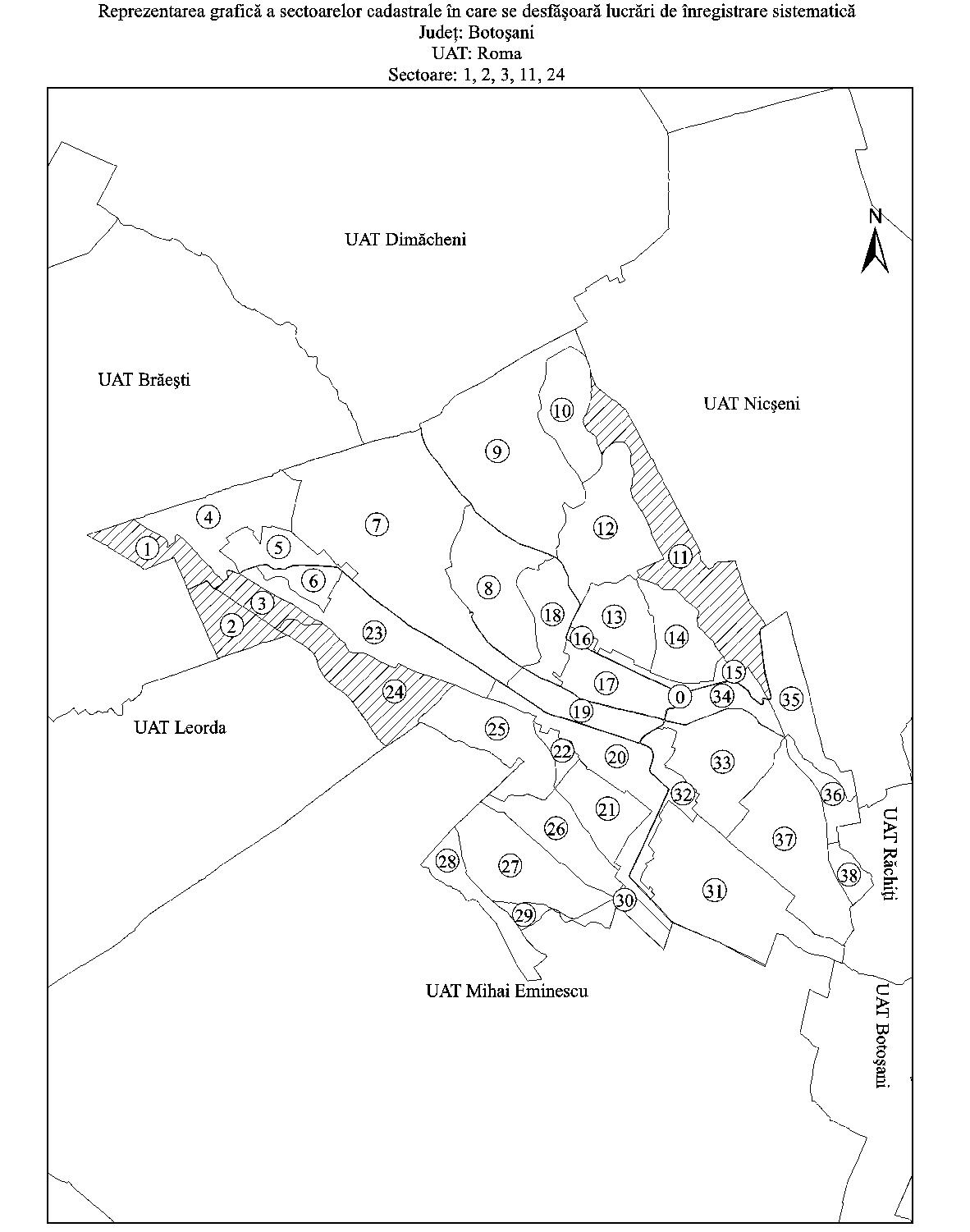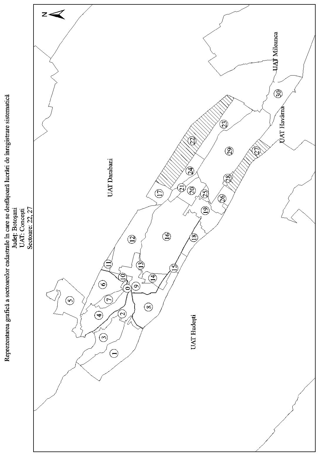 Având în vedere prevederile art. 11 alin. (1) din Legea cadastrului şi a publicităţii imobiliare nr. 7/1996, republicată, cu modificările şi completările ulterioare,în temeiul art. 3 alin. (13) din Legea cadastrului şi a publicităţii imobiliare nr. 7/1996, republicată, cu modificările şi completările ulterioare,directorul general al Agenţiei Naţionale de Cadastru şi Publicitate Imobiliară emite prezentul ordin. Articolul 1Se aprobă începerea lucrărilor de înregistrare sistematică a imobilelor, pe sectoare cadastrale, situate pe teritoriul a 18 unităţi administrativ-teritoriale din judeţul Botoşani, după cum urmează: a)unitatea administrativ-teritorială Cândeşti - sectoarele cadastrale nr. 10, 11, 12, 13, 15, 17, 18, 36 şi 37; b)unitatea administrativ-teritorială Conceşti - sectoarele cadastrale nr. 22 şi 27; c)unitatea administrativ-teritorială Corlăteni - sectorul cadastral nr. 18; d)unitatea administrativ-teritorială Coţuşca - sectoarele cadastrale nr. 1, 3, 6, 51, 54, 56, 65, 66, 69, 73, 77, 78, 82, 84, 88, 89 şi 91; e)unitatea administrativ-teritorială Cristineşti - sectoarele cadastrale nr. 16, 17 şi 19; f)unitatea administrativ-teritorială Curteşti - sectoarele cadastrale nr. 44 şi 45; g)unitatea administrativ-teritorială Frumuşica - sectoarele cadastrale nr. 60, 61 şi 79; h)unitatea administrativ-teritorială Hilişeu-Horia - sectoarele cadastrale nr. 24, 25, 26 şi 28; i)unitatea administrativ-teritorială Ibăneşti - sectoarele cadastrale nr. 15 şi 44; j)unitatea administrativ-teritorială Lozna - sectoarele cadastrale nr. 1, 2, 3 şi 4; k)unitatea administrativ-teritorială Păltiniş - sectoarele cadastrale nr. 42, 46, 53 şi 54; l)unitatea administrativ-teritorială Răchiţi - sectoarele cadastrale nr. 8, 9,10 şi 11; m)unitatea administrativ-teritorială Rădăuţi-Prut - sectoarele cadastrale nr. 28, 34, 36, 37 şi 59; n)unitatea administrativ-teritorială Răuseni - sectoarele cadastrale nr. 20, 21, 22, 23, 24, 25, 26 şi 44; o)unitatea administrativ-teritorială Roma - sectoarele cadastrale nr. 1, 2, 3, 11 şi 24; p)unitatea administrativ-teritorială Todireni - sectoarele cadastrale nr. 55, 56 şi 63; q)unitatea administrativ-teritorială Vârfu Câmpului - sectoarele cadastrale nr. 29 şi 30; r)unitatea administrativ-teritorială Viişoara - sectoarele cadastrale nr. 40 şi 42. Articolul 2Reprezentarea grafică a sectoarelor cadastrale în care se desfăşoară lucrările de înregistrare sistematică a imobilelor este prevăzută în anexele nr. 1-18 la prezentul ordin. Articolul 3Anexele nr. 1-18*) fac parte integrantă din prezentul ordin.*) Anexele nr. 1-18 sunt reproduse în facsimil. Articolul 4Prezentul ordin se publică în Monitorul Oficial al României, Partea I. Directorul general al Agenţiei Naţionale de Cadastru şi Publicitate Imobiliară, Radu-Codruţ Ştefănescu ANEXA Nr. 1
