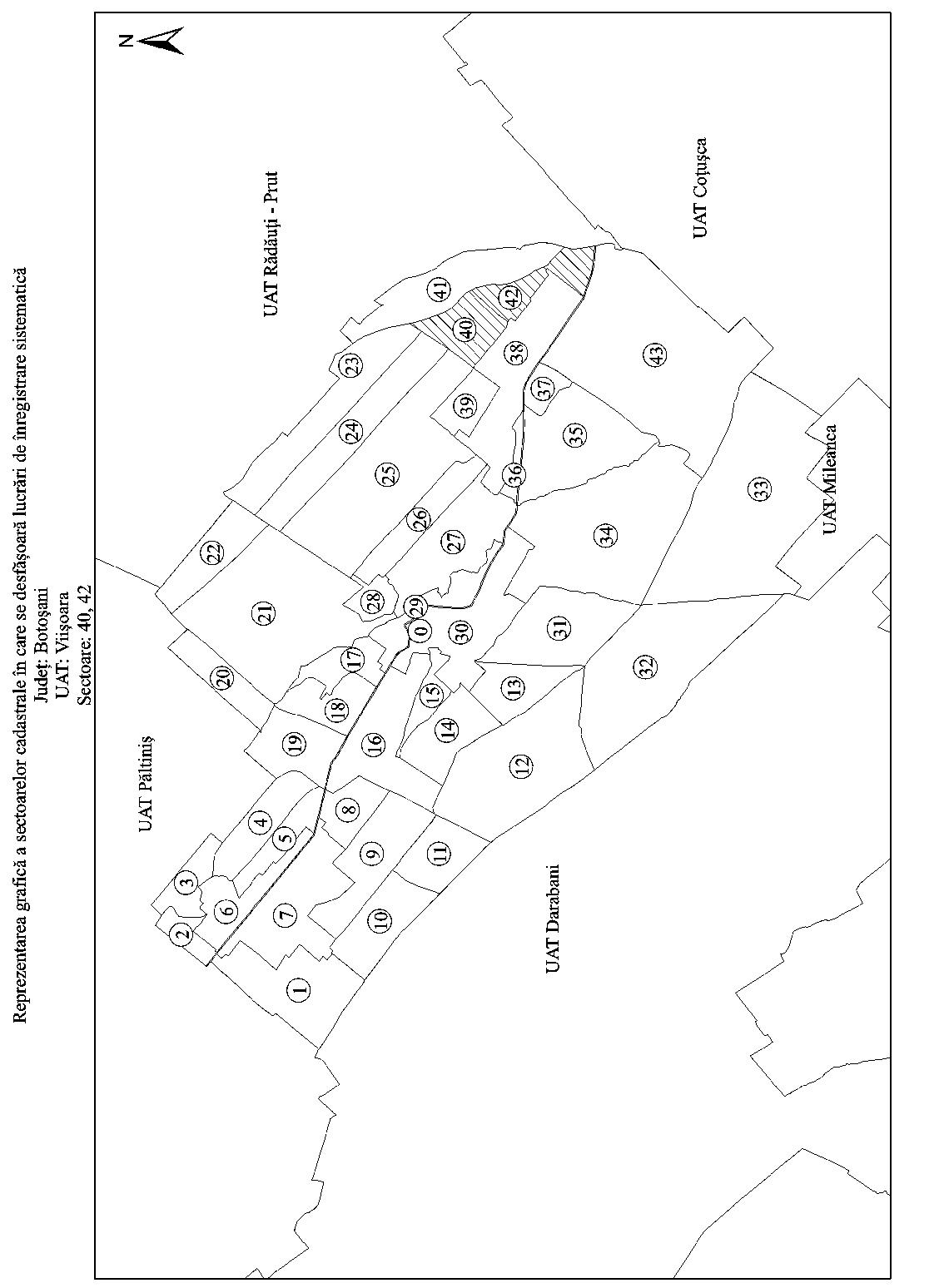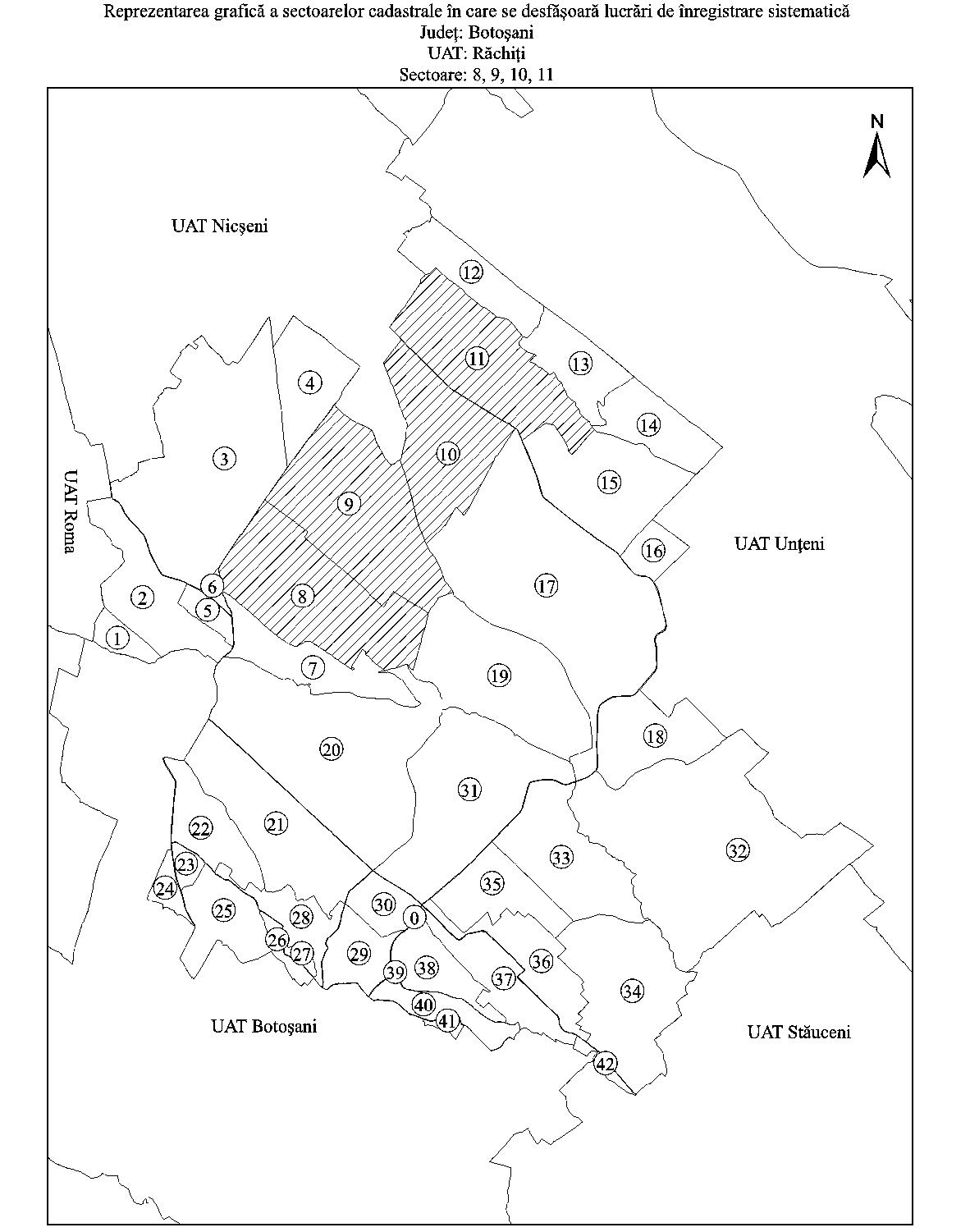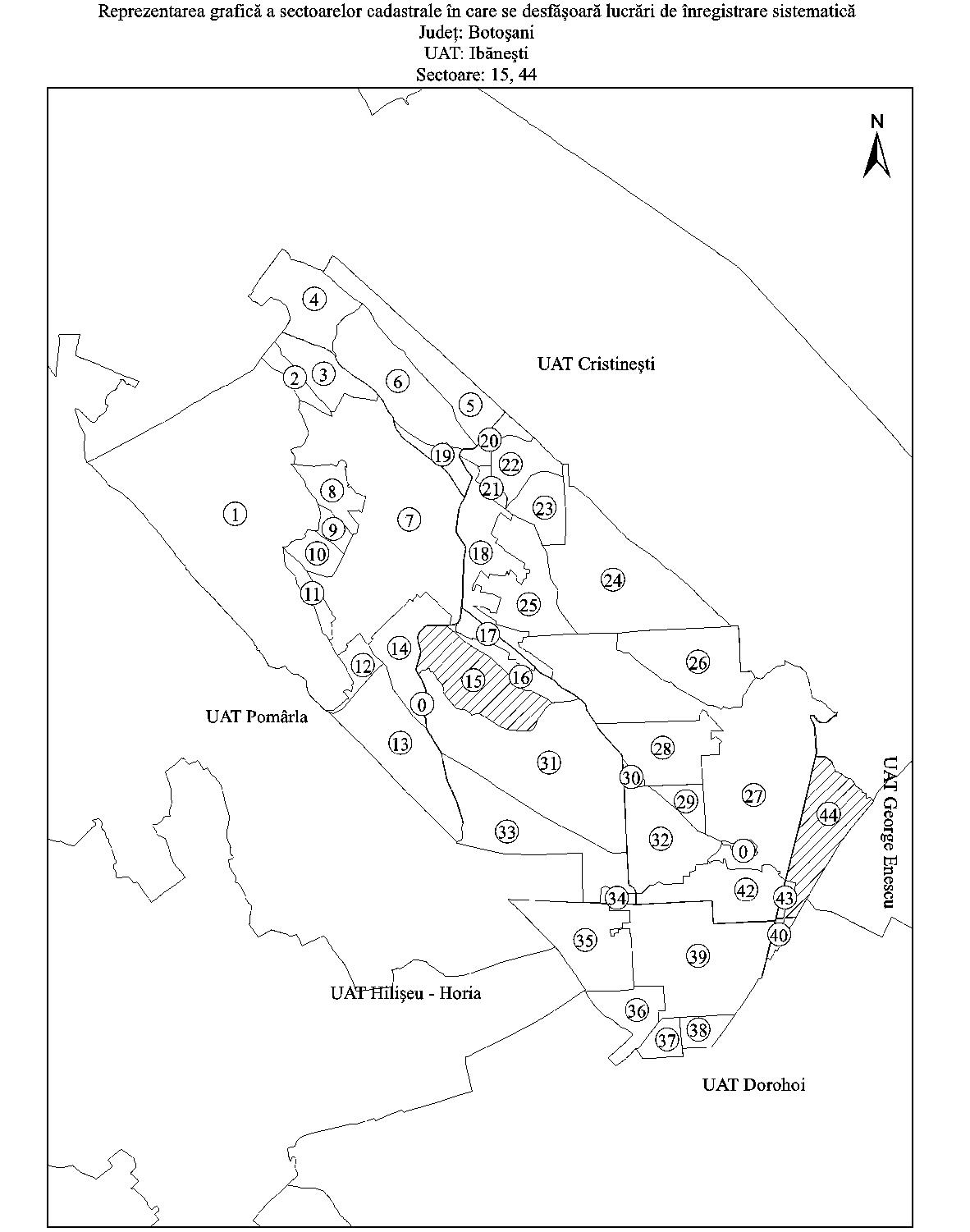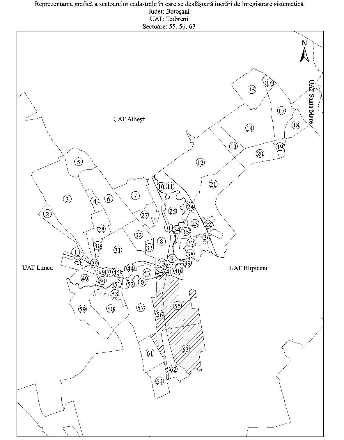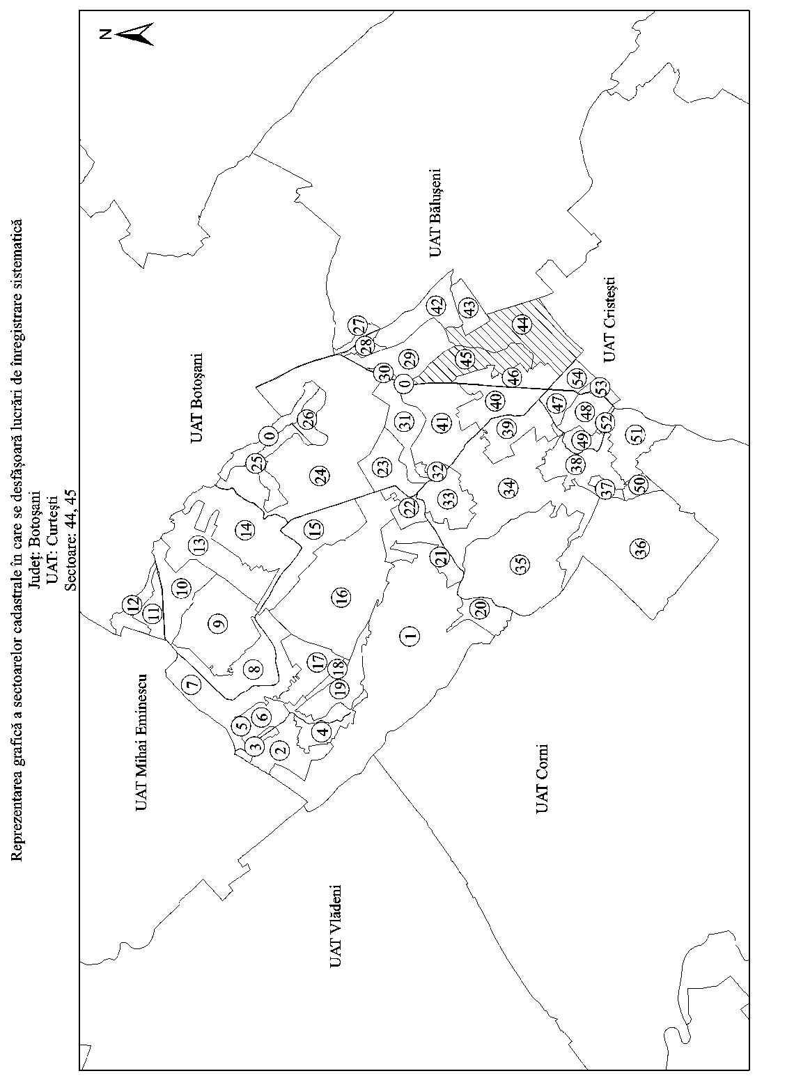 Având în vedere prevederile art. 11 alin. (1) din Legea cadastrului şi a publicităţii imobiliare nr. 7/1996, republicată, cu modificările şi completările ulterioare,în temeiul art. 3 alin. (13) din Legea cadastrului şi a publicităţii imobiliare nr. 7/1996, republicată, cu modificările şi completările ulterioare,directorul general al Agenţiei Naţionale de Cadastru şi Publicitate Imobiliară emite prezentul ordin. Articolul 1Se aprobă începerea lucrărilor de înregistrare sistematică a imobilelor, pe sectoare cadastrale, situate pe teritoriul a 18 unităţi administrativ-teritoriale din judeţul Botoşani, după cum urmează: a)unitatea administrativ-teritorială Cândeşti - sectoarele cadastrale nr. 10, 11, 12, 13, 15, 17, 18, 36 şi 37; b)unitatea administrativ-teritorială Conceşti - sectoarele cadastrale nr. 22 şi 27; c)unitatea administrativ-teritorială Corlăteni - sectorul cadastral nr. 18; d)unitatea administrativ-teritorială Coţuşca - sectoarele cadastrale nr. 1, 3, 6, 51, 54, 56, 65, 66, 69, 73, 77, 78, 82, 84, 88, 89 şi 91; e)unitatea administrativ-teritorială Cristineşti - sectoarele cadastrale nr. 16, 17 şi 19; f)unitatea administrativ-teritorială Curteşti - sectoarele cadastrale nr. 44 şi 45; g)unitatea administrativ-teritorială Frumuşica - sectoarele cadastrale nr. 60, 61 şi 79; h)unitatea administrativ-teritorială Hilişeu-Horia - sectoarele cadastrale nr. 24, 25, 26 şi 28; i)unitatea administrativ-teritorială Ibăneşti - sectoarele cadastrale nr. 15 şi 44; j)unitatea administrativ-teritorială Lozna - sectoarele cadastrale nr. 1, 2, 3 şi 4; k)unitatea administrativ-teritorială Păltiniş - sectoarele cadastrale nr. 42, 46, 53 şi 54; l)unitatea administrativ-teritorială Răchiţi - sectoarele cadastrale nr. 8, 9,10 şi 11; m)unitatea administrativ-teritorială Rădăuţi-Prut - sectoarele cadastrale nr. 28, 34, 36, 37 şi 59; n)unitatea administrativ-teritorială Răuseni - sectoarele cadastrale nr. 20, 21, 22, 23, 24, 25, 26 şi 44; o)unitatea administrativ-teritorială Roma - sectoarele cadastrale nr. 1, 2, 3, 11 şi 24; p)unitatea administrativ-teritorială Todireni - sectoarele cadastrale nr. 55, 56 şi 63; q)unitatea administrativ-teritorială Vârfu Câmpului - sectoarele cadastrale nr. 29 şi 30; r)unitatea administrativ-teritorială Viişoara - sectoarele cadastrale nr. 40 şi 42. Articolul 2Reprezentarea grafică a sectoarelor cadastrale în care se desfăşoară lucrările de înregistrare sistematică a imobilelor este prevăzută în anexele nr. 1-18 la prezentul ordin. Articolul 3Anexele nr. 1-18*) fac parte integrantă din prezentul ordin.*) Anexele nr. 1-18 sunt reproduse în facsimil. Articolul 4Prezentul ordin se publică în Monitorul Oficial al României, Partea I. Directorul general al Agenţiei Naţionale de Cadastru şi Publicitate Imobiliară, Radu-Codruţ Ştefănescu ANEXA Nr. 1
