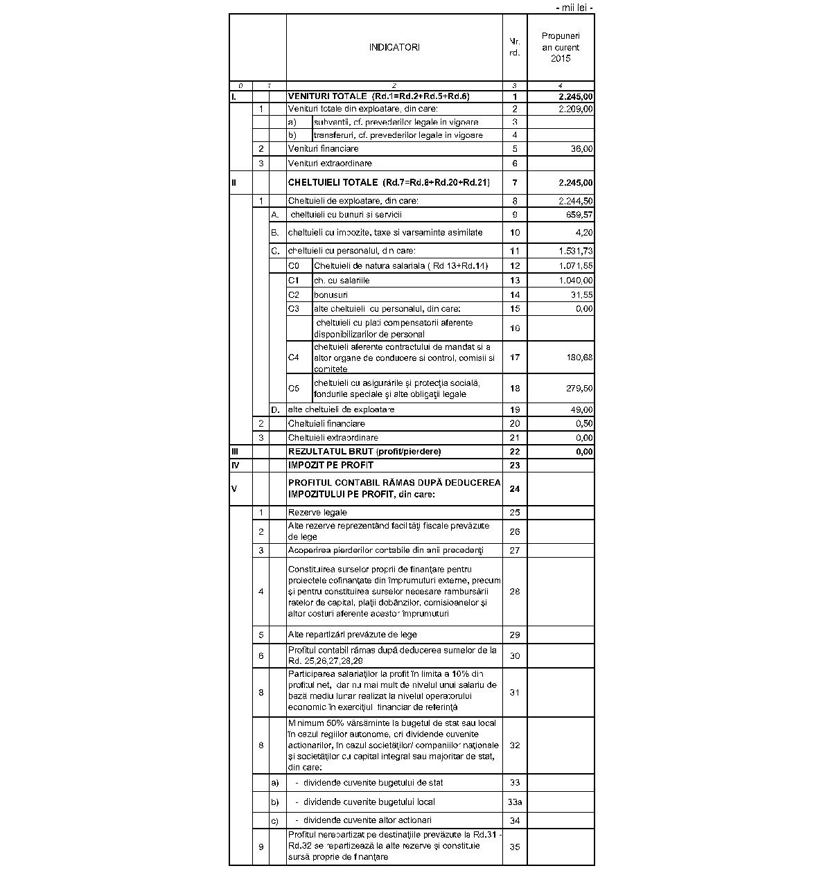 În temeiul art. 4 alin. (1) lit. b) din Ordonanţa Guvernului nr. 26/2013 privind întărirea disciplinei financiare la nivelul unor operatori economici la care statul sau unităţile administrativ-teritoriale sunt acţionari unici ori majoritari sau deţin direct ori indirect o participaţie majoritară, aprobată cu completări prin Legea nr. 47/2014 , cu modificările şi completările ulterioare, al art. 5 alin. (4) din Hotărârea Guvernului nr. 21/2015 privind organizarea şi funcţionarea Ministerului Transporturilor, cu modificările ulterioare, al art. 10 alin. (4) din Hotărârea Guvernului nr. 34/2009 privind organizarea şi funcţionarea Ministerului Finanţelor Publice, cu modificările şi completările ulterioare, şi al art. 18 alin. (3) din Hotărârea Guvernului nr. 344/2014 privind organizarea şi funcţionarea Ministerului Muncii, Familiei, Protecţiei Sociale şi Persoanelor Vârstnice, precum şi pentru modificarea unor acte normative, cu modificările şi completările ulterioare,ministrul transporturilor, ministrul finanţelor publice şi ministrul muncii, familiei, protecţiei sociale şi persoanelor vârstnice emit următorul ordin: Articolul 1Se aprobă bugetul de venituri şi cheltuieli pe anul 2015 al Societăţii Tipografice Filaret - S.A., filiala Companiei Naţionale de Căi Ferate „C.F.R.“ - S.A., prevăzut în anexa care face parte integrantă din prezentul ordin. Articolul 2Prezentul ordin se publică în Monitorul Oficial al României, Partea I. Articolul 3Societatea Tipografică Filaret - S.A. va duce la îndeplinire prezentul ordin. Ministrul transporturilor, Iulian-Ghiocel Matache Ministrul finanţelor publice, Eugen Orlando Teodorovici Ministrul muncii, familiei, protecţiei sociale şi persoanelor vârstnice, Rovana Plumb ANEXĂ*)__*) Anexa este reprodusă în facsimil.MINISTERUL TRANSPORTURILOR Societatea Tipografică Filaret - S.A. Str. Piaţa Gării de Nord nr. 1-3, bl. corp C, et. 4 Registrul comerţului nr. J40/2564/2002 Codul unic de înregistrare: RO 14547106 BUGETUL DE VENITURI ŞI CHELTUIELI pe anul 2015