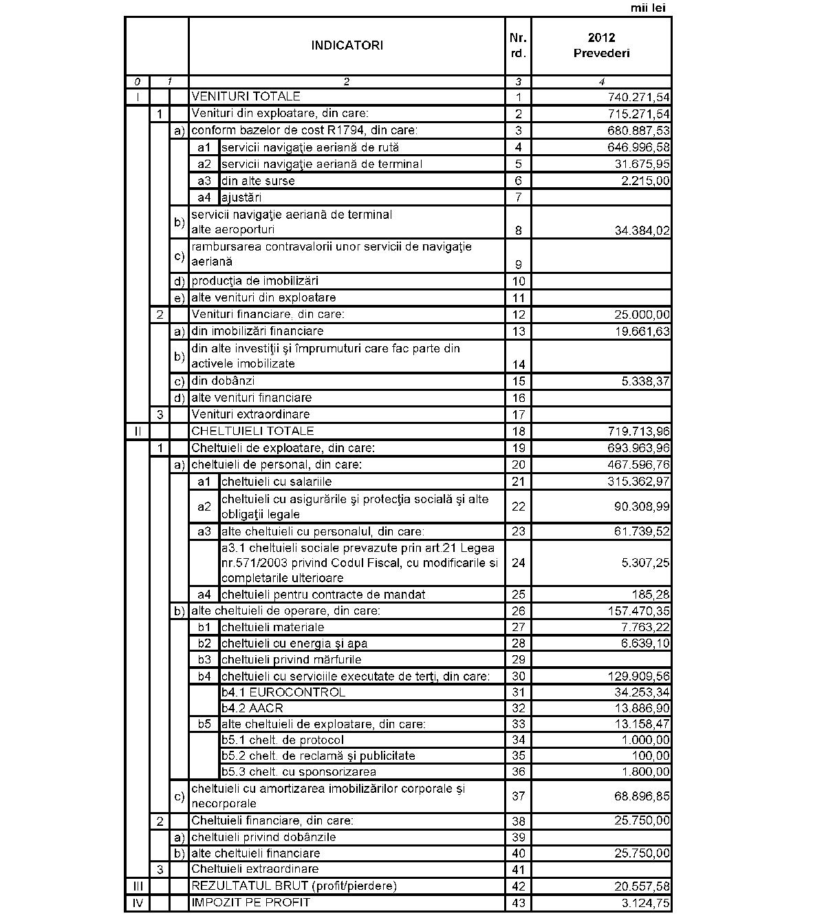 În temeiul prevederilor art. 4 alin. (5) din Ordonanţa Guvernului nr. 46/1998 pentru stabilirea unor măsuri în vederea îndeplinirii obligaţiilor asumate de România prin aderarea la Convenţia internaţională EUROCONTROL privind cooperarea pentru securitatea navigaţiei aeriene şi la Acordul multilateral privind tarifele de rută aeriană, precum şi a unor obligaţii care rezultă pentru România din regulamentele adoptate la nivelul Uniunii Europene în domeniul serviciilor de navigaţie aeriană, republicată, cu modificările ulterioare,în temeiul art. 5 alin. (4) din Hotărârea Guvernului nr. 76/2009 privind organizarea şi funcţionarea Ministerului Transporturilor şi Infrastructurii, cu modificările şi completările ulterioare, al art. 10 alin. (4) din Hotărârea Guvernului nr. 34/2009 privind organizarea şi funcţionarea Ministerului Finanţelor Publice, cu modificările şi completările ulterioare,ministrul transporturilor şi infrastructurii şi viceprim-ministrul, ministrul finanţelor publice, emit următorul ordin: Articolul 1Se aprobă bugetul de venituri şi cheltuieli pe anul 2012 al Regiei Autonome „Administraţia Română a Serviciilor de Trafic Aerian - ROMATSA“, prevăzut în anexa nr. 1, care face parte integrantă din prezentul ordin. Articolul 2Se aprobă situaţia centralizată privind veniturile şi cheltuielile din bazele de cost pe anul 2012 ale Regiei Autonome „Administraţia Română a Serviciilor de Trafic Aerian - ROMATSA“, prevăzută în anexa nr. 2, care face parte integrantă din prezentul ordin. Articolul 3(1) Nivelul cheltuielilor totale aferente veniturilor totale prevăzute în bugetul de venituri şi cheltuieli reprezintă limite maxime şi nu poate fi depăşit decât în cazuri justificate, prin ordin comun al ministrului transporturilor şi infrastructurii şi al ministrului finanţelor publice.(2) În execuţia bugetului de venituri şi cheltuieli se va urmări încadrarea în cheltuielile totale, a căror structură este cea aprobată prin bazele de cost.(3) În cazul în care în execuţie se înregistrează depăşiri sau nerealizări ale veniturilor totale aprobate, regia poate efectua cheltuieli proporţional cu gradul de realizare a veniturilor totale. Articolul 4Prezentul ordin se publică în Monitorul Oficial al României, Partea I. Articolul 5Regia Autonomă „Administraţia Română a Serviciilor de Trafic Aerian - ROMATSA“ va duce la îndeplinire prezentul ordin. p. Ministrul transporturilor şi infrastructurii, Răducu Valentin Preda, secretar de stat Viceprim-ministru, ministrul finanţelor publice, Florin Georgescu ANEXA Nr. 1*)*) Anexa nr. 1 este reprodusă în facsimil.MINISTERUL TRANSPORTURILOR ŞI INFRASTRUCTURII Regia Autonomă „Administraţia Română a Serviciilor de Trafic Aerian - ROMATSA“ Bucureşti, sectorul 1, str. Ion Ionescu de la Brad nr. 10 Cod unic de înregistrare: R 1589932 BUGETUL DE VENITURI ŞI CHELTUIELI pe anul 2012 ANEXA Nr. 2*)*) Anexa nr. 2 este reprodusă în facsimil.Regia Autonomă „Administraţia Română a Serviciilor de Trafic Aerian - ROMATSA“ SITUAŢIE CENTRALIZATĂ privind veniturile şi cheltuielile din bazele de cost pe anul 2012