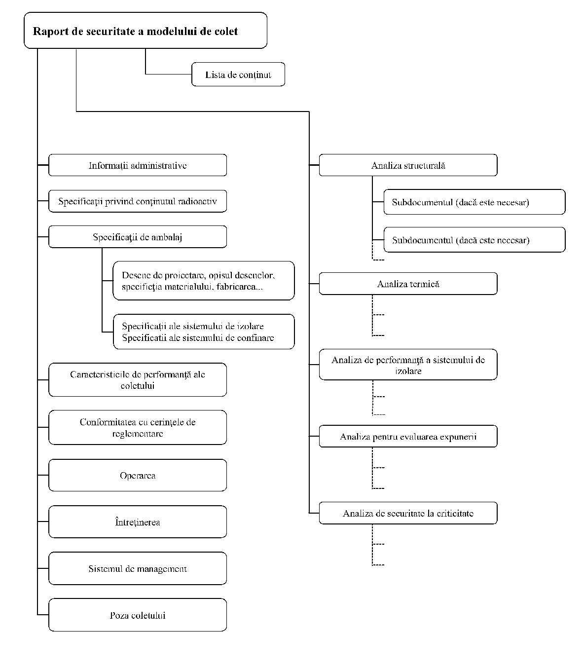 Luând în considerare Referatul de aprobare al Direcţiei ciclul combustibilului nuclear nr. 23.885 din 5.10.2017,în conformitate cu prevederile art. 7 alin. (7) din Regulamentul de organizare şi funcţionare a Comisiei Naţionale pentru Controlul Activităţilor Nucleare, aprobat prin Hotărârea Guvernului nr. 1.627/2003, cu modificările şi completările ulterioare,având în vedere art. 5 din Legea nr. 111/1996 privind desfăşurarea în siguranţă, reglementarea, autorizarea şi controlul activităţilor nucleare, republicată, cu modificările şi completările ulterioare, preşedintele Comisiei Naţionale pentru Controlul Activităţilor Nucleare emite următorul ordin: Articolul 1Se aprobă Norma privind elaborarea raportului de securitate a unui model de colet de transport al materialelor radioactive, prevăzută în anexa care face parte integrantă din prezentul ordin. Articolul 2 Prezentul ordin se publică în Monitorul Oficial al României, Partea I.Preşedintele Comisiei Naţionale pentru Controlul Activităţilor Nucleare,Rodin TraicuANEXĂNORMĂ privind elaborarea raportului de securitate a unui model de colet de transport al materialelor radioactive Capitolul IDomeniu de aplicare, scop şi definiţii Articolul 1(1) Prezenta normă detaliază cerinţele de elaborare a raportului de securitate a unui model de colet de transport al materialelor radioactive. (2) Prezenta normă se aplică la elaborarea raportului de securitate pentru următoarele colete de transport al materialelor radioactive: coletul exceptat, coletul industrial IP-1, IP-2, IP-3, coletul tip A, coletul tip B(U), coletul tip B(M), coletul tip C, coletul conţinând materiale fisile, coletul conţinând mai mult de 0,1 kg hexafluorură de uraniu.(3) Proiectantul unui model de colet elaborează orice altă analiză necesară asociată unui anumit tip specific de model.(4) Pentru elaborarea raportului de securitate a unui model de colet se utilizează orice altă metodologie, dacă se dovedeşte că este cel puţin echivalentă cu cea prevăzută în prezenta normă. Articolul 2Prezenta normă are la bază cerinţele din documentul AIEA SSR-6 incluse în reglementările internaţionale ADR (Acordul european referitor la transportul rutier internaţional al mărfurilor periculoase), RID (Regulamentul privind transportul internaţional feroviar al mărfurilor periculoase), IMDG (Codul Internaţional pentru transportul maritim de mărfuri periculoase), ADN (Acordul european privind transportul internaţional al mărfurilor periculoase pe căile navigabile interioare) şi ICAO (Organizaţia Aviaţiei Civile Internaţionale de la Montreal). Matricea cerinţelor din documentul AIEA SSR-6 şi ADR aplicabile pentru fiecare tip de colet este prezentată în anexa nr. 1. Articolul 3(1) Pentru orice model de colet de transport al materialelor radioactive producătorul coletului trebuie să elaboreze un raport de securitate a modelului de colet, care are ca scop demonstrarea conformităţii cu cerinţele naţionale şi internaţionale aplicabile, după caz. (2) Pentru modelele de colete care necesită aprobarea Comisiei Naţionale pentru Controlul Activităţilor Nucleare (CNCAN) raportul de securitate pentru modelul de colet constituie documentaţia tehnică obligatorie, suport la cererea de autorizare.(3) Pentru modelele de colete care nu necesită aprobarea CNCAN, expeditorul trebuie să deţină şi să facă disponibil pentru inspecţia CNCAN raportul de securitate pentru modelul de colet. Articolul 4În scopul aplicării prezentei norme, pe lângă termenii definiţi în Legea nr. 111/1996 privind desfăşurarea în siguranţă, reglementarea, autorizarea şi controlul activităţilor nucleare, republicată, cu modificările şi completările ulterioare, în reglementările internaţionale ADR, RID, IMDG, ADN şi ICAO, se utilizează şi definiţiile din anexa nr. 2 la prezenta normă. Capitolul IIConţinutul raportului de securitate. Prevederi generale Articolul 5Raportul de securitate a modelului de colet este un document controlat şi include o evidenţă a reviziilor şi ediţiilor, precum şi aprobarea acestuia de către proiectantul coletului. Articolul 6În cuprinsul raportului de securitate a modelului de colet se utilizează Sistemul internaţional de unităţi de măsură SI. Articolul 7(1) Raportul de securitate a modelului de colet conţine două părţi principale: partea 1 şi partea a 2-a.(2) Structura raportului de securitate este prezentată schematic în anexa nr. 3.(3) La elaborarea raportului de securitate a modelului de colet se ţine seama atât de instrucţiunile din textul prezentei norme, cât şi de cele din anexele acesteia. Articolul 8Orice document reprezentând partea 1 este un document controlat şi trebuie să fie aprobat pentru distribuţie de către autorul/proprietarul documentului şi de către proiectantul coletului. Articolul 9Orice document reprezentând partea a 2-a este un document controlat şi trebuie să fie aprobat pentru distribuţie de către responsabilul specialist în disciplina tehnică ce se evaluează. Capitolul IIIConţinutul raportului de securitate A. Partea I a raportului de securitate Articolul 10Partea 1 a raportului de securitate a modelului de colet include următoarele informaţii/capitole: 1.1. Lista de conţinut 1.2. Informaţii administrative 1.3. Specificaţii privind conţinutul radioactiv 1.4. Specificaţii de ambalaj 1.5. Caracteristici de performanţă ale coletului 1.6. Conformitatea cu cerinţele de reglementare 1.7. Exploatarea/Operarea 1.8. Întreţinere 1.9. Sistemul de management 1.10. Poza coletului Articolul 11Capitolul 1.1 „Lista de conţinut" este elaborat pentru fiecare parte, partea 1 şi partea a 2-a, a raportului de securitate a modelului de colet şi conţine lista documentelor incluse în fiecare parte, precum şi lista capitolelor fiecărui document inclus, cu menţionarea ediţiei/reviziei. Articolul 12Capitolul 1.2 „In