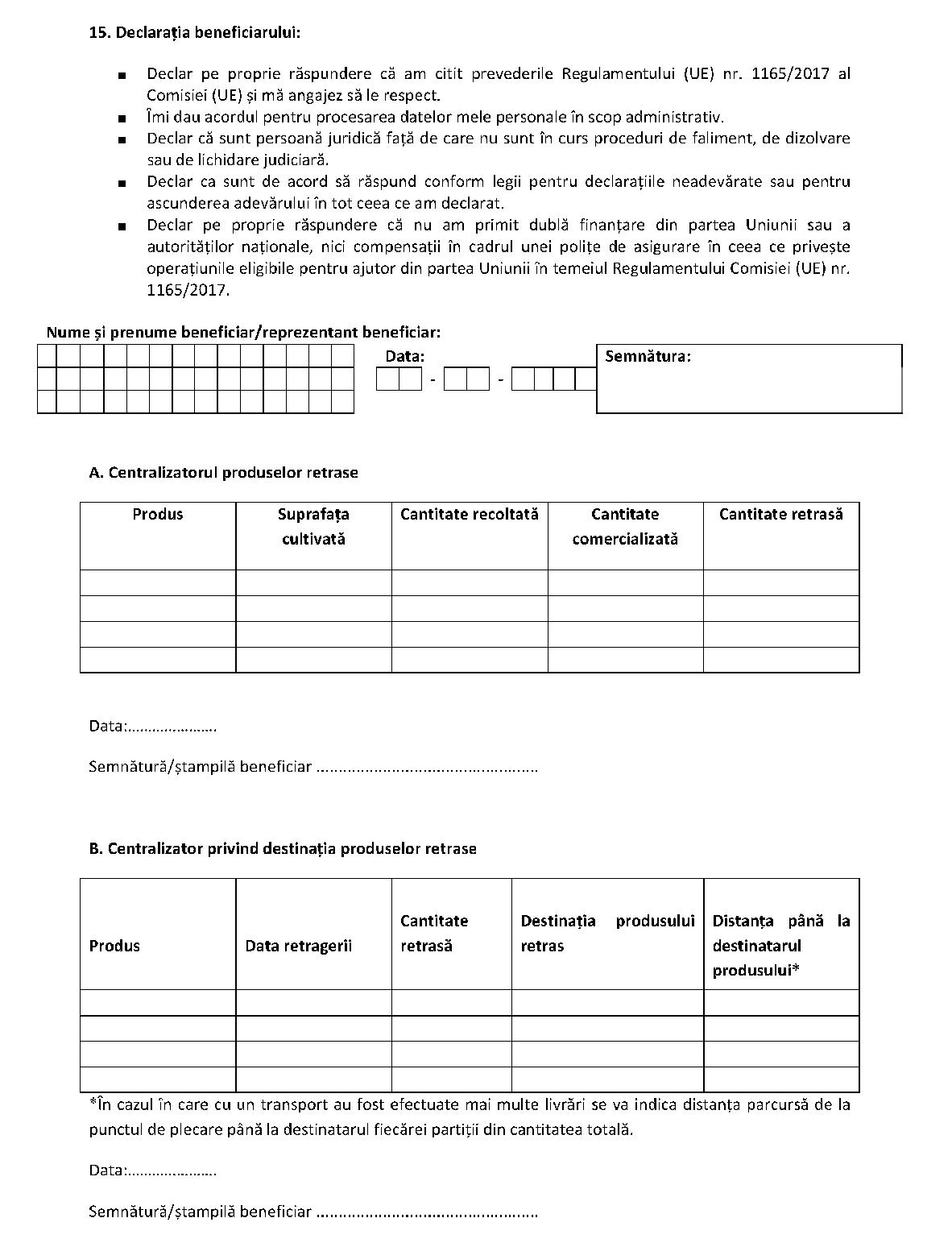 Declar că produsele care urmează să fie retrase respectă standardele de comercializare aplicabile sau cerinţele minime menţionate la art. 15 din Regulamentul de punere în aplicare (UE) 2017/892. Semnătura/Ştampila ........ ........ .............