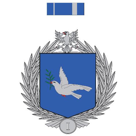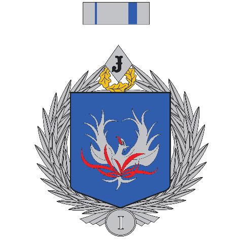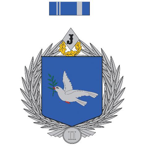 ANEXA Nr. 4 EMBLEMELE DE MERIT „ÎN SLUJBA PĂCII“ PENTRU INSPECTORATUL GENERAL AL JANDARMERIEI ROMÂNE Emblemele de merit „În slujba păcii“, pe 3 clase, pentru Inspectoratul General al Jandarmeriei Române sunt confecţionate din tombac auriu sau argintiu, în funcţie de metalul elementelor din câmp, de formă circulară, cu diametrul de aproximativ 45 mm şi grosimea de 3 mm. Culorile sunt emailate. Emblemele au pe avers un scut albastru, încărcat cu un porumbel argintiu, cu ciocul şi ghearele roşii, aflat în zbor şi având în cioc o ramură de măslin verde, cu 8 frunze, poziţionată în pal. Scutul este flancat şi, totodată, broşează, pe margine, pe două ramuri de lauri argintii dispuse circular şi care se încrucişează, în partea inferioară, în săritoare. Scutul este timbrat de un romb argintiu, ieşind dintr-o cunună compusă din 3 frunze de stejar aurii, purtând în centru litera J stilizată, scrisă cu negru. În partea de jos, sub scut, atingându-i vârful şi broşând peste ramurile de lauri, se află câte un cerc argintiu, cu bordură subţire, de acelaşi metal, în care sunt înscrise, de la caz la caz, cu majuscule şi în relief cu înălţimea de 2 mm, cifrele romane I, II, III. Reversul emblemei este plat şi are scris în relief, cu litere majuscule, înalte de 2 mm, pe două rânduri: EMBLEMA DE MERIT/ÎN SLUJBA PĂCII. De asemenea, emblema are, pe revers, sistem de prindere. Emblema se poartă cu o baretă din rips moarat, albastră, de formă dreptunghiulară, cu dimensiuni de 20 x 10 mm, ce are în partea dreaptă, începând de la 4 mm de margine, o dungă argintie, verticală, lată de 3 mm, iar în partea stângă, începând, de asemenea, de la 4 mm, aceleaşi cifre romane, argintii, fiecare lată de câte 1 mm şi, de la caz la caz, cu distanţa dintre ele, de asemenea, de 1 mm. Materialul baretei este pus peste o placă din inox austenitic, de formă dreptunghiulară, cu grosimea de 2 mm, ce are, pe revers, un sistem de prindere.