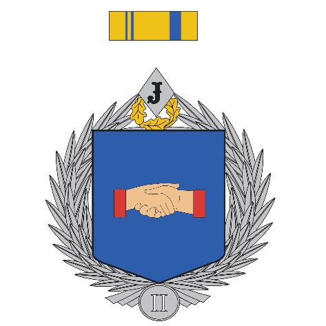 ANEXA Nr. 8EMBLEMELE DE MERIT „PARTENER PENTRU ORDINE ŞI SIGURANŢĂ PUBLICĂ“ PENTRU INSPECTORATUL GENERAL AL JANDARMERIEI ROMÂNE Emblemele de merit „Partener pentru ordine şi siguranţă publică“, pe 3 clase, pentru Inspectoratul General al Jandarmeriei Române sunt confecţionate din tombac auriu sau argintiu, în funcţie de metalul elementelor din câmp, de formă circulară, cu diametrul de aproximativ 45 mm şi grosimea de 3 mm. Culorile sunt emailate. Emblemele au pe avers un scut albastru, încărcat cu o spadă argintie, înzestrată (mânerul şi garda) auriu, poziţionată în pal. Scutul este flancat şi, totodată, broşează, pe margine, pe două ramuri de lauri argintii dispuse circular şi care se încrucişează, în partea inferioară, în săritoare. Scutul este timbrat de un romb argintiu, ieşind dintr-o cunună compusă din 3 frunze de stejar aurii, purtând în centru litera J stilizată, scrisă cu negru. În partea de jos, sub scut atingându-i vârful şi broşând peste ramurile de lauri, se află câte un cerc argintiu, cu bordură subţire, de acelaşi metal, în care sunt înscrise, de la caz la caz, cu majuscule şi în relief cu înălţimea de 2 mm, cifrele romane I, II, III. Reversul emblemei este plat şi are scris în relief, cu litere majuscule, înalte de 2 mm, pe 3 rânduri: EMBLEMA DE MERIT/PARTENER PENTRU ORDINE/ŞI SIGURANŢĂ PUBLICĂ. De asemenea, emblema are, pe revers, sistem de prindere. Emblema se poartă cu o baretă din rips moarat, roşie, de formă dreptunghiulară, cu dimensiuni de 20 x 10 mm, ce are în partea dreaptă, începând de la 4 mm de margine, o dungă argintie, verticală, lată de 3 mm, iar în partea stângă, începând, de asemenea, de la 4 mm, aceleaşi cifre romane, argintii, fiecare lată de câte 1 mm şi, de la caz la caz, cu distanţa dintre ele, de asemenea, de 1 mm. Materialul baretei este pus peste o placă din inox austenitic, de formă dreptunghiulară, cu grosimea de 2 mm, ce are, pe revers, un sistem de prindere.