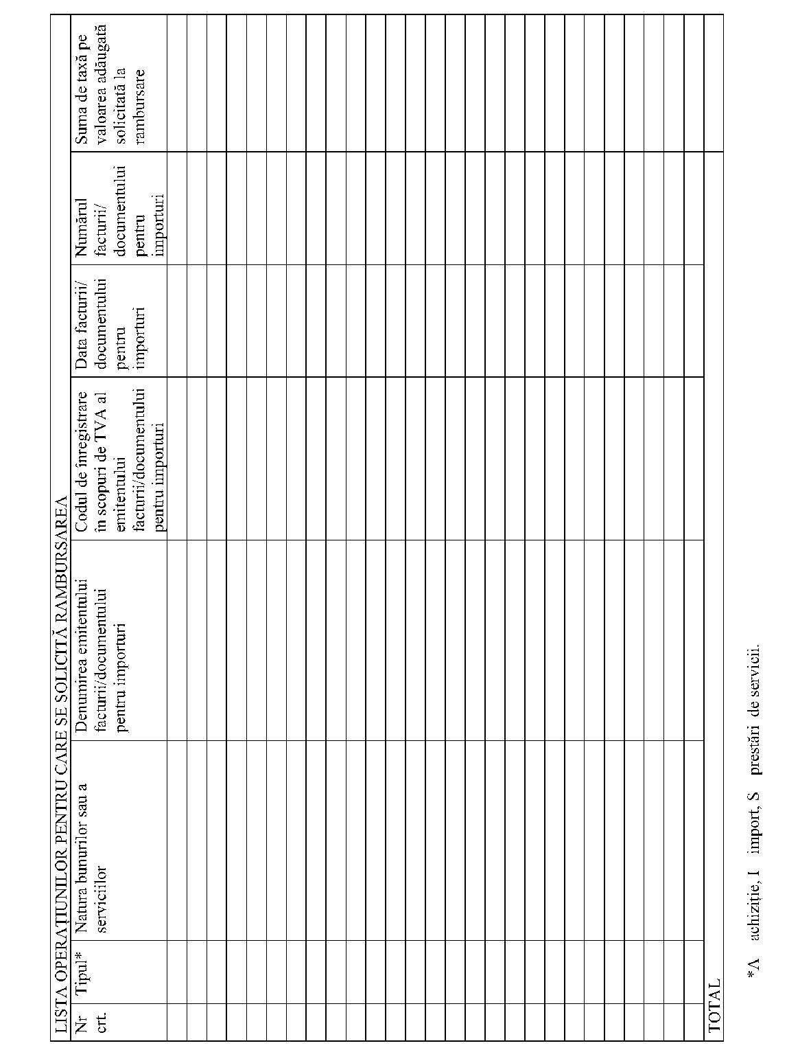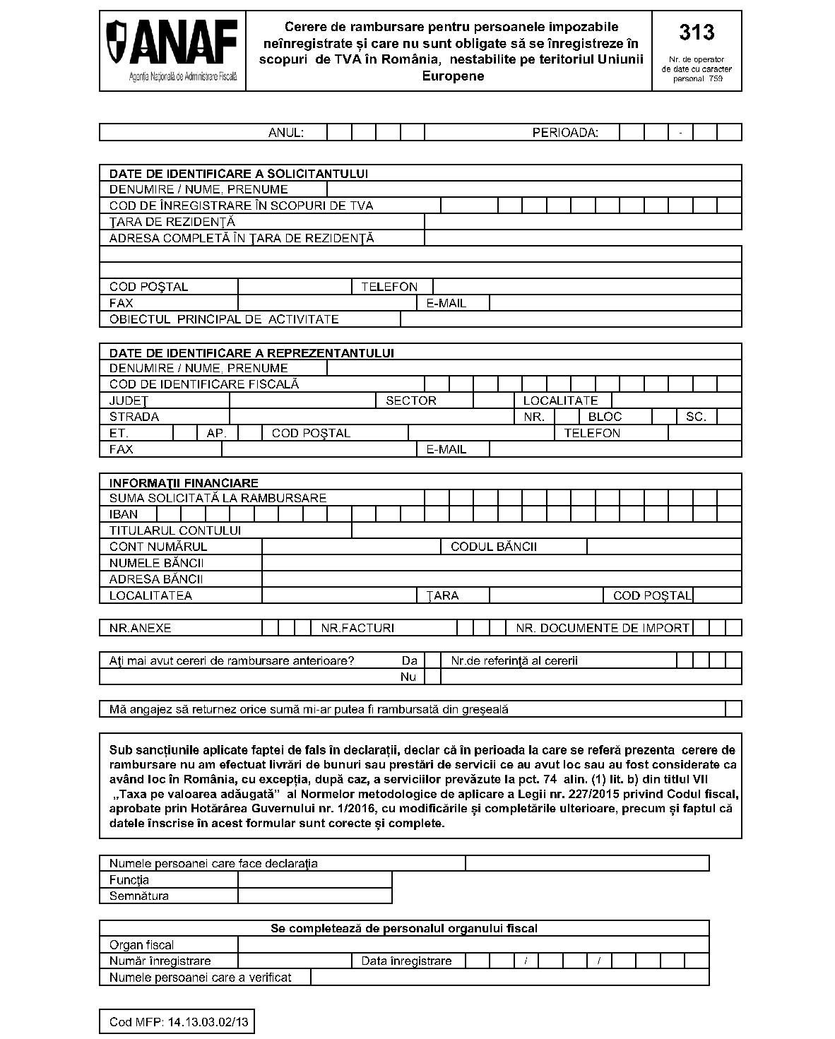 INSTRUCŢIUNI de completare a formularului 313 „Cerere de rambursare pentru persoanele impozabile neînregistrate şi care nu sunt obligate să se înregistreze în scopuri de TVA în România, nestabilite pe teritoriul Uniunii Europene", cod MFP 14.13.03.02/13 1. Cererea de rambursare se depune de către persoanele impozabile neînregistrate şi care nu sunt obligate să se înregistreze în scopuri de TVA în România, nestabilite pe teritoriul Uniunii Europene, pentru rambursarea taxei facturate de alte persoane impozabile pentru bunurile mobile corporale care le-au fost livrate sau serviciile care le-au fost prestate în beneficiul lor în România, precum şi a taxei aferente importului de bunuri în România pe o perioadă de minimum 3 luni sau de maximum un an calendaristic ori pe o perioadă mai mică de 3 luni rămasă din anul calendaristic. 2. Cererea se depune în termen de maximum 9 luni de la sfârşitul anului calendaristic în care taxa devine exigibilă. 3. Cererea se depune în format electronic la: – registratura organului fiscal central competent; – poştă, prin scrisoare recomandată.4. Formatul electronic, depus pe suport electronic, va fi însoţit de formularul editat de solicitant cu ajutorul programului de asistenţă elaborat de Ministerul Finanţelor Publice, semnat, conform legii. Formatul se editează în două exemplare: – un exemplar se depune la unitatea fiscală, împreună cu suportul electronic; – un exemplar se păstrează de către solicitant.Formatul electronic al cererii se obţine prin folosirea programului de asistenţă elaborat de Ministerul Finanţelor Publice şi se transmite organului competent pe suport electronic. Programul de asistenţă este pus la dispoziţia persoanelor impozabile, gratuit, de unitatea fiscală sau poate fi descărcat de pe serverul web al Ministerului Finanţelor Publice, la adresa www.mfinante.ro Modul de completare a formularului 313 „Cerere de rambursare pentru persoanele impozabile neînregistrate şi care nu sunt obligate să se înregistreze în scopuri de TVA în România, nestabilite pe teritoriul Uniunii Europene", cod MFP 14.13.03.02/13 Secţiunea 1 Anul la care se referă declaraţia - se înscrie cu cifre arabe cu 4 caractere (de exemplu: 2016). Perioada aferentă operaţiunilor realizate (de exemplu: pentru perioada ianuarie-iunie se va înscrie 01-06). Cartuşul „Date de identificare a solicitantului" conţine: 1. Denumire/nume, prenume - se înscriu, după caz, denumirea sau numele şi prenumele persoanei impozabile. 2. Cod de înregistrare în scopuri de TVA - se completează codul primit la înregistrarea în scopuri de TVA, înscris în certificatul de înregistrare fiscală în ţara de origine a solicitantului. 3. Adresa completă în ţara de rezidenţă - se completează cu datele privind adresa domiciliului fiscal (sediul social, sediul sau domiciliul fiscal, după caz) al persoanei impozabile. Cartuşul „Date de identificare a reprezentantului" conţine: 1. Denumire/nume, prenume - se înscriu, după caz, denumirea sau numele şi prenumele reprezentantului. 2. Cod de identificare fiscală - se completează codul primit la înregistrare, înscris în certificatul de înregistrare fiscală al reprezentantului, pentru activitatea proprie. Înscrierea cifrelor în casetă se face cu aliniere la dreapta. 3. Adresa - se completează cu datele privind adresa domiciliului fiscal (sediul social, sediul sau domiciliul fiscal, după caz) al reprezentantului. Nu are obligaţia să completeze acest cartuş persoana impozabilă nestabilită în Uniunea Europeană care utilizează regimul special pentru serviciile electronice, de telecomunicaţii, de radiodifuziune sau de televiziune prevăzut la art. 314 din Codul fiscal. Cartuşul „Informaţii financiare" conţine: 1. Suma solicitată la rambursare - se înscrie suma solicitată. Înscrierea cifrelor în casetă se realizează cu aliniere la dreapta. 2. IBAN - se înscrie codul IBAN al contului bancar în care se doreşte a fi transferată suma solicitată. 3. Titularul contului - se înscrie numele complet al titularului contului bancar. 4. Cont numărul - se înscrie numărul contului bancar în care se doreşte a fi transferată suma solicitată. 5. Codul băncii - se înscrie codul băncii la care se află contul nominalizat mai sus. 6. Numele băncii - se înscrie numele băncii. 7. Adresa băncii, localitatea, ţara, cod poştal - se înscrie adresa exactă a băncii nominalizate pentru realizarea transferului sumei solicitate. Nr. anexe - se înscrie numărul anexelor ce însoţesc cererea. Nr. facturi - se înscrie numărul facturilor ce însoţesc cererea pentru a dovedi validitatea sumei solicitate. Nr. documente de import - se înscrie numărul documentelor de import ce însoţesc cererea pentru a dovedi validitatea sumei solicitate. În cazul în care solicitantul a mai avut şi alte cereri de rambursare anterioare, acest lucru va fi specificat prin bifarea căsuţei corespunzătoare, precum şi prin specificarea numărului de referinţă repartizat acelei cereri. În cazul în care nu a mai avut alte cereri de rambursare anterioare, va bifa căsuţa „Nu". Secţiunea a 2-a Cuprinde operaţiunile care stau la baza sumei solicitate şi vor fi înscrise nominal toate achiziţiile şi importurile de bunuri, precum şi prestările de servicii care i-au fost efectuate solicitantului. Tipul - se înscrie tipul operaţiunii. Se înscriu: A pentru achiziţii, I pentru import, S pentru prestări de servicii. Natura bunurilor sau a serviciilor - se înscrie natura bunurilor achiziţionate sau importate ori natura serviciilor care iau fost prestate. Denumirea emitentului facturii/documentului pentru importuri - se înscriu numele şi prenumele sau denumirea furnizorului ori a prestatorului. Codul de înregistrare în scopuri de TVA al emitentului facturii/documentului pentru importuri - se înscrie codul de înregistrare în scopuri de 