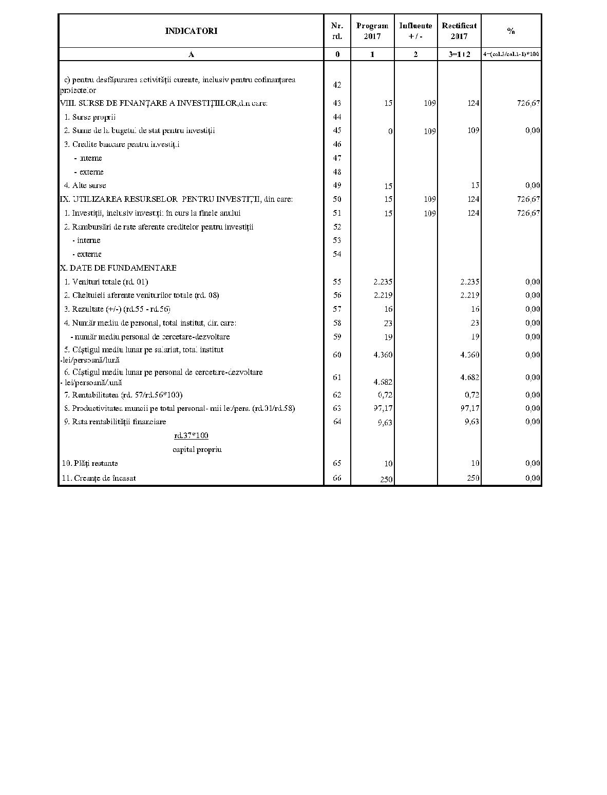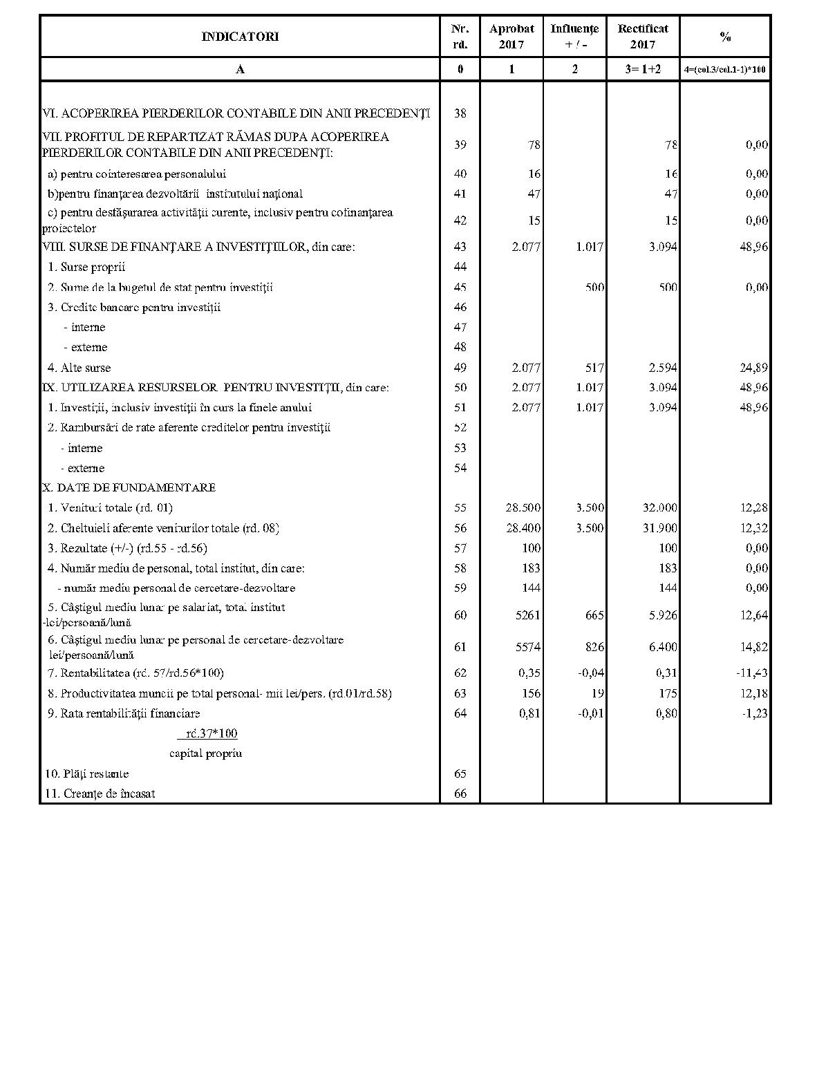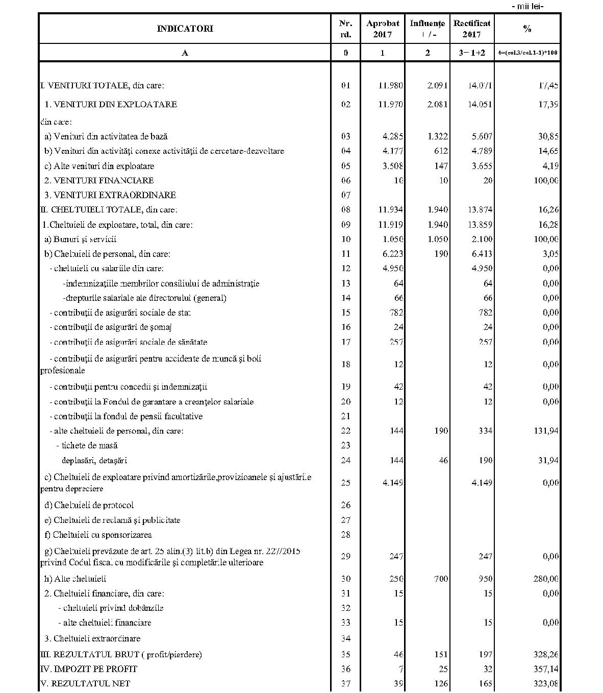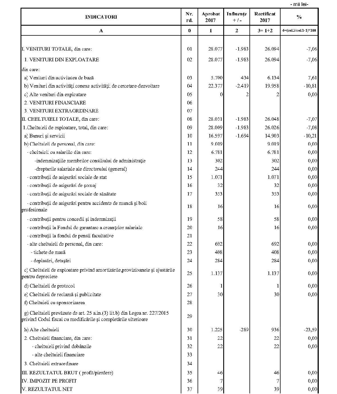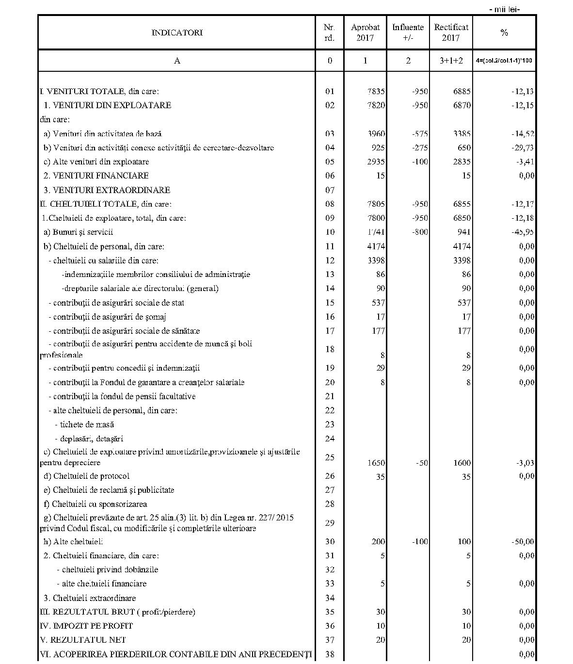 Având în vedere prevederile art. 24 alin. (2) din Ordonanţa Guvernului nr. 57/2002 privind cercetarea ştiinţifică şi dezvoltarea tehnologică, aprobată cu modificări şi completări prin Legea nr. 324/2003, cu modificările şi completările ulterioare,în conformitate cu Ordonanţa de urgenţă a Guvernului nr. 1/2017 pentru stabilirea unor măsuri în domeniul administraţiei publice centrale şi pentru modificarea şi completarea unor acte normative, aprobată cu modificări şi completări prin Legea nr. 129/2017, cu modificările şi completările ulterioare,în temeiul prevederilor art. 10 alin. (3) din Hotărârea Guvernului nr. 13/2017 privind organizarea şi funcţionarea Ministerului Cercetării şi Inovării,ministrul cercetării şi inovării emite prezentul ordin. Articolul 1Se aprobă bugetele de venituri şi cheltuieli rectificate pe anul 2017 ale institutelor naţionale de cercetare-dezvoltare în coordonarea Ministerului Cercetării şi Inovării, prevăzute în anexele nr. 1-33*), care fac parte integrantă din prezentul ordin. *) Anexele nr. 1-33 sunt reproduse în facsimil. Articolul 2(1) Cheltuielile totale aferente veniturilor înscrise în bugetele de venituri şi cheltuieli rectificate prevăzute la art. 1 reprezintă limite maxime ce nu pot fi depăşite.(2) În cazul în care, în execuţie, se înregistrează nerealizări ale veniturilor aprobate, institutele naţionale de cercetare-dezvoltare vor efectua cheltuieli în funcţie de realizarea veniturilor, cu încadrarea în indicatorii de eficienţă aprobaţi. Articolul 3Institutele naţionale de cercetare-dezvoltare în coordonarea Ministerului Cercetării şi Inovării vor duce la îndeplinire prevederile prezentului ordin. Articolul 4 Prezentul ordin se publică în Monitorul Oficial al României, Partea I. Ministrul cercetării şi inovării, Puiu-Lucian Georgescu ANEXA Nr. 1MINISTERUL CERCETĂRII ŞI INOVĂRII INSTITUTUL NAŢIONAL DE CERCETARE-DEZVOLTARE TURBOMOTOARE - COMOTI BUCUREŞTI BUGETUL DE VENITURI ŞI CHELTUIELI RECTIFICAT pe anul 2017 ANEXA Nr. 2MINISTERUL CERCETĂRII ŞI INOVĂRII INSTITUTUL NAŢIONAL DE CERCETARE-DEZVOLTARE ÎN DOMENIUL GEOLOGIEI, GEOFIZICII, GEOCHIMIEI ŞI TELEDETECŢIEI - IGR BUCUREŞTI BUGETUL DE VENITURI ŞI CHELTUIELI RECTIFICAT pe anul 2017 ANEXA Nr. 3MINISTERUL CERCETĂRII ŞI INOVĂRII INSTITUTUL NAŢIONAL DE CERCETARE-DEZVOLTARE PENTRU TEXTILE ŞI PIELĂRIE - INCDTP BUCUREŞTI BUGETUL DE VENITURI ŞI CHELTUIELI RECTIFICAT pe anul 2017 ANEXA Nr. 4MINISTERUL CERCETĂRII ŞI INOVĂRII INSTITUTUL NAŢIONAL DE CERCETARE-DEZVOLTARE PENTRU MAŞINI AGRICOLE ŞI INSTALAŢII DESTINATE AGRICULTURII ŞI INDUSTRIEI ALIMENTARE - INMA BUCUREŞTI BUGETUL DE VENITURI ŞI CHELTUIELI RECTIFICAT pe anul 2017 ANEXA Nr. 5MINISTERUL CERCETĂRII ŞI INOVĂRII INSTITUTUL NAŢIONAL DE CERCETARE-DEZVOLTARE PENTRU FIZICA LASERILOR, PLASMEI ŞI RADIAŢIEI - INFLPR BUCUREŞTI BUGETUL DE VENITURI ŞI CHELTUIELI RECTIFICAT pe anul 2017 ANEXA Nr. 6MINISTERUL CERCETĂRII ŞI INOVĂRII INSTITUTUL NAŢIONAL DE CERCETARE-DEZVOLTARE PENTRU FIZICA MATERIALELOR - INCDFM BUCUREŞTI BUGETUL DE VENITURI ŞI CHELTUIELI RECTIFICAT pe anul 2017 ANEXA Nr. 7MINISTERUL CERCETĂRII ŞI INOVĂRII INSTITUTUL NAŢIONAL DE CERCETARE-DEZVOLTARE PENTRU FIZICA PĂMÂNTULUI - INCDFB BUCUREŞTI BUGETUL DE VENITURI ŞI CHELTUIELI RECTIFICAT pe anul 2017 ANEXA Nr. 8MINISTERUL CERCETĂRII ŞI INOVĂRII INSTITUTUL NAŢIONAL DE CERCETARE-DEZVOLTARE CHIMICO-FARMACEUTICĂ - ICCF BUCUREŞTI BUGETUL DE VENITURI ŞI CHELTUIELI RECTIFICAT pe anul 2017 ANEXA Nr. 9MINISTERUL CERCETĂRII ŞI INOVĂRII INSTITUTUL NAŢIONAL DE CERCETARE-DEZVOLTARE PENTRU ELECTROCHIMIE ŞI MATERIE CONDENSATĂ - INCEMC TIMIŞOARA BUGETUL DE VENITURI ŞI CHELTUIELI RECTIFICAT pe anul 2017 ANEXA Nr. 10MINISTERUL CERCETĂRII ŞI INOVĂRII INSTITUTUL NAŢIONAL DE CERCETARE-DEZVOLTARE PENTRU GEOLOGIE ŞI GEOECOLOGIE MARINĂ - GEOECOMAR BUCUREŞTI BUGETUL DE VENITURI ŞI CHELTUIELI RECTIFICAT pe anul 2017 ANEXA Nr. 11MINISTERUL CERCETĂRII ŞI INOVĂRII INSTITUTUL NAŢIONAL DE CERCETARE-DEZVOLTARE PENTRU ŞTIINŢE BIOLOGICE - INCDSB BUCUREŞTI BUGETUL DE VENITURI ŞI CHELTUIELI RECTIFICAT pe anul 2017 ANEXA Nr. 12MINISTERUL CERCETĂRII ŞI INOVĂRII INSTITUTUL NAŢIONAL DE CERCETARE-DEZVOLTARE PENTRU MICROTEHNOLOGIE IMT - BUCUREŞTI BUGETUL DE VENITURI ŞI CHELTUIELI RECTIFICAT pe anul 2017 ANEXA Nr. 13MINISTERUL CERCETĂRII ŞI INOVĂRII INSTITUTUL NAŢIONAL DE CERCETARE-DEZVOLTARE PENTRU INGINERIE ELECTRICĂ CERCETĂRI AVANSATE ICPE-CA BUCUREŞTI BUGETUL DE VENITURI ŞI CHELTUIELI RECTIFICAT pe anul 2017 ANEXA Nr. 14MINISTERUL CERCETĂRII ŞI INOVĂRII INSTITUTUL NAŢIONAL DE CERCETARE-DEZVOLTARE AEROSPAŢIALĂ „ELIE CARAFOLI" - I.N.C.A.S. BUGETUL DE VENITURI ŞI CHELTUIELI RECTIFICAT pe anul 2017 ANEXA Nr. 15MINISTERUL CERCETĂRII ŞI INOVĂRII INSTITUTUL NAŢIONAL DE CERCETARE-DEZVOLTARE PENTRU MECATRONICĂ ŞI TEHNICA MĂSURĂRII - INCDMTM BUCUREŞTI BUGETUL DE VENITURI ŞI CHELTUIELI RECTIFICAT pe anul 2017 ANEXA Nr. 16MINISTERUL CERCETĂRII ŞI INOVĂRII INSTITUTUL NAŢIONAL DE CERCETARE-DEZVOLTARE PENTRU ECOLOGIE INDUSTRIALĂ - ECOIND BUCUREŞTI BUGETUL DE VENITURI ŞI CHELTUIELI RECTIFICAT pe anul 2017 ANEXA Nr. 17MINISTERUL CERCETĂRII ŞI INOVĂRII INSTITUTUL NAŢIONAL DE CERCETARE-DEZVOLTARE ÎN SUDURĂ ŞI ÎNCERCĂRI DE MATERIALE - ISIM TIMIŞOARA BUGETUL DE VENITURI ŞI CHELTUIELI RECTIFICAT pe anul 2017 ANEXA Nr. 18MINISTERUL CERCETĂRII ŞI INOVĂRII INSTITUTUL NAŢIONAL DE CERCETARE-DEZVOLTARE PENTRU CHIMIE ŞI PETROCHIMIE - ICECHIM BUCUREŞTI BUGETUL DE VENITURI ŞI CHELTUIELI RECTIFICAT pe anul 2017 ANEXA Nr. 19MINISTERUL CERCETĂRII ŞI INOVĂRII INSTITUTUL NAŢIONAL PENTRU CERCETARE-DEZVOLTARE PENTRU METALE NEFEROASE ŞI RARE - IMNR BUCUREŞTI BUGETUL DE VENITURI ŞI CHELTUIELI RECTIFICAT pe anul 2017 ANEXA Nr. 20MINISTERUL CERCETĂRII ŞI INOVĂRII INSTITUTUL NAŢIONAL DE CERCETARE-DEZVOLTARE PENTRU SECURITATE MINIERĂ ŞI PROTECŢI
