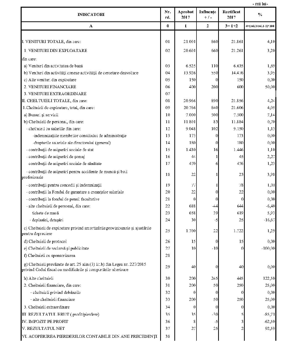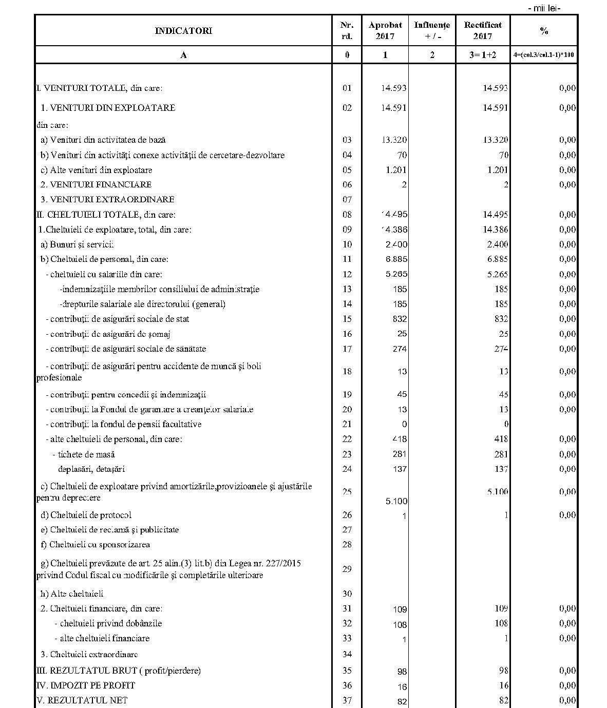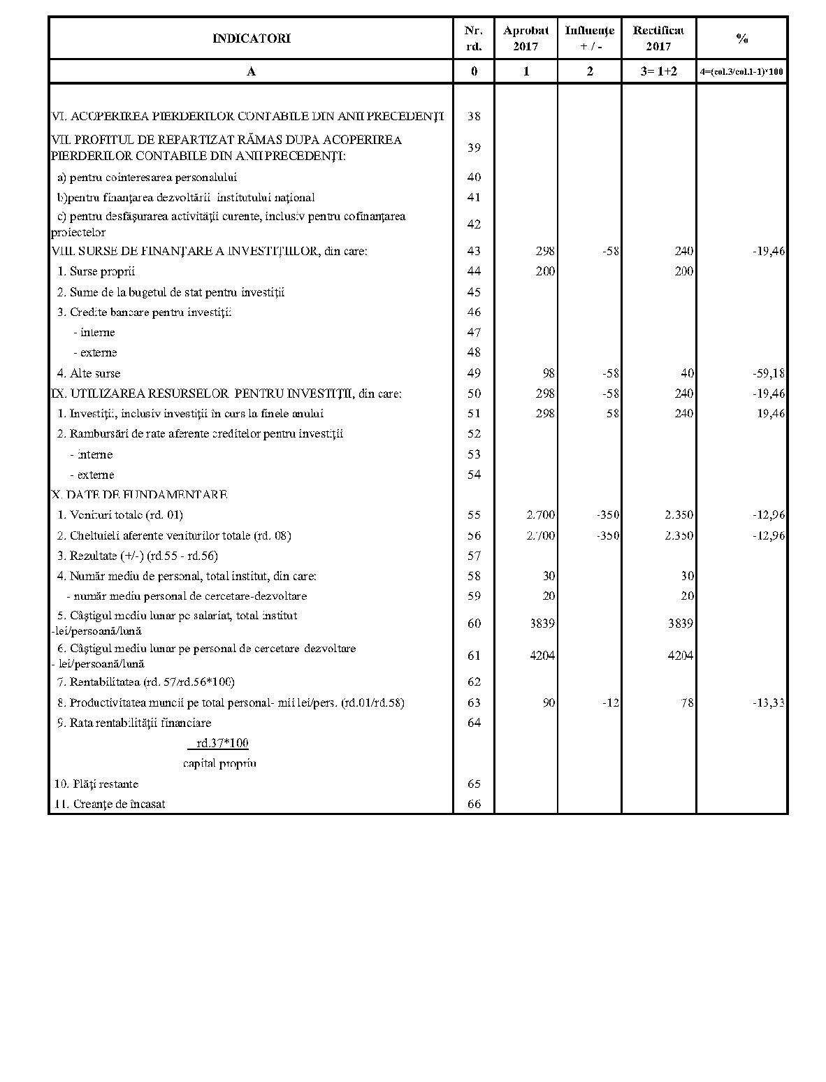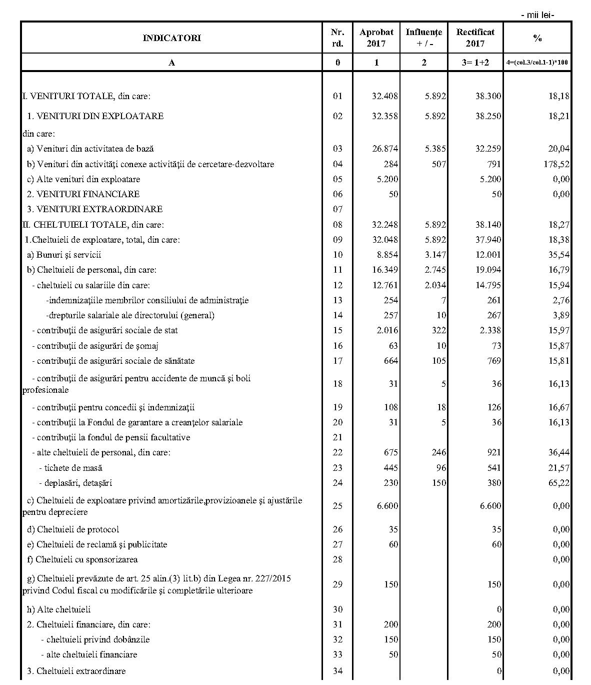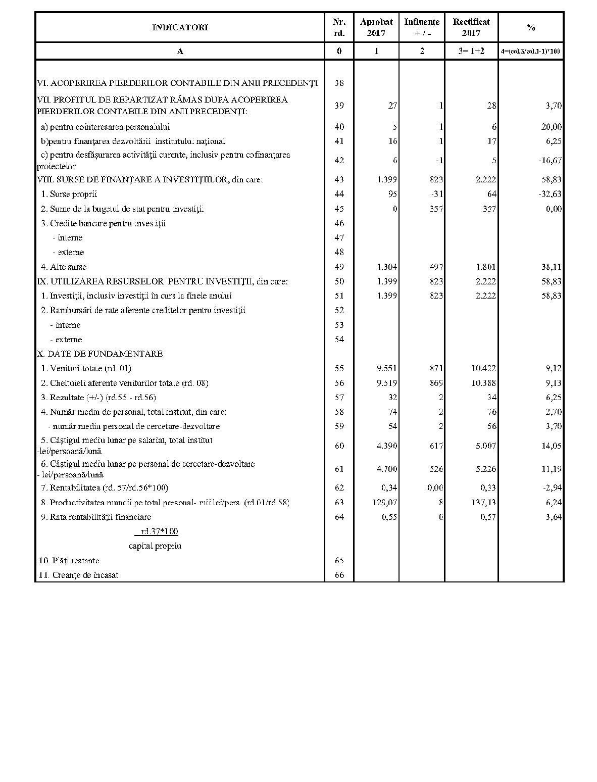 Având în vedere prevederile art. 24 alin. (2) din Ordonanţa Guvernului nr. 57/2002 privind cercetarea ştiinţifică şi dezvoltarea tehnologică, aprobată cu modificări şi completări prin Legea nr. 324/2003, cu modificările şi completările ulterioare,în conformitate cu Ordonanţa de urgenţă a Guvernului nr. 1/2017 pentru stabilirea unor măsuri în domeniul administraţiei publice centrale şi pentru modificarea şi completarea unor acte normative, aprobată cu modificări şi completări prin Legea nr. 129/2017, cu modificările şi completările ulterioare,în temeiul prevederilor art. 10 alin. (3) din Hotărârea Guvernului nr. 13/2017 privind organizarea şi funcţionarea Ministerului Cercetării şi Inovării,ministrul cercetării şi inovării emite prezentul ordin. Articolul 1Se aprobă bugetele de venituri şi cheltuieli rectificate pe anul 2017 ale institutelor naţionale de cercetare-dezvoltare în coordonarea Ministerului Cercetării şi Inovării, prevăzute în anexele nr. 1-33*), care fac parte integrantă din prezentul ordin. *) Anexele nr. 1-33 sunt reproduse în facsimil. Articolul 2(1) Cheltuielile totale aferente veniturilor înscrise în bugetele de venituri şi cheltuieli rectificate prevăzute la art. 1 reprezintă limite maxime ce nu pot fi depăşite.(2) În cazul în care, în execuţie, se înregistrează nerealizări ale veniturilor aprobate, institutele naţionale de cercetare-dezvoltare vor efectua cheltuieli în funcţie de realizarea veniturilor, cu încadrarea în indicatorii de eficienţă aprobaţi. Articolul 3Institutele naţionale de cercetare-dezvoltare în coordonarea Ministerului Cercetării şi Inovării vor duce la îndeplinire prevederile prezentului ordin. Articolul 4 Prezentul ordin se publică în Monitorul Oficial al României, Partea I. Ministrul cercetării şi inovării, Puiu-Lucian Georgescu ANEXA Nr. 1MINISTERUL CERCETĂRII ŞI INOVĂRII INSTITUTUL NAŢIONAL DE CERCETARE-DEZVOLTARE TURBOMOTOARE - COMOTI BUCUREŞTI BUGETUL DE VENITURI ŞI CHELTUIELI RECTIFICAT pe anul 2017 ANEXA Nr. 2MINISTERUL CERCETĂRII ŞI INOVĂRII INSTITUTUL NAŢIONAL DE CERCETARE-DEZVOLTARE ÎN DOMENIUL GEOLOGIEI, GEOFIZICII, GEOCHIMIEI ŞI TELEDETECŢIEI - IGR BUCUREŞTI BUGETUL DE VENITURI ŞI CHELTUIELI RECTIFICAT pe anul 2017 ANEXA Nr. 3MINISTERUL CERCETĂRII ŞI INOVĂRII INSTITUTUL NAŢIONAL DE CERCETARE-DEZVOLTARE PENTRU TEXTILE ŞI PIELĂRIE - INCDTP BUCUREŞTI BUGETUL DE VENITURI ŞI CHELTUIELI RECTIFICAT pe anul 2017 ANEXA Nr. 4MINISTERUL CERCETĂRII ŞI INOVĂRII INSTITUTUL NAŢIONAL DE CERCETARE-DEZVOLTARE PENTRU MAŞINI AGRICOLE ŞI INSTALAŢII DESTINATE AGRICULTURII ŞI INDUSTRIEI ALIMENTARE - INMA BUCUREŞTI BUGETUL DE VENITURI ŞI CHELTUIELI RECTIFICAT pe anul 2017 ANEXA Nr. 5MINISTERUL CERCETĂRII ŞI INOVĂRII INSTITUTUL NAŢIONAL DE CERCETARE-DEZVOLTARE PENTRU FIZICA LASERILOR, PLASMEI ŞI RADIAŢIEI - INFLPR BUCUREŞTI BUGETUL DE VENITURI ŞI CHELTUIELI RECTIFICAT pe anul 2017 ANEXA Nr. 6MINISTERUL CERCETĂRII ŞI INOVĂRII INSTITUTUL NAŢIONAL DE CERCETARE-DEZVOLTARE PENTRU FIZICA MATERIALELOR - INCDFM BUCUREŞTI BUGETUL DE VENITURI ŞI CHELTUIELI RECTIFICAT pe anul 2017 ANEXA Nr. 7MINISTERUL CERCETĂRII ŞI INOVĂRII INSTITUTUL NAŢIONAL DE CERCETARE-DEZVOLTARE PENTRU FIZICA PĂMÂNTULUI - INCDFB BUCUREŞTI BUGETUL DE VENITURI ŞI CHELTUIELI RECTIFICAT pe anul 2017 ANEXA Nr. 8MINISTERUL CERCETĂRII ŞI INOVĂRII INSTITUTUL NAŢIONAL DE CERCETARE-DEZVOLTARE CHIMICO-FARMACEUTICĂ - ICCF BUCUREŞTI BUGETUL DE VENITURI ŞI CHELTUIELI RECTIFICAT pe anul 2017 ANEXA Nr. 9MINISTERUL CERCETĂRII ŞI INOVĂRII INSTITUTUL NAŢIONAL DE CERCETARE-DEZVOLTARE PENTRU ELECTROCHIMIE ŞI MATERIE CONDENSATĂ - INCEMC TIMIŞOARA BUGETUL DE VENITURI ŞI CHELTUIELI RECTIFICAT pe anul 2017 ANEXA Nr. 10MINISTERUL CERCETĂRII ŞI INOVĂRII INSTITUTUL NAŢIONAL DE CERCETARE-DEZVOLTARE PENTRU GEOLOGIE ŞI GEOECOLOGIE MARINĂ - GEOECOMAR BUCUREŞTI BUGETUL DE VENITURI ŞI CHELTUIELI RECTIFICAT pe anul 2017 ANEXA Nr. 11MINISTERUL CERCETĂRII ŞI INOVĂRII INSTITUTUL NAŢIONAL DE CERCETARE-DEZVOLTARE PENTRU ŞTIINŢE BIOLOGICE - INCDSB BUCUREŞTI BUGETUL DE VENITURI ŞI CHELTUIELI RECTIFICAT pe anul 2017 ANEXA Nr. 12MINISTERUL CERCETĂRII ŞI INOVĂRII INSTITUTUL NAŢIONAL DE CERCETARE-DEZVOLTARE PENTRU MICROTEHNOLOGIE IMT - BUCUREŞTI BUGETUL DE VENITURI ŞI CHELTUIELI RECTIFICAT pe anul 2017 ANEXA Nr. 13MINISTERUL CERCETĂRII ŞI INOVĂRII INSTITUTUL NAŢIONAL DE CERCETARE-DEZVOLTARE PENTRU INGINERIE ELECTRICĂ CERCETĂRI AVANSATE ICPE-CA BUCUREŞTI BUGETUL DE VENITURI ŞI CHELTUIELI RECTIFICAT pe anul 2017 ANEXA Nr. 14MINISTERUL CERCETĂRII ŞI INOVĂRII INSTITUTUL NAŢIONAL DE CERCETARE-DEZVOLTARE AEROSPAŢIALĂ „ELIE CARAFOLI" - I.N.C.A.S. BUGETUL DE VENITURI ŞI CHELTUIELI RECTIFICAT pe anul 2017 ANEXA Nr. 15MINISTERUL CERCETĂRII ŞI INOVĂRII INSTITUTUL NAŢIONAL DE CERCETARE-DEZVOLTARE PENTRU MECATRONICĂ ŞI TEHNICA MĂSURĂRII - INCDMTM BUCUREŞTI BUGETUL DE VENITURI ŞI CHELTUIELI RECTIFICAT pe anul 2017 ANEXA Nr. 16MINISTERUL CERCETĂRII ŞI INOVĂRII INSTITUTUL NAŢIONAL DE CERCETARE-DEZVOLTARE PENTRU ECOLOGIE INDUSTRIALĂ - ECOIND BUCUREŞTI BUGETUL DE VENITURI ŞI CHELTUIELI RECTIFICAT pe anul 2017 ANEXA Nr. 17MINISTERUL CERCETĂRII ŞI INOVĂRII INSTITUTUL NAŢIONAL DE CERCETARE-DEZVOLTARE ÎN SUDURĂ ŞI ÎNCERCĂRI DE MATERIALE - ISIM TIMIŞOARA BUGETUL DE VENITURI ŞI CHELTUIELI RECTIFICAT pe anul 2017 ANEXA Nr. 18MINISTERUL CERCETĂRII ŞI INOVĂRII INSTITUTUL NAŢIONAL DE CERCETARE-DEZVOLTARE PENTRU CHIMIE ŞI PETROCHIMIE - ICECHIM BUCUREŞTI BUGETUL DE VENITURI ŞI CHELTUIELI RECTIFICAT pe anul 2017 ANEXA Nr. 19MINISTERUL CERCETĂRII ŞI INOVĂRII INSTITUTUL NAŢIONAL PENTRU CERCETARE-DEZVOLTARE PENTRU METALE NEFEROASE ŞI RARE - IMNR BUCUREŞTI BUGETUL DE VENITURI ŞI CHELTUIELI RECTIFICAT pe anul 2017 ANEXA Nr. 20MINISTERUL CERCETĂRII ŞI INOVĂRII INSTITUTUL NAŢIONAL DE CERCETARE-DEZVOLTARE PENTRU SECURITATE MINIERĂ ŞI PROTECŢI