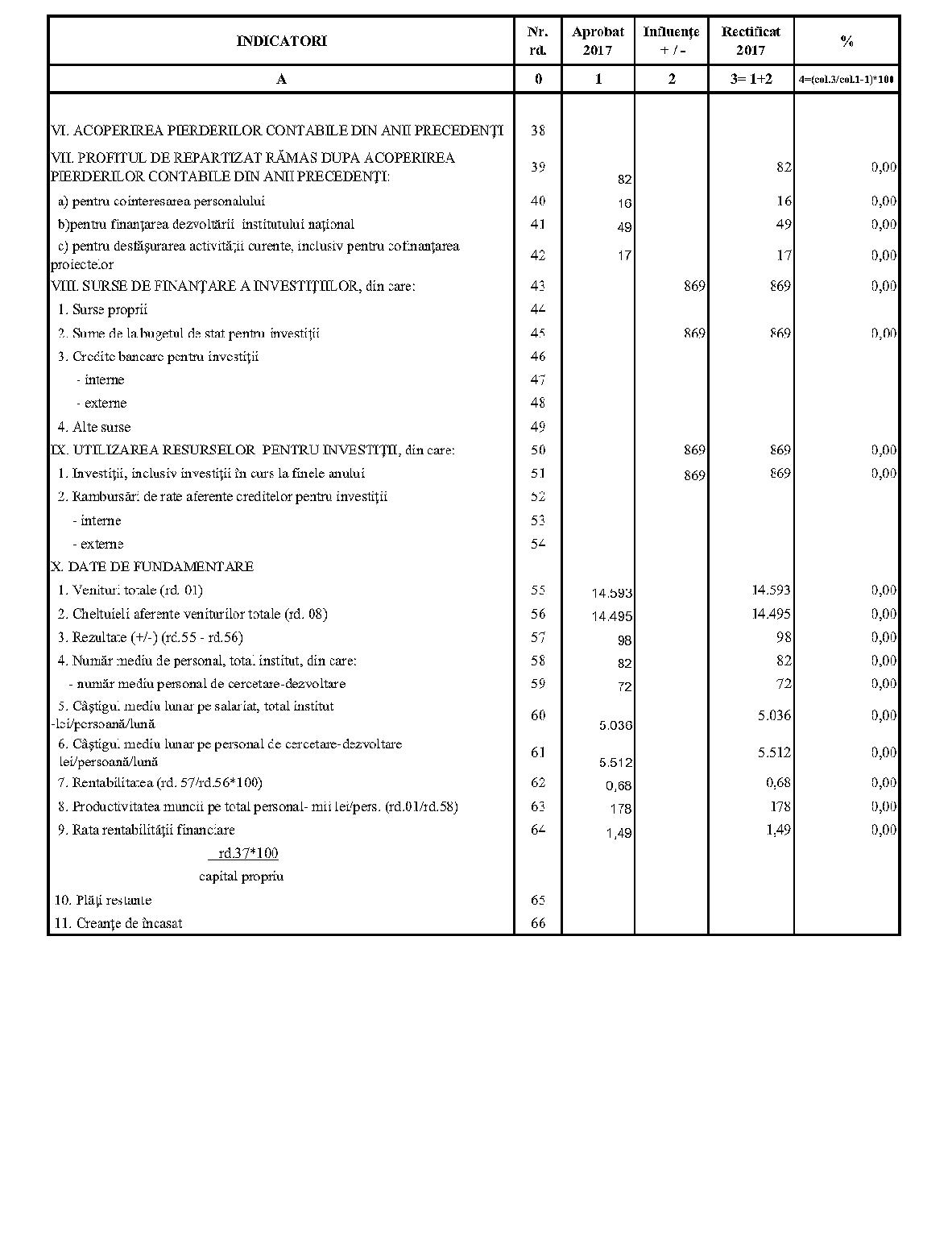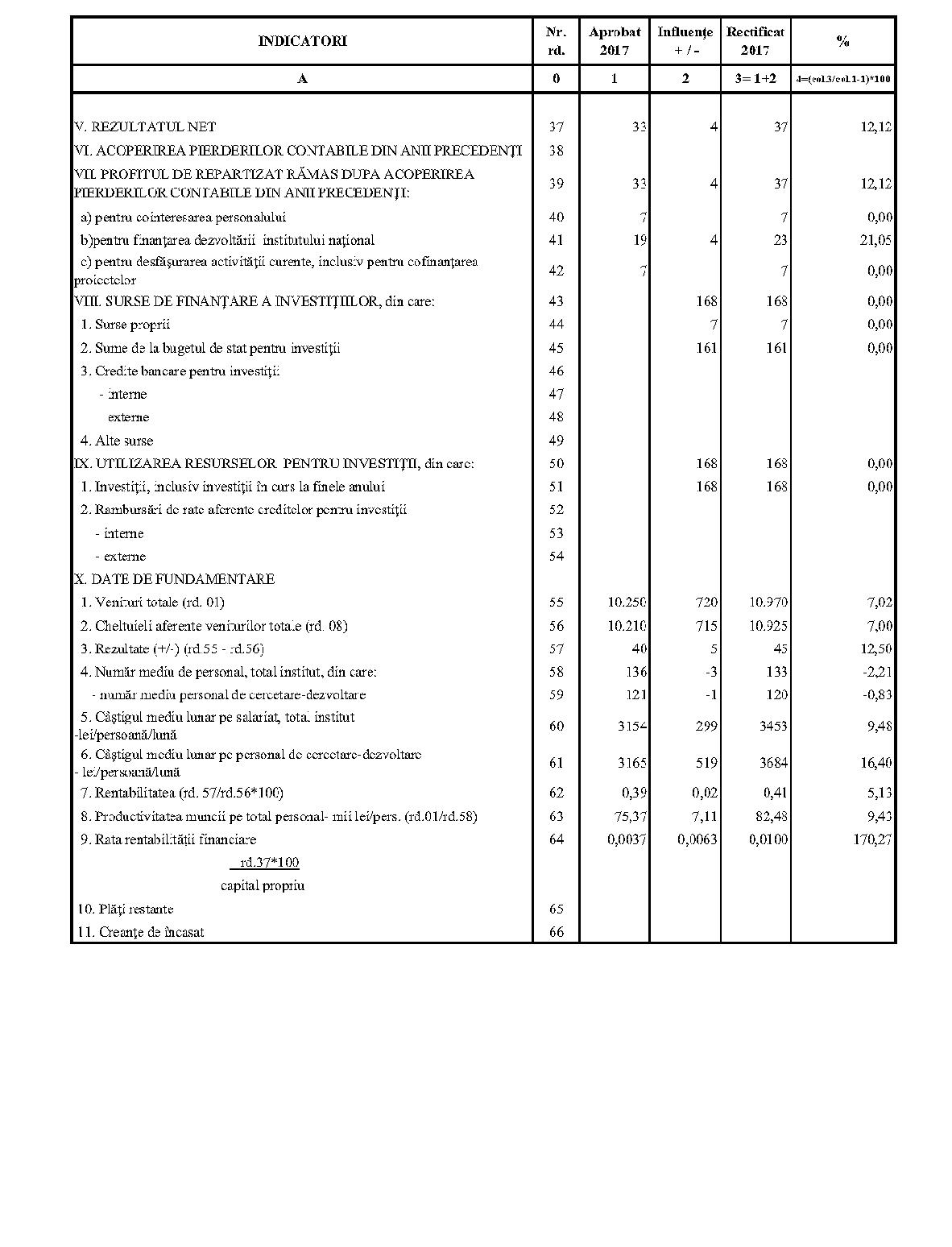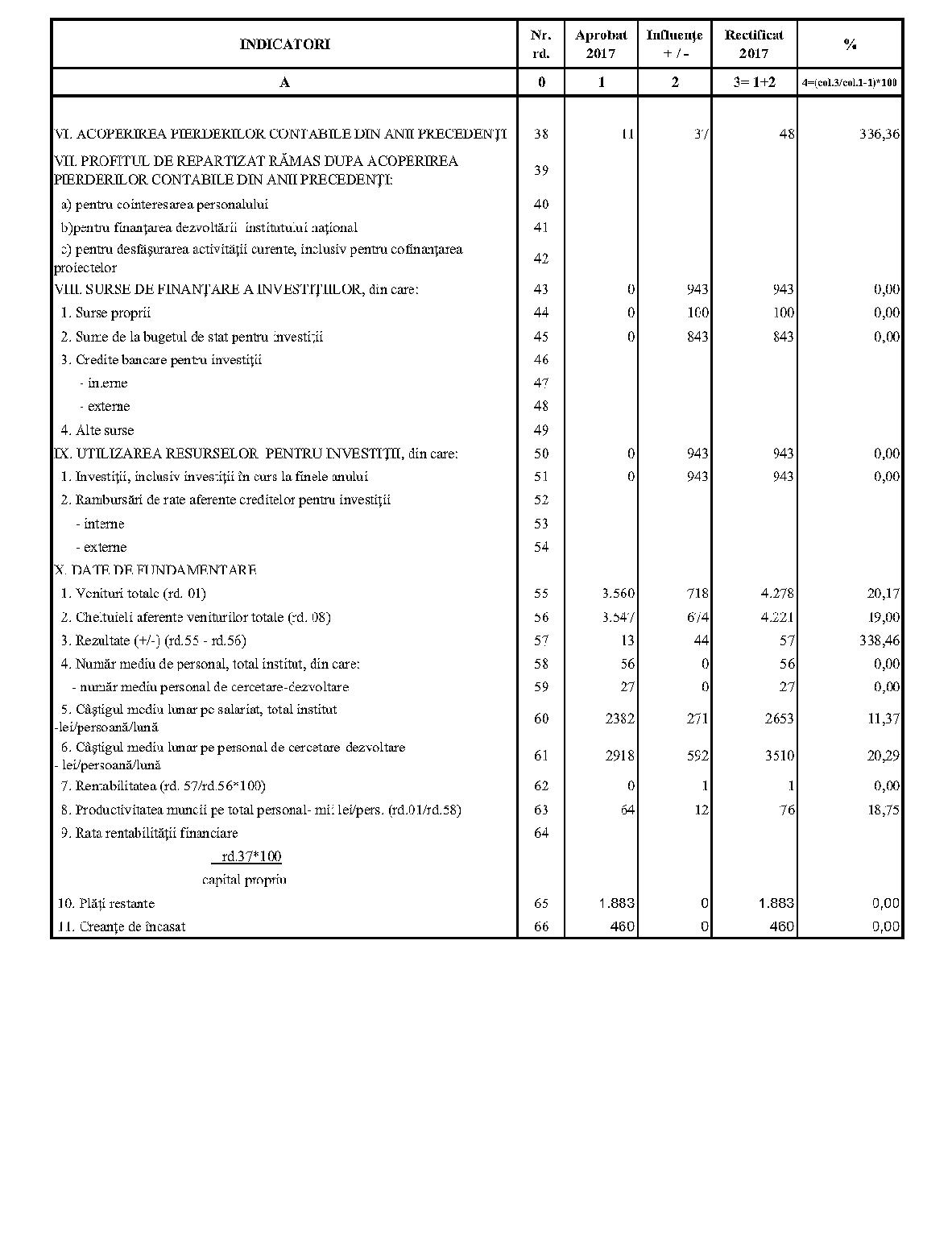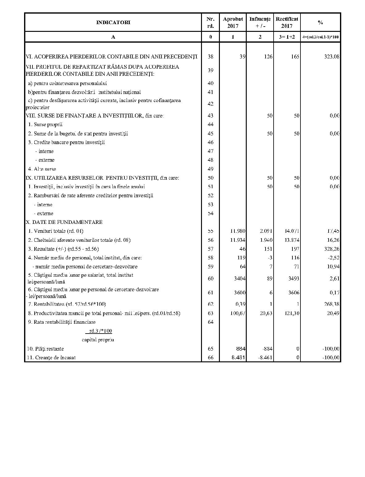Având în vedere prevederile art. 24 alin. (2) din Ordonanţa Guvernului nr. 57/2002 privind cercetarea ştiinţifică şi dezvoltarea tehnologică, aprobată cu modificări şi completări prin Legea nr. 324/2003, cu modificările şi completările ulterioare,în conformitate cu Ordonanţa de urgenţă a Guvernului nr. 1/2017 pentru stabilirea unor măsuri în domeniul administraţiei publice centrale şi pentru modificarea şi completarea unor acte normative, aprobată cu modificări şi completări prin Legea nr. 129/2017, cu modificările şi completările ulterioare,în temeiul prevederilor art. 10 alin. (3) din Hotărârea Guvernului nr. 13/2017 privind organizarea şi funcţionarea Ministerului Cercetării şi Inovării,ministrul cercetării şi inovării emite prezentul ordin. Articolul 1Se aprobă bugetele de venituri şi cheltuieli rectificate pe anul 2017 ale institutelor naţionale de cercetare-dezvoltare în coordonarea Ministerului Cercetării şi Inovării, prevăzute în anexele nr. 1-33*), care fac parte integrantă din prezentul ordin. *) Anexele nr. 1-33 sunt reproduse în facsimil. Articolul 2(1) Cheltuielile totale aferente veniturilor înscrise în bugetele de venituri şi cheltuieli rectificate prevăzute la art. 1 reprezintă limite maxime ce nu pot fi depăşite.(2) În cazul în care, în execuţie, se înregistrează nerealizări ale veniturilor aprobate, institutele naţionale de cercetare-dezvoltare vor efectua cheltuieli în funcţie de realizarea veniturilor, cu încadrarea în indicatorii de eficienţă aprobaţi. Articolul 3Institutele naţionale de cercetare-dezvoltare în coordonarea Ministerului Cercetării şi Inovării vor duce la îndeplinire prevederile prezentului ordin. Articolul 4 Prezentul ordin se publică în Monitorul Oficial al României, Partea I. Ministrul cercetării şi inovării, Puiu-Lucian Georgescu ANEXA Nr. 1MINISTERUL CERCETĂRII ŞI INOVĂRII INSTITUTUL NAŢIONAL DE CERCETARE-DEZVOLTARE TURBOMOTOARE - COMOTI BUCUREŞTI BUGETUL DE VENITURI ŞI CHELTUIELI RECTIFICAT pe anul 2017 ANEXA Nr. 2MINISTERUL CERCETĂRII ŞI INOVĂRII INSTITUTUL NAŢIONAL DE CERCETARE-DEZVOLTARE ÎN DOMENIUL GEOLOGIEI, GEOFIZICII, GEOCHIMIEI ŞI TELEDETECŢIEI - IGR BUCUREŞTI BUGETUL DE VENITURI ŞI CHELTUIELI RECTIFICAT pe anul 2017 ANEXA Nr. 3MINISTERUL CERCETĂRII ŞI INOVĂRII INSTITUTUL NAŢIONAL DE CERCETARE-DEZVOLTARE PENTRU TEXTILE ŞI PIELĂRIE - INCDTP BUCUREŞTI BUGETUL DE VENITURI ŞI CHELTUIELI RECTIFICAT pe anul 2017 ANEXA Nr. 4MINISTERUL CERCETĂRII ŞI INOVĂRII INSTITUTUL NAŢIONAL DE CERCETARE-DEZVOLTARE PENTRU MAŞINI AGRICOLE ŞI INSTALAŢII DESTINATE AGRICULTURII ŞI INDUSTRIEI ALIMENTARE - INMA BUCUREŞTI BUGETUL DE VENITURI ŞI CHELTUIELI RECTIFICAT pe anul 2017 ANEXA Nr. 5MINISTERUL CERCETĂRII ŞI INOVĂRII INSTITUTUL NAŢIONAL DE CERCETARE-DEZVOLTARE PENTRU FIZICA LASERILOR, PLASMEI ŞI RADIAŢIEI - INFLPR BUCUREŞTI BUGETUL DE VENITURI ŞI CHELTUIELI RECTIFICAT pe anul 2017 ANEXA Nr. 6MINISTERUL CERCETĂRII ŞI INOVĂRII INSTITUTUL NAŢIONAL DE CERCETARE-DEZVOLTARE PENTRU FIZICA MATERIALELOR - INCDFM BUCUREŞTI BUGETUL DE VENITURI ŞI CHELTUIELI RECTIFICAT pe anul 2017 ANEXA Nr. 7MINISTERUL CERCETĂRII ŞI INOVĂRII INSTITUTUL NAŢIONAL DE CERCETARE-DEZVOLTARE PENTRU FIZICA PĂMÂNTULUI - INCDFB BUCUREŞTI BUGETUL DE VENITURI ŞI CHELTUIELI RECTIFICAT pe anul 2017 ANEXA Nr. 8MINISTERUL CERCETĂRII ŞI INOVĂRII INSTITUTUL NAŢIONAL DE CERCETARE-DEZVOLTARE CHIMICO-FARMACEUTICĂ - ICCF BUCUREŞTI BUGETUL DE VENITURI ŞI CHELTUIELI RECTIFICAT pe anul 2017 ANEXA Nr. 9MINISTERUL CERCETĂRII ŞI INOVĂRII INSTITUTUL NAŢIONAL DE CERCETARE-DEZVOLTARE PENTRU ELECTROCHIMIE ŞI MATERIE CONDENSATĂ - INCEMC TIMIŞOARA BUGETUL DE VENITURI ŞI CHELTUIELI RECTIFICAT pe anul 2017 ANEXA Nr. 10MINISTERUL CERCETĂRII ŞI INOVĂRII INSTITUTUL NAŢIONAL DE CERCETARE-DEZVOLTARE PENTRU GEOLOGIE ŞI GEOECOLOGIE MARINĂ - GEOECOMAR BUCUREŞTI BUGETUL DE VENITURI ŞI CHELTUIELI RECTIFICAT pe anul 2017 ANEXA Nr. 11MINISTERUL CERCETĂRII ŞI INOVĂRII INSTITUTUL NAŢIONAL DE CERCETARE-DEZVOLTARE PENTRU ŞTIINŢE BIOLOGICE - INCDSB BUCUREŞTI BUGETUL DE VENITURI ŞI CHELTUIELI RECTIFICAT pe anul 2017 ANEXA Nr. 12MINISTERUL CERCETĂRII ŞI INOVĂRII INSTITUTUL NAŢIONAL DE CERCETARE-DEZVOLTARE PENTRU MICROTEHNOLOGIE IMT - BUCUREŞTI BUGETUL DE VENITURI ŞI CHELTUIELI RECTIFICAT pe anul 2017 ANEXA Nr. 13MINISTERUL CERCETĂRII ŞI INOVĂRII INSTITUTUL NAŢIONAL DE CERCETARE-DEZVOLTARE PENTRU INGINERIE ELECTRICĂ CERCETĂRI AVANSATE ICPE-CA BUCUREŞTI BUGETUL DE VENITURI ŞI CHELTUIELI RECTIFICAT pe anul 2017 ANEXA Nr. 14MINISTERUL CERCETĂRII ŞI INOVĂRII INSTITUTUL NAŢIONAL DE CERCETARE-DEZVOLTARE AEROSPAŢIALĂ „ELIE CARAFOLI" - I.N.C.A.S. BUGETUL DE VENITURI ŞI CHELTUIELI RECTIFICAT pe anul 2017 ANEXA Nr. 15MINISTERUL CERCETĂRII ŞI INOVĂRII INSTITUTUL NAŢIONAL DE CERCETARE-DEZVOLTARE PENTRU MECATRONICĂ ŞI TEHNICA MĂSURĂRII - INCDMTM BUCUREŞTI BUGETUL DE VENITURI ŞI CHELTUIELI RECTIFICAT pe anul 2017 ANEXA Nr. 16MINISTERUL CERCETĂRII ŞI INOVĂRII INSTITUTUL NAŢIONAL DE CERCETARE-DEZVOLTARE PENTRU ECOLOGIE INDUSTRIALĂ - ECOIND BUCUREŞTI BUGETUL DE VENITURI ŞI CHELTUIELI RECTIFICAT pe anul 2017 ANEXA Nr. 17MINISTERUL CERCETĂRII ŞI INOVĂRII INSTITUTUL NAŢIONAL DE CERCETARE-DEZVOLTARE ÎN SUDURĂ ŞI ÎNCERCĂRI DE MATERIALE - ISIM TIMIŞOARA BUGETUL DE VENITURI ŞI CHELTUIELI RECTIFICAT pe anul 2017 ANEXA Nr. 18MINISTERUL CERCETĂRII ŞI INOVĂRII INSTITUTUL NAŢIONAL DE CERCETARE-DEZVOLTARE PENTRU CHIMIE ŞI PETROCHIMIE - ICECHIM BUCUREŞTI BUGETUL DE VENITURI ŞI CHELTUIELI RECTIFICAT pe anul 2017 ANEXA Nr. 19MINISTERUL CERCETĂRII ŞI INOVĂRII INSTITUTUL NAŢIONAL PENTRU CERCETARE-DEZVOLTARE PENTRU METALE NEFEROASE ŞI RARE - IMNR BUCUREŞTI BUGETUL DE VENITURI ŞI CHELTUIELI RECTIFICAT pe anul 2017 ANEXA Nr. 20MINISTERUL CERCETĂRII ŞI INOVĂRII INSTITUTUL NAŢIONAL DE CERCETARE-DEZVOLTARE PENTRU SECURITATE MINIERĂ ŞI PROTECŢI