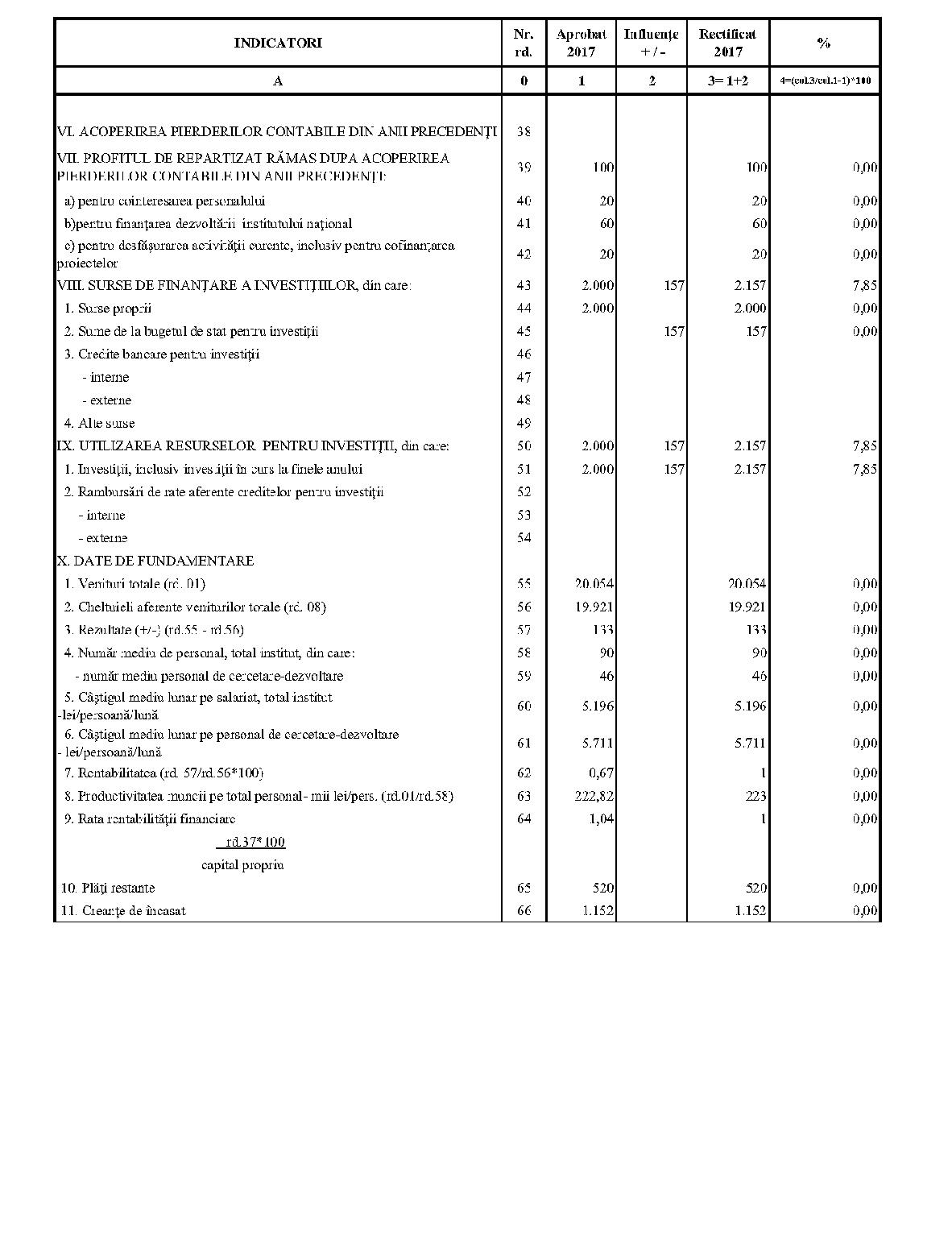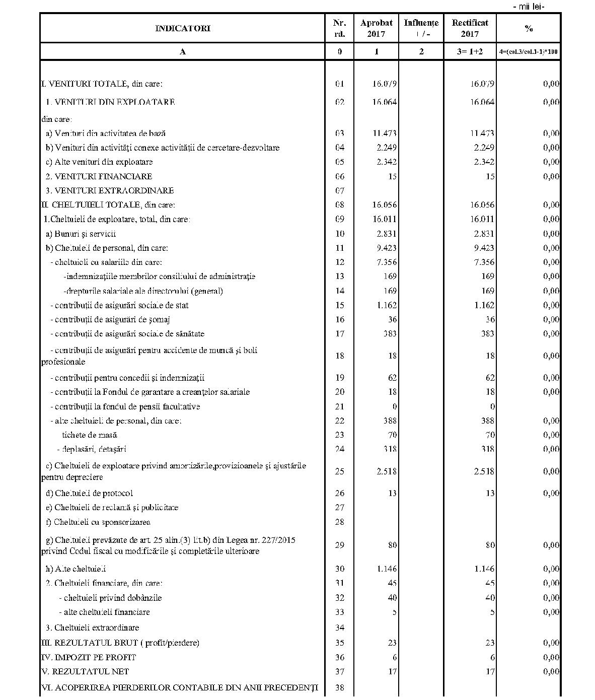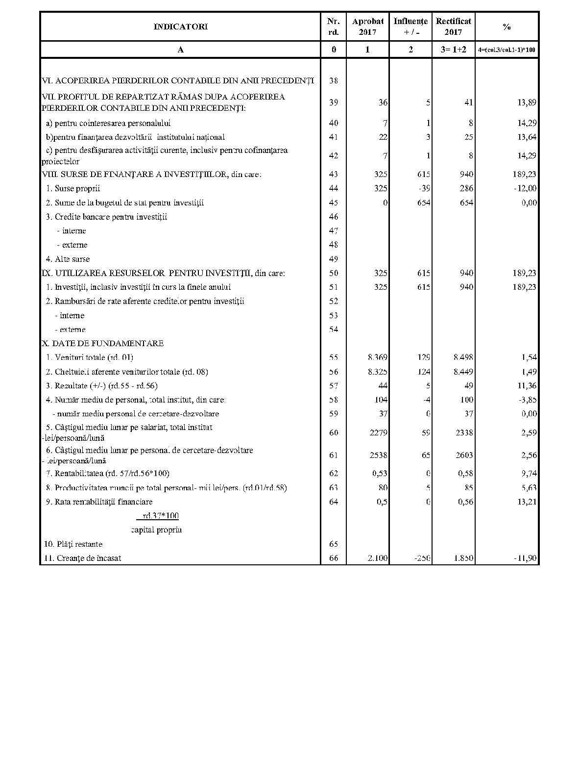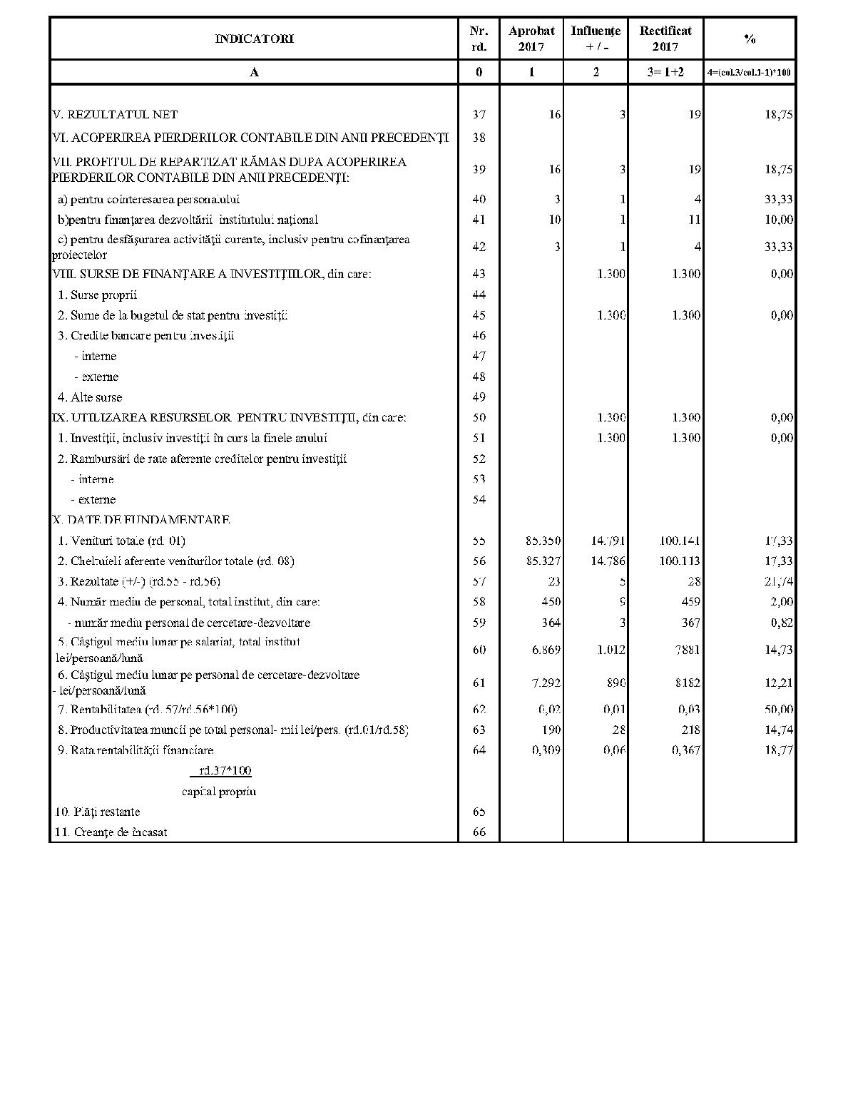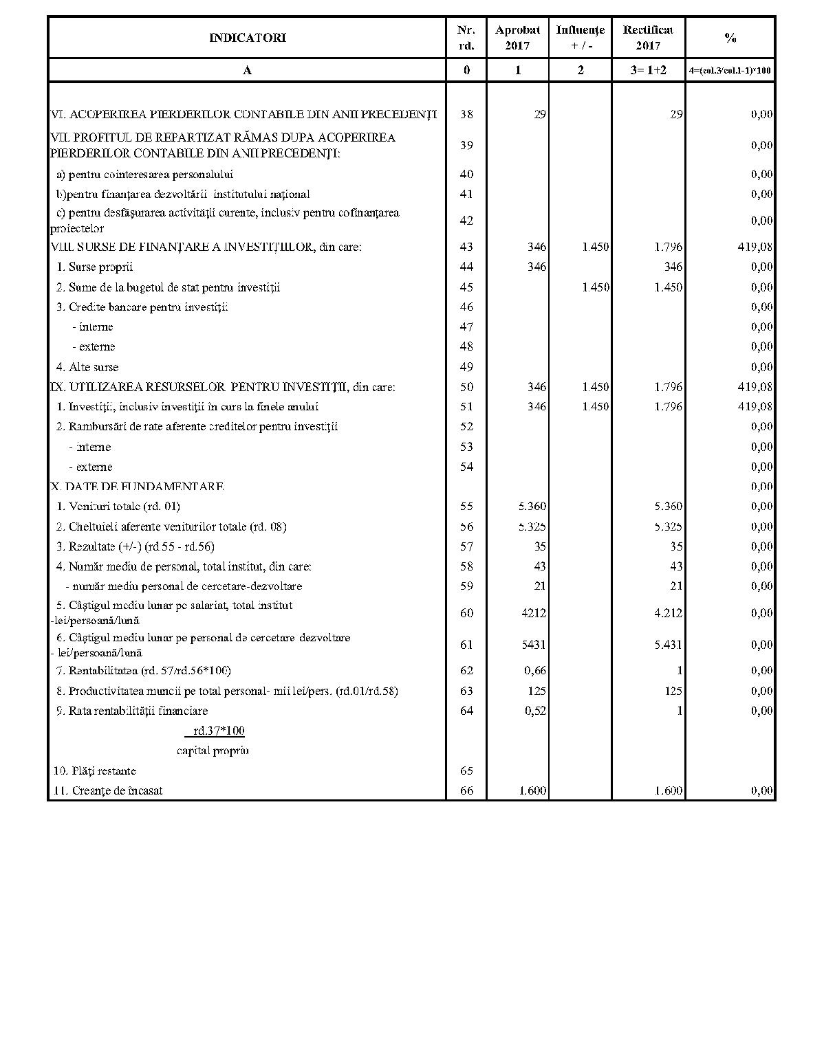 Având în vedere prevederile art. 24 alin. (2) din Ordonanţa Guvernului nr. 57/2002 privind cercetarea ştiinţifică şi dezvoltarea tehnologică, aprobată cu modificări şi completări prin Legea nr. 324/2003, cu modificările şi completările ulterioare,în conformitate cu Ordonanţa de urgenţă a Guvernului nr. 1/2017 pentru stabilirea unor măsuri în domeniul administraţiei publice centrale şi pentru modificarea şi completarea unor acte normative, aprobată cu modificări şi completări prin Legea nr. 129/2017, cu modificările şi completările ulterioare,în temeiul prevederilor art. 10 alin. (3) din Hotărârea Guvernului nr. 13/2017 privind organizarea şi funcţionarea Ministerului Cercetării şi Inovării,ministrul cercetării şi inovării emite prezentul ordin. Articolul 1Se aprobă bugetele de venituri şi cheltuieli rectificate pe anul 2017 ale institutelor naţionale de cercetare-dezvoltare în coordonarea Ministerului Cercetării şi Inovării, prevăzute în anexele nr. 1-33*), care fac parte integrantă din prezentul ordin. *) Anexele nr. 1-33 sunt reproduse în facsimil. Articolul 2(1) Cheltuielile totale aferente veniturilor înscrise în bugetele de venituri şi cheltuieli rectificate prevăzute la art. 1 reprezintă limite maxime ce nu pot fi depăşite.(2) În cazul în care, în execuţie, se înregistrează nerealizări ale veniturilor aprobate, institutele naţionale de cercetare-dezvoltare vor efectua cheltuieli în funcţie de realizarea veniturilor, cu încadrarea în indicatorii de eficienţă aprobaţi. Articolul 3Institutele naţionale de cercetare-dezvoltare în coordonarea Ministerului Cercetării şi Inovării vor duce la îndeplinire prevederile prezentului ordin. Articolul 4 Prezentul ordin se publică în Monitorul Oficial al României, Partea I. Ministrul cercetării şi inovării, Puiu-Lucian Georgescu ANEXA Nr. 1MINISTERUL CERCETĂRII ŞI INOVĂRII INSTITUTUL NAŢIONAL DE CERCETARE-DEZVOLTARE TURBOMOTOARE - COMOTI BUCUREŞTI BUGETUL DE VENITURI ŞI CHELTUIELI RECTIFICAT pe anul 2017 ANEXA Nr. 2MINISTERUL CERCETĂRII ŞI INOVĂRII INSTITUTUL NAŢIONAL DE CERCETARE-DEZVOLTARE ÎN DOMENIUL GEOLOGIEI, GEOFIZICII, GEOCHIMIEI ŞI TELEDETECŢIEI - IGR BUCUREŞTI BUGETUL DE VENITURI ŞI CHELTUIELI RECTIFICAT pe anul 2017 ANEXA Nr. 3MINISTERUL CERCETĂRII ŞI INOVĂRII INSTITUTUL NAŢIONAL DE CERCETARE-DEZVOLTARE PENTRU TEXTILE ŞI PIELĂRIE - INCDTP BUCUREŞTI BUGETUL DE VENITURI ŞI CHELTUIELI RECTIFICAT pe anul 2017 ANEXA Nr. 4MINISTERUL CERCETĂRII ŞI INOVĂRII INSTITUTUL NAŢIONAL DE CERCETARE-DEZVOLTARE PENTRU MAŞINI AGRICOLE ŞI INSTALAŢII DESTINATE AGRICULTURII ŞI INDUSTRIEI ALIMENTARE - INMA BUCUREŞTI BUGETUL DE VENITURI ŞI CHELTUIELI RECTIFICAT pe anul 2017 ANEXA Nr. 5MINISTERUL CERCETĂRII ŞI INOVĂRII INSTITUTUL NAŢIONAL DE CERCETARE-DEZVOLTARE PENTRU FIZICA LASERILOR, PLASMEI ŞI RADIAŢIEI - INFLPR BUCUREŞTI BUGETUL DE VENITURI ŞI CHELTUIELI RECTIFICAT pe anul 2017 ANEXA Nr. 6MINISTERUL CERCETĂRII ŞI INOVĂRII INSTITUTUL NAŢIONAL DE CERCETARE-DEZVOLTARE PENTRU FIZICA MATERIALELOR - INCDFM BUCUREŞTI BUGETUL DE VENITURI ŞI CHELTUIELI RECTIFICAT pe anul 2017 ANEXA Nr. 7MINISTERUL CERCETĂRII ŞI INOVĂRII INSTITUTUL NAŢIONAL DE CERCETARE-DEZVOLTARE PENTRU FIZICA PĂMÂNTULUI - INCDFB BUCUREŞTI BUGETUL DE VENITURI ŞI CHELTUIELI RECTIFICAT pe anul 2017 ANEXA Nr. 8MINISTERUL CERCETĂRII ŞI INOVĂRII INSTITUTUL NAŢIONAL DE CERCETARE-DEZVOLTARE CHIMICO-FARMACEUTICĂ - ICCF BUCUREŞTI BUGETUL DE VENITURI ŞI CHELTUIELI RECTIFICAT pe anul 2017 ANEXA Nr. 9MINISTERUL CERCETĂRII ŞI INOVĂRII INSTITUTUL NAŢIONAL DE CERCETARE-DEZVOLTARE PENTRU ELECTROCHIMIE ŞI MATERIE CONDENSATĂ - INCEMC TIMIŞOARA BUGETUL DE VENITURI ŞI CHELTUIELI RECTIFICAT pe anul 2017 ANEXA Nr. 10MINISTERUL CERCETĂRII ŞI INOVĂRII INSTITUTUL NAŢIONAL DE CERCETARE-DEZVOLTARE PENTRU GEOLOGIE ŞI GEOECOLOGIE MARINĂ - GEOECOMAR BUCUREŞTI BUGETUL DE VENITURI ŞI CHELTUIELI RECTIFICAT pe anul 2017 ANEXA Nr. 11MINISTERUL CERCETĂRII ŞI INOVĂRII INSTITUTUL NAŢIONAL DE CERCETARE-DEZVOLTARE PENTRU ŞTIINŢE BIOLOGICE - INCDSB BUCUREŞTI BUGETUL DE VENITURI ŞI CHELTUIELI RECTIFICAT pe anul 2017 ANEXA Nr. 12MINISTERUL CERCETĂRII ŞI INOVĂRII INSTITUTUL NAŢIONAL DE CERCETARE-DEZVOLTARE PENTRU MICROTEHNOLOGIE IMT - BUCUREŞTI BUGETUL DE VENITURI ŞI CHELTUIELI RECTIFICAT pe anul 2017 ANEXA Nr. 13MINISTERUL CERCETĂRII ŞI INOVĂRII INSTITUTUL NAŢIONAL DE CERCETARE-DEZVOLTARE PENTRU INGINERIE ELECTRICĂ CERCETĂRI AVANSATE ICPE-CA BUCUREŞTI BUGETUL DE VENITURI ŞI CHELTUIELI RECTIFICAT pe anul 2017 ANEXA Nr. 14MINISTERUL CERCETĂRII ŞI INOVĂRII INSTITUTUL NAŢIONAL DE CERCETARE-DEZVOLTARE AEROSPAŢIALĂ „ELIE CARAFOLI" - I.N.C.A.S. BUGETUL DE VENITURI ŞI CHELTUIELI RECTIFICAT pe anul 2017 ANEXA Nr. 15MINISTERUL CERCETĂRII ŞI INOVĂRII INSTITUTUL NAŢIONAL DE CERCETARE-DEZVOLTARE PENTRU MECATRONICĂ ŞI TEHNICA MĂSURĂRII - INCDMTM BUCUREŞTI BUGETUL DE VENITURI ŞI CHELTUIELI RECTIFICAT pe anul 2017 ANEXA Nr. 16MINISTERUL CERCETĂRII ŞI INOVĂRII INSTITUTUL NAŢIONAL DE CERCETARE-DEZVOLTARE PENTRU ECOLOGIE INDUSTRIALĂ - ECOIND BUCUREŞTI BUGETUL DE VENITURI ŞI CHELTUIELI RECTIFICAT pe anul 2017 ANEXA Nr. 17MINISTERUL CERCETĂRII ŞI INOVĂRII INSTITUTUL NAŢIONAL DE CERCETARE-DEZVOLTARE ÎN SUDURĂ ŞI ÎNCERCĂRI DE MATERIALE - ISIM TIMIŞOARA BUGETUL DE VENITURI ŞI CHELTUIELI RECTIFICAT pe anul 2017 ANEXA Nr. 18MINISTERUL CERCETĂRII ŞI INOVĂRII INSTITUTUL NAŢIONAL DE CERCETARE-DEZVOLTARE PENTRU CHIMIE ŞI PETROCHIMIE - ICECHIM BUCUREŞTI BUGETUL DE VENITURI ŞI CHELTUIELI RECTIFICAT pe anul 2017 ANEXA Nr. 19MINISTERUL CERCETĂRII ŞI INOVĂRII INSTITUTUL NAŢIONAL PENTRU CERCETARE-DEZVOLTARE PENTRU METALE NEFEROASE ŞI RARE - IMNR BUCUREŞTI BUGETUL DE VENITURI ŞI CHELTUIELI RECTIFICAT pe anul 2017 ANEXA Nr. 20MINISTERUL CERCETĂRII ŞI INOVĂRII INSTITUTUL NAŢIONAL DE CERCETARE-DEZVOLTARE PENTRU SECURITATE MINIERĂ ŞI PROTECŢI