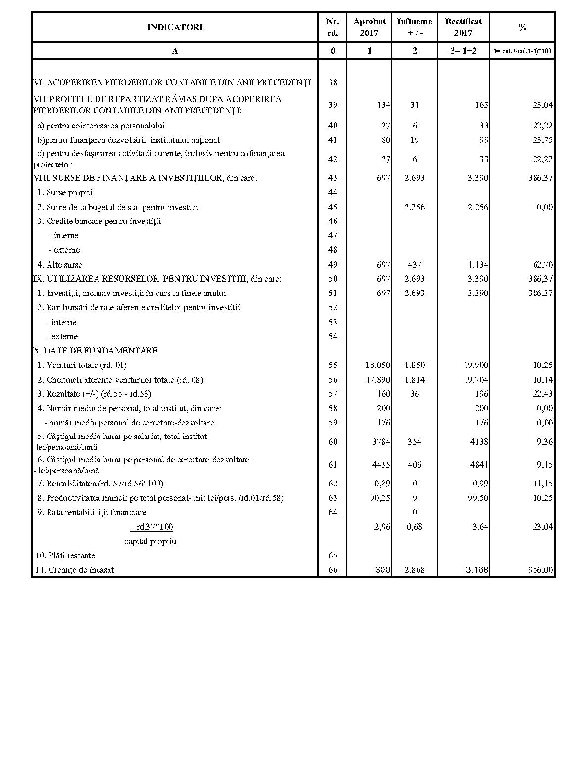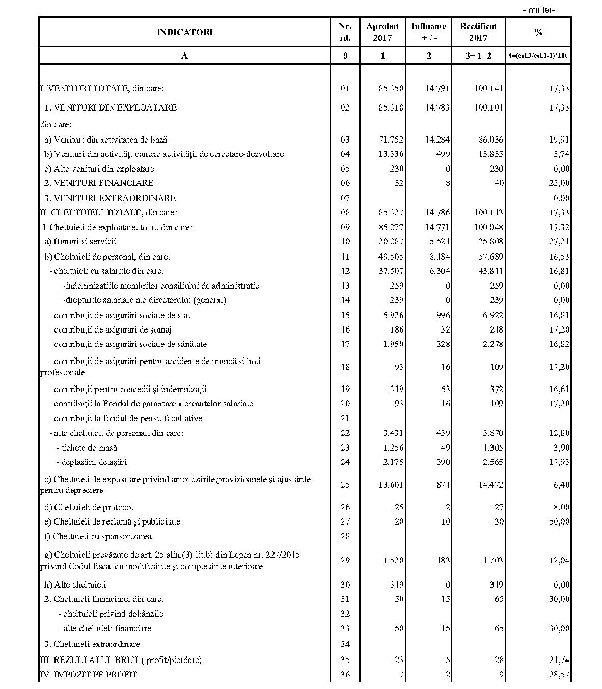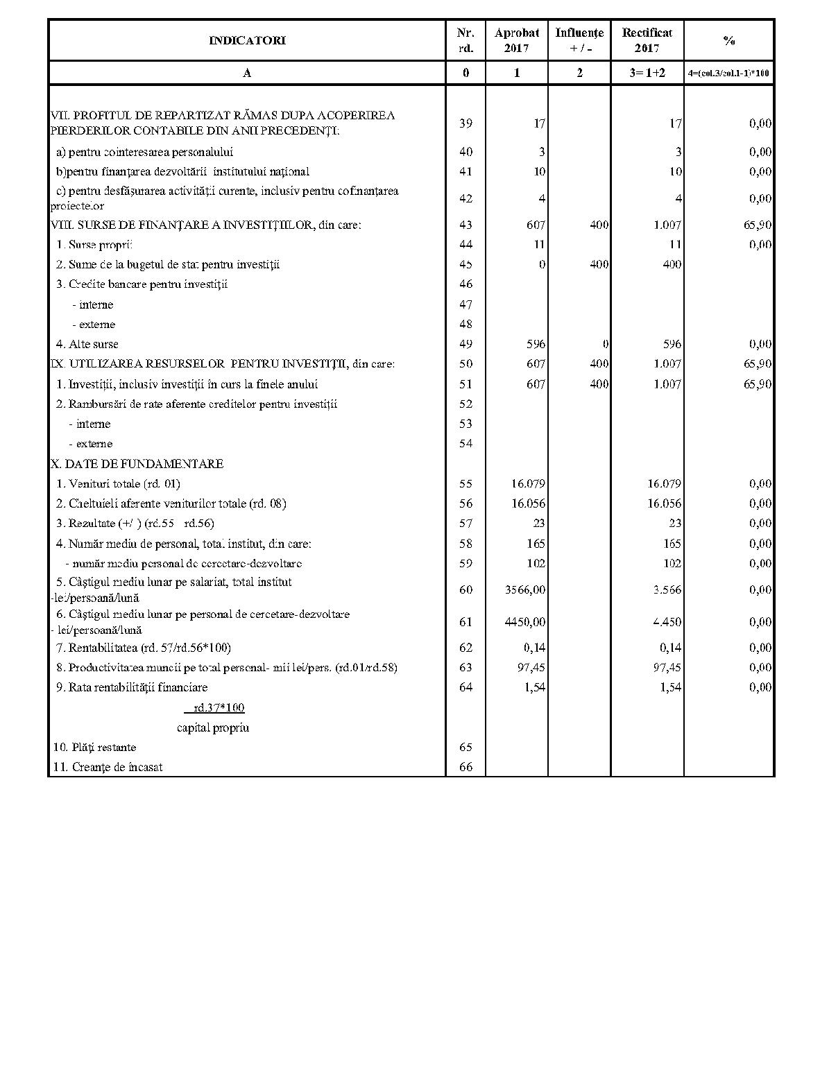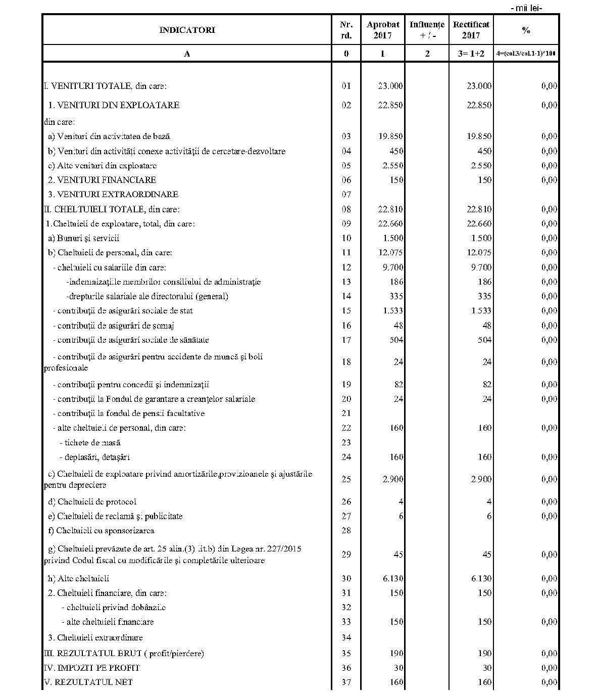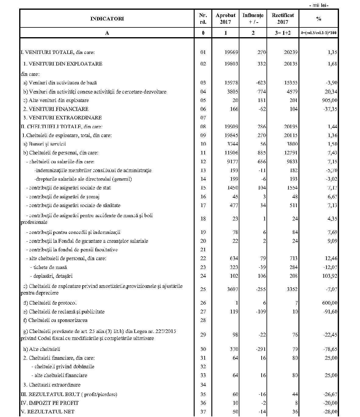 Având în vedere prevederile art. 24 alin. (2) din Ordonanţa Guvernului nr. 57/2002 privind cercetarea ştiinţifică şi dezvoltarea tehnologică, aprobată cu modificări şi completări prin Legea nr. 324/2003, cu modificările şi completările ulterioare,în conformitate cu Ordonanţa de urgenţă a Guvernului nr. 1/2017 pentru stabilirea unor măsuri în domeniul administraţiei publice centrale şi pentru modificarea şi completarea unor acte normative, aprobată cu modificări şi completări prin Legea nr. 129/2017, cu modificările şi completările ulterioare,în temeiul prevederilor art. 10 alin. (3) din Hotărârea Guvernului nr. 13/2017 privind organizarea şi funcţionarea Ministerului Cercetării şi Inovării,ministrul cercetării şi inovării emite prezentul ordin. Articolul 1Se aprobă bugetele de venituri şi cheltuieli rectificate pe anul 2017 ale institutelor naţionale de cercetare-dezvoltare în coordonarea Ministerului Cercetării şi Inovării, prevăzute în anexele nr. 1-33*), care fac parte integrantă din prezentul ordin. *) Anexele nr. 1-33 sunt reproduse în facsimil. Articolul 2(1) Cheltuielile totale aferente veniturilor înscrise în bugetele de venituri şi cheltuieli rectificate prevăzute la art. 1 reprezintă limite maxime ce nu pot fi depăşite.(2) În cazul în care, în execuţie, se înregistrează nerealizări ale veniturilor aprobate, institutele naţionale de cercetare-dezvoltare vor efectua cheltuieli în funcţie de realizarea veniturilor, cu încadrarea în indicatorii de eficienţă aprobaţi. Articolul 3Institutele naţionale de cercetare-dezvoltare în coordonarea Ministerului Cercetării şi Inovării vor duce la îndeplinire prevederile prezentului ordin. Articolul 4 Prezentul ordin se publică în Monitorul Oficial al României, Partea I. Ministrul cercetării şi inovării, Puiu-Lucian Georgescu ANEXA Nr. 1MINISTERUL CERCETĂRII ŞI INOVĂRII INSTITUTUL NAŢIONAL DE CERCETARE-DEZVOLTARE TURBOMOTOARE - COMOTI BUCUREŞTI BUGETUL DE VENITURI ŞI CHELTUIELI RECTIFICAT pe anul 2017 ANEXA Nr. 2MINISTERUL CERCETĂRII ŞI INOVĂRII INSTITUTUL NAŢIONAL DE CERCETARE-DEZVOLTARE ÎN DOMENIUL GEOLOGIEI, GEOFIZICII, GEOCHIMIEI ŞI TELEDETECŢIEI - IGR BUCUREŞTI BUGETUL DE VENITURI ŞI CHELTUIELI RECTIFICAT pe anul 2017 ANEXA Nr. 3MINISTERUL CERCETĂRII ŞI INOVĂRII INSTITUTUL NAŢIONAL DE CERCETARE-DEZVOLTARE PENTRU TEXTILE ŞI PIELĂRIE - INCDTP BUCUREŞTI BUGETUL DE VENITURI ŞI CHELTUIELI RECTIFICAT pe anul 2017 ANEXA Nr. 4MINISTERUL CERCETĂRII ŞI INOVĂRII INSTITUTUL NAŢIONAL DE CERCETARE-DEZVOLTARE PENTRU MAŞINI AGRICOLE ŞI INSTALAŢII DESTINATE AGRICULTURII ŞI INDUSTRIEI ALIMENTARE - INMA BUCUREŞTI BUGETUL DE VENITURI ŞI CHELTUIELI RECTIFICAT pe anul 2017 ANEXA Nr. 5MINISTERUL CERCETĂRII ŞI INOVĂRII INSTITUTUL NAŢIONAL DE CERCETARE-DEZVOLTARE PENTRU FIZICA LASERILOR, PLASMEI ŞI RADIAŢIEI - INFLPR BUCUREŞTI BUGETUL DE VENITURI ŞI CHELTUIELI RECTIFICAT pe anul 2017 ANEXA Nr. 6MINISTERUL CERCETĂRII ŞI INOVĂRII INSTITUTUL NAŢIONAL DE CERCETARE-DEZVOLTARE PENTRU FIZICA MATERIALELOR - INCDFM BUCUREŞTI BUGETUL DE VENITURI ŞI CHELTUIELI RECTIFICAT pe anul 2017 ANEXA Nr. 7MINISTERUL CERCETĂRII ŞI INOVĂRII INSTITUTUL NAŢIONAL DE CERCETARE-DEZVOLTARE PENTRU FIZICA PĂMÂNTULUI - INCDFB BUCUREŞTI BUGETUL DE VENITURI ŞI CHELTUIELI RECTIFICAT pe anul 2017 ANEXA Nr. 8MINISTERUL CERCETĂRII ŞI INOVĂRII INSTITUTUL NAŢIONAL DE CERCETARE-DEZVOLTARE CHIMICO-FARMACEUTICĂ - ICCF BUCUREŞTI BUGETUL DE VENITURI ŞI CHELTUIELI RECTIFICAT pe anul 2017 ANEXA Nr. 9MINISTERUL CERCETĂRII ŞI INOVĂRII INSTITUTUL NAŢIONAL DE CERCETARE-DEZVOLTARE PENTRU ELECTROCHIMIE ŞI MATERIE CONDENSATĂ - INCEMC TIMIŞOARA BUGETUL DE VENITURI ŞI CHELTUIELI RECTIFICAT pe anul 2017 ANEXA Nr. 10MINISTERUL CERCETĂRII ŞI INOVĂRII INSTITUTUL NAŢIONAL DE CERCETARE-DEZVOLTARE PENTRU GEOLOGIE ŞI GEOECOLOGIE MARINĂ - GEOECOMAR BUCUREŞTI BUGETUL DE VENITURI ŞI CHELTUIELI RECTIFICAT pe anul 2017 ANEXA Nr. 11MINISTERUL CERCETĂRII ŞI INOVĂRII INSTITUTUL NAŢIONAL DE CERCETARE-DEZVOLTARE PENTRU ŞTIINŢE BIOLOGICE - INCDSB BUCUREŞTI BUGETUL DE VENITURI ŞI CHELTUIELI RECTIFICAT pe anul 2017 ANEXA Nr. 12MINISTERUL CERCETĂRII ŞI INOVĂRII INSTITUTUL NAŢIONAL DE CERCETARE-DEZVOLTARE PENTRU MICROTEHNOLOGIE IMT - BUCUREŞTI BUGETUL DE VENITURI ŞI CHELTUIELI RECTIFICAT pe anul 2017 ANEXA Nr. 13MINISTERUL CERCETĂRII ŞI INOVĂRII INSTITUTUL NAŢIONAL DE CERCETARE-DEZVOLTARE PENTRU INGINERIE ELECTRICĂ CERCETĂRI AVANSATE ICPE-CA BUCUREŞTI BUGETUL DE VENITURI ŞI CHELTUIELI RECTIFICAT pe anul 2017 ANEXA Nr. 14MINISTERUL CERCETĂRII ŞI INOVĂRII INSTITUTUL NAŢIONAL DE CERCETARE-DEZVOLTARE AEROSPAŢIALĂ „ELIE CARAFOLI" - I.N.C.A.S. BUGETUL DE VENITURI ŞI CHELTUIELI RECTIFICAT pe anul 2017 ANEXA Nr. 15MINISTERUL CERCETĂRII ŞI INOVĂRII INSTITUTUL NAŢIONAL DE CERCETARE-DEZVOLTARE PENTRU MECATRONICĂ ŞI TEHNICA MĂSURĂRII - INCDMTM BUCUREŞTI BUGETUL DE VENITURI ŞI CHELTUIELI RECTIFICAT pe anul 2017 ANEXA Nr. 16MINISTERUL CERCETĂRII ŞI INOVĂRII INSTITUTUL NAŢIONAL DE CERCETARE-DEZVOLTARE PENTRU ECOLOGIE INDUSTRIALĂ - ECOIND BUCUREŞTI BUGETUL DE VENITURI ŞI CHELTUIELI RECTIFICAT pe anul 2017 ANEXA Nr. 17MINISTERUL CERCETĂRII ŞI INOVĂRII INSTITUTUL NAŢIONAL DE CERCETARE-DEZVOLTARE ÎN SUDURĂ ŞI ÎNCERCĂRI DE MATERIALE - ISIM TIMIŞOARA BUGETUL DE VENITURI ŞI CHELTUIELI RECTIFICAT pe anul 2017 ANEXA Nr. 18MINISTERUL CERCETĂRII ŞI INOVĂRII INSTITUTUL NAŢIONAL DE CERCETARE-DEZVOLTARE PENTRU CHIMIE ŞI PETROCHIMIE - ICECHIM BUCUREŞTI BUGETUL DE VENITURI ŞI CHELTUIELI RECTIFICAT pe anul 2017 ANEXA Nr. 19MINISTERUL CERCETĂRII ŞI INOVĂRII INSTITUTUL NAŢIONAL PENTRU CERCETARE-DEZVOLTARE PENTRU METALE NEFEROASE ŞI RARE - IMNR BUCUREŞTI BUGETUL DE VENITURI ŞI CHELTUIELI RECTIFICAT pe anul 2017 ANEXA Nr. 20MINISTERUL CERCETĂRII ŞI INOVĂRII INSTITUTUL NAŢIONAL DE CERCETARE-DEZVOLTARE PENTRU SECURITATE MINIERĂ ŞI PROTECŢI