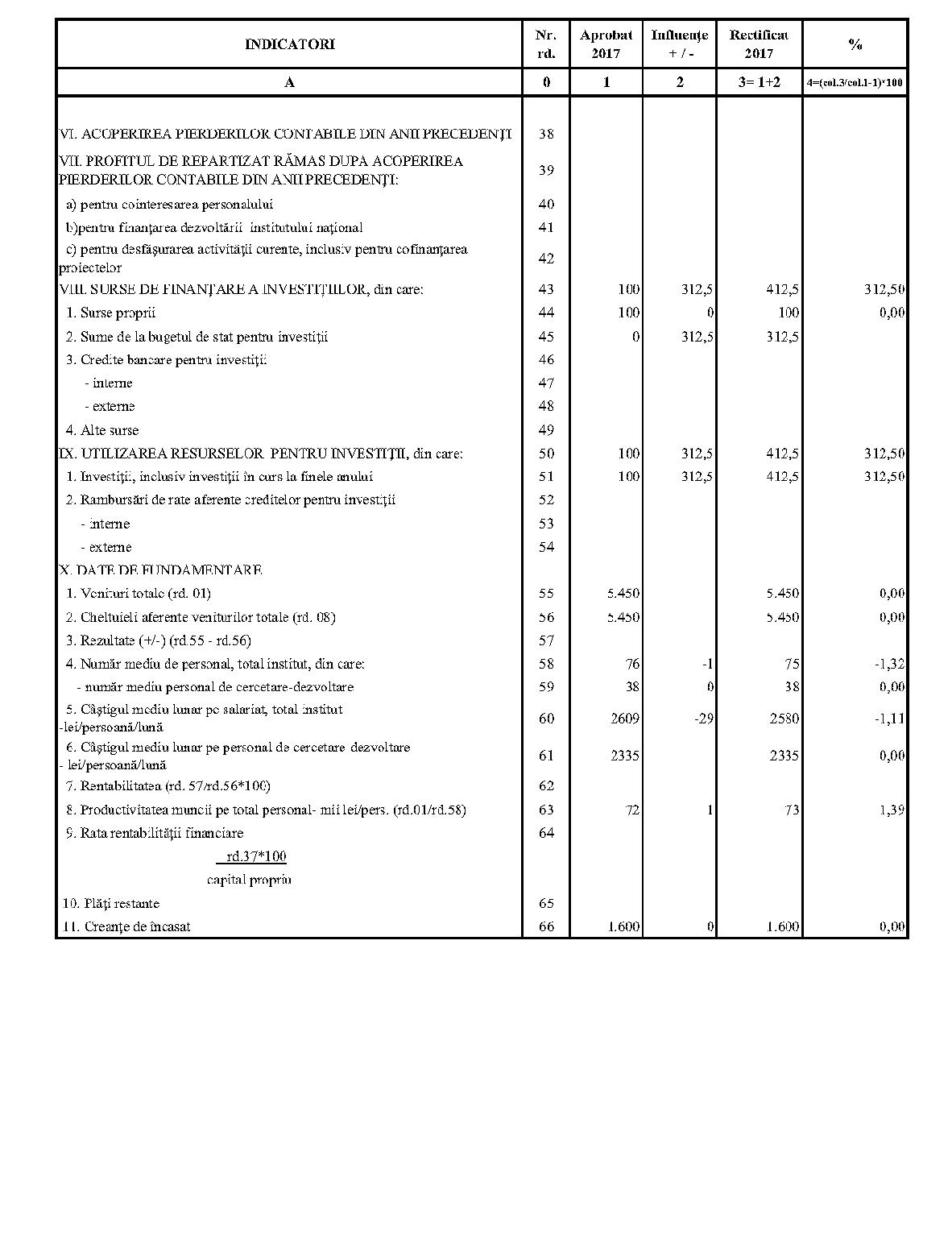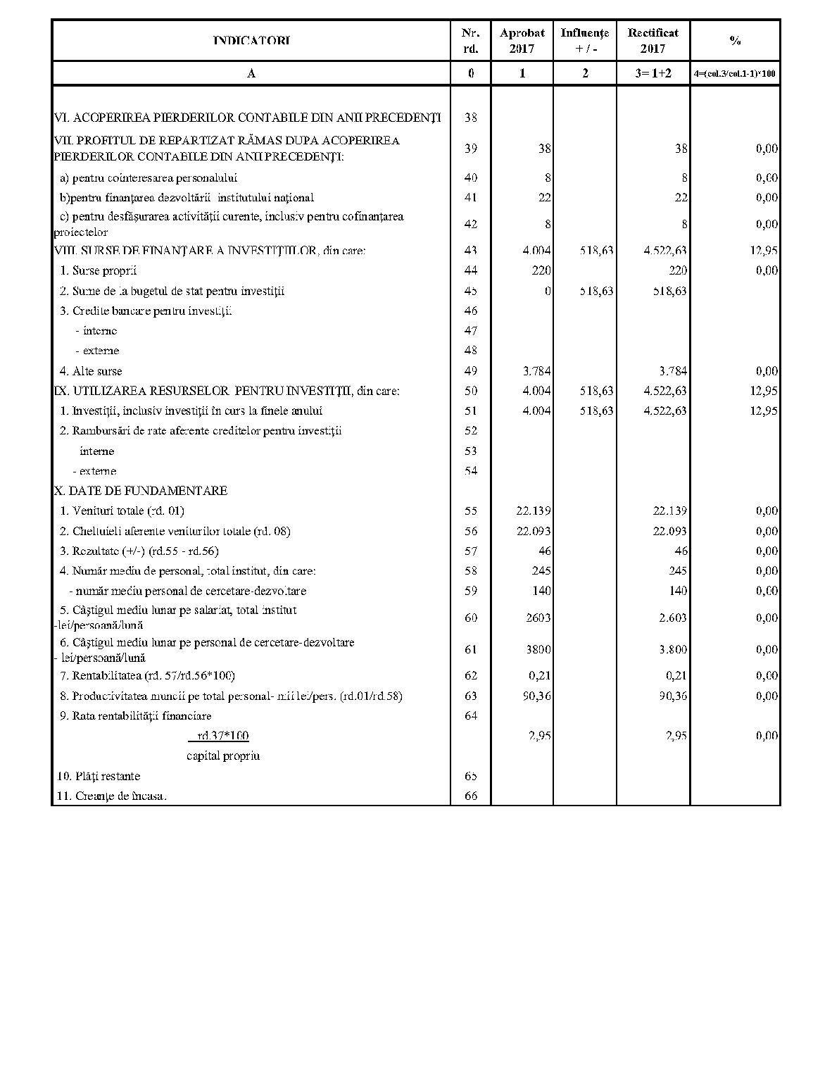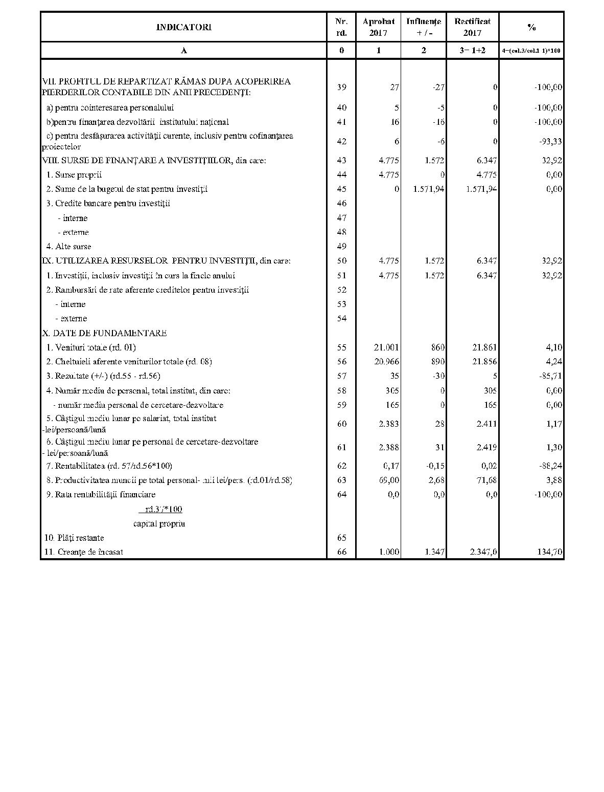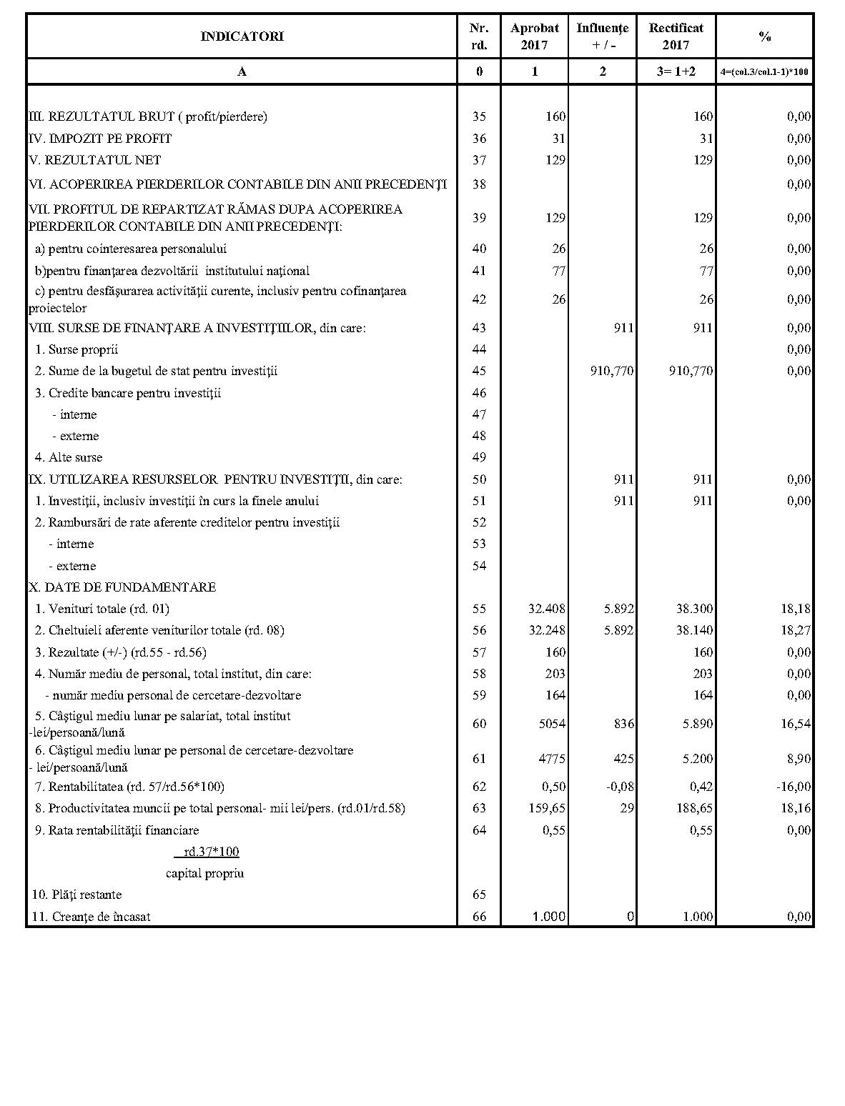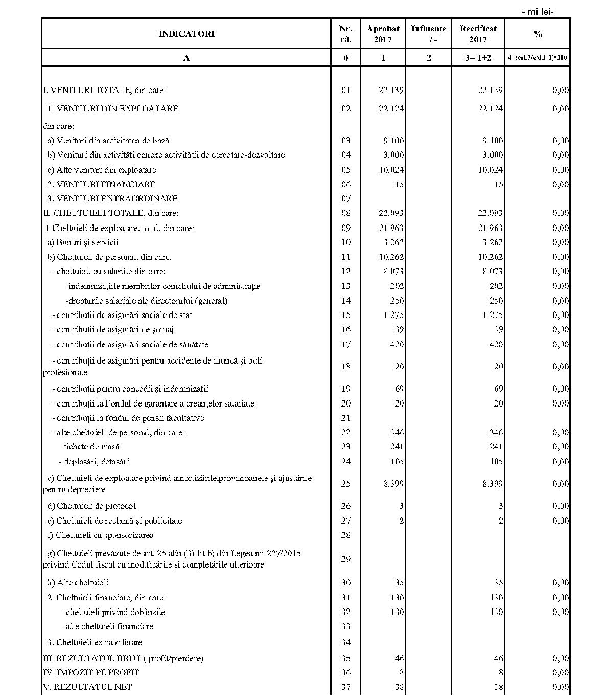 Având în vedere prevederile art. 24 alin. (2) din Ordonanţa Guvernului nr. 57/2002 privind cercetarea ştiinţifică şi dezvoltarea tehnologică, aprobată cu modificări şi completări prin Legea nr. 324/2003, cu modificările şi completările ulterioare,în conformitate cu Ordonanţa de urgenţă a Guvernului nr. 1/2017 pentru stabilirea unor măsuri în domeniul administraţiei publice centrale şi pentru modificarea şi completarea unor acte normative, aprobată cu modificări şi completări prin Legea nr. 129/2017, cu modificările şi completările ulterioare,în temeiul prevederilor art. 10 alin. (3) din Hotărârea Guvernului nr. 13/2017 privind organizarea şi funcţionarea Ministerului Cercetării şi Inovării,ministrul cercetării şi inovării emite prezentul ordin. Articolul 1Se aprobă bugetele de venituri şi cheltuieli rectificate pe anul 2017 ale institutelor naţionale de cercetare-dezvoltare în coordonarea Ministerului Cercetării şi Inovării, prevăzute în anexele nr. 1-33*), care fac parte integrantă din prezentul ordin. *) Anexele nr. 1-33 sunt reproduse în facsimil. Articolul 2(1) Cheltuielile totale aferente veniturilor înscrise în bugetele de venituri şi cheltuieli rectificate prevăzute la art. 1 reprezintă limite maxime ce nu pot fi depăşite.(2) În cazul în care, în execuţie, se înregistrează nerealizări ale veniturilor aprobate, institutele naţionale de cercetare-dezvoltare vor efectua cheltuieli în funcţie de realizarea veniturilor, cu încadrarea în indicatorii de eficienţă aprobaţi. Articolul 3Institutele naţionale de cercetare-dezvoltare în coordonarea Ministerului Cercetării şi Inovării vor duce la îndeplinire prevederile prezentului ordin. Articolul 4 Prezentul ordin se publică în Monitorul Oficial al României, Partea I. Ministrul cercetării şi inovării, Puiu-Lucian Georgescu ANEXA Nr. 1MINISTERUL CERCETĂRII ŞI INOVĂRII INSTITUTUL NAŢIONAL DE CERCETARE-DEZVOLTARE TURBOMOTOARE - COMOTI BUCUREŞTI BUGETUL DE VENITURI ŞI CHELTUIELI RECTIFICAT pe anul 2017 ANEXA Nr. 2MINISTERUL CERCETĂRII ŞI INOVĂRII INSTITUTUL NAŢIONAL DE CERCETARE-DEZVOLTARE ÎN DOMENIUL GEOLOGIEI, GEOFIZICII, GEOCHIMIEI ŞI TELEDETECŢIEI - IGR BUCUREŞTI BUGETUL DE VENITURI ŞI CHELTUIELI RECTIFICAT pe anul 2017 ANEXA Nr. 3MINISTERUL CERCETĂRII ŞI INOVĂRII INSTITUTUL NAŢIONAL DE CERCETARE-DEZVOLTARE PENTRU TEXTILE ŞI PIELĂRIE - INCDTP BUCUREŞTI BUGETUL DE VENITURI ŞI CHELTUIELI RECTIFICAT pe anul 2017 ANEXA Nr. 4MINISTERUL CERCETĂRII ŞI INOVĂRII INSTITUTUL NAŢIONAL DE CERCETARE-DEZVOLTARE PENTRU MAŞINI AGRICOLE ŞI INSTALAŢII DESTINATE AGRICULTURII ŞI INDUSTRIEI ALIMENTARE - INMA BUCUREŞTI BUGETUL DE VENITURI ŞI CHELTUIELI RECTIFICAT pe anul 2017 ANEXA Nr. 5MINISTERUL CERCETĂRII ŞI INOVĂRII INSTITUTUL NAŢIONAL DE CERCETARE-DEZVOLTARE PENTRU FIZICA LASERILOR, PLASMEI ŞI RADIAŢIEI - INFLPR BUCUREŞTI BUGETUL DE VENITURI ŞI CHELTUIELI RECTIFICAT pe anul 2017 ANEXA Nr. 6MINISTERUL CERCETĂRII ŞI INOVĂRII INSTITUTUL NAŢIONAL DE CERCETARE-DEZVOLTARE PENTRU FIZICA MATERIALELOR - INCDFM BUCUREŞTI BUGETUL DE VENITURI ŞI CHELTUIELI RECTIFICAT pe anul 2017 ANEXA Nr. 7MINISTERUL CERCETĂRII ŞI INOVĂRII INSTITUTUL NAŢIONAL DE CERCETARE-DEZVOLTARE PENTRU FIZICA PĂMÂNTULUI - INCDFB BUCUREŞTI BUGETUL DE VENITURI ŞI CHELTUIELI RECTIFICAT pe anul 2017 ANEXA Nr. 8MINISTERUL CERCETĂRII ŞI INOVĂRII INSTITUTUL NAŢIONAL DE CERCETARE-DEZVOLTARE CHIMICO-FARMACEUTICĂ - ICCF BUCUREŞTI BUGETUL DE VENITURI ŞI CHELTUIELI RECTIFICAT pe anul 2017 ANEXA Nr. 9MINISTERUL CERCETĂRII ŞI INOVĂRII INSTITUTUL NAŢIONAL DE CERCETARE-DEZVOLTARE PENTRU ELECTROCHIMIE ŞI MATERIE CONDENSATĂ - INCEMC TIMIŞOARA BUGETUL DE VENITURI ŞI CHELTUIELI RECTIFICAT pe anul 2017 ANEXA Nr. 10MINISTERUL CERCETĂRII ŞI INOVĂRII INSTITUTUL NAŢIONAL DE CERCETARE-DEZVOLTARE PENTRU GEOLOGIE ŞI GEOECOLOGIE MARINĂ - GEOECOMAR BUCUREŞTI BUGETUL DE VENITURI ŞI CHELTUIELI RECTIFICAT pe anul 2017 ANEXA Nr. 11MINISTERUL CERCETĂRII ŞI INOVĂRII INSTITUTUL NAŢIONAL DE CERCETARE-DEZVOLTARE PENTRU ŞTIINŢE BIOLOGICE - INCDSB BUCUREŞTI BUGETUL DE VENITURI ŞI CHELTUIELI RECTIFICAT pe anul 2017 ANEXA Nr. 12MINISTERUL CERCETĂRII ŞI INOVĂRII INSTITUTUL NAŢIONAL DE CERCETARE-DEZVOLTARE PENTRU MICROTEHNOLOGIE IMT - BUCUREŞTI BUGETUL DE VENITURI ŞI CHELTUIELI RECTIFICAT pe anul 2017 ANEXA Nr. 13MINISTERUL CERCETĂRII ŞI INOVĂRII INSTITUTUL NAŢIONAL DE CERCETARE-DEZVOLTARE PENTRU INGINERIE ELECTRICĂ CERCETĂRI AVANSATE ICPE-CA BUCUREŞTI BUGETUL DE VENITURI ŞI CHELTUIELI RECTIFICAT pe anul 2017 ANEXA Nr. 14MINISTERUL CERCETĂRII ŞI INOVĂRII INSTITUTUL NAŢIONAL DE CERCETARE-DEZVOLTARE AEROSPAŢIALĂ „ELIE CARAFOLI" - I.N.C.A.S. BUGETUL DE VENITURI ŞI CHELTUIELI RECTIFICAT pe anul 2017 ANEXA Nr. 15MINISTERUL CERCETĂRII ŞI INOVĂRII INSTITUTUL NAŢIONAL DE CERCETARE-DEZVOLTARE PENTRU MECATRONICĂ ŞI TEHNICA MĂSURĂRII - INCDMTM BUCUREŞTI BUGETUL DE VENITURI ŞI CHELTUIELI RECTIFICAT pe anul 2017 ANEXA Nr. 16MINISTERUL CERCETĂRII ŞI INOVĂRII INSTITUTUL NAŢIONAL DE CERCETARE-DEZVOLTARE PENTRU ECOLOGIE INDUSTRIALĂ - ECOIND BUCUREŞTI BUGETUL DE VENITURI ŞI CHELTUIELI RECTIFICAT pe anul 2017 ANEXA Nr. 17MINISTERUL CERCETĂRII ŞI INOVĂRII INSTITUTUL NAŢIONAL DE CERCETARE-DEZVOLTARE ÎN SUDURĂ ŞI ÎNCERCĂRI DE MATERIALE - ISIM TIMIŞOARA BUGETUL DE VENITURI ŞI CHELTUIELI RECTIFICAT pe anul 2017 ANEXA Nr. 18MINISTERUL CERCETĂRII ŞI INOVĂRII INSTITUTUL NAŢIONAL DE CERCETARE-DEZVOLTARE PENTRU CHIMIE ŞI PETROCHIMIE - ICECHIM BUCUREŞTI BUGETUL DE VENITURI ŞI CHELTUIELI RECTIFICAT pe anul 2017 ANEXA Nr. 19MINISTERUL CERCETĂRII ŞI INOVĂRII INSTITUTUL NAŢIONAL PENTRU CERCETARE-DEZVOLTARE PENTRU METALE NEFEROASE ŞI RARE - IMNR BUCUREŞTI BUGETUL DE VENITURI ŞI CHELTUIELI RECTIFICAT pe anul 2017 ANEXA Nr. 20MINISTERUL CERCETĂRII ŞI INOVĂRII INSTITUTUL NAŢIONAL DE CERCETARE-DEZVOLTARE PENTRU SECURITATE MINIERĂ ŞI PROTECŢI