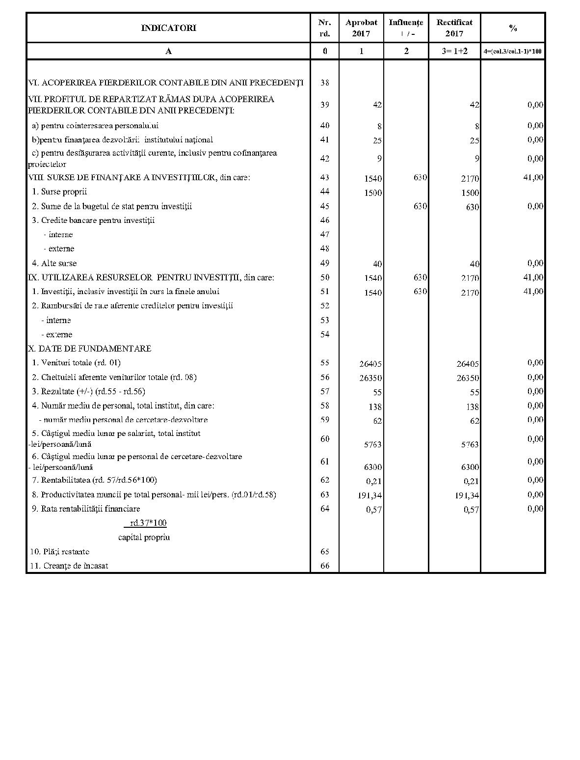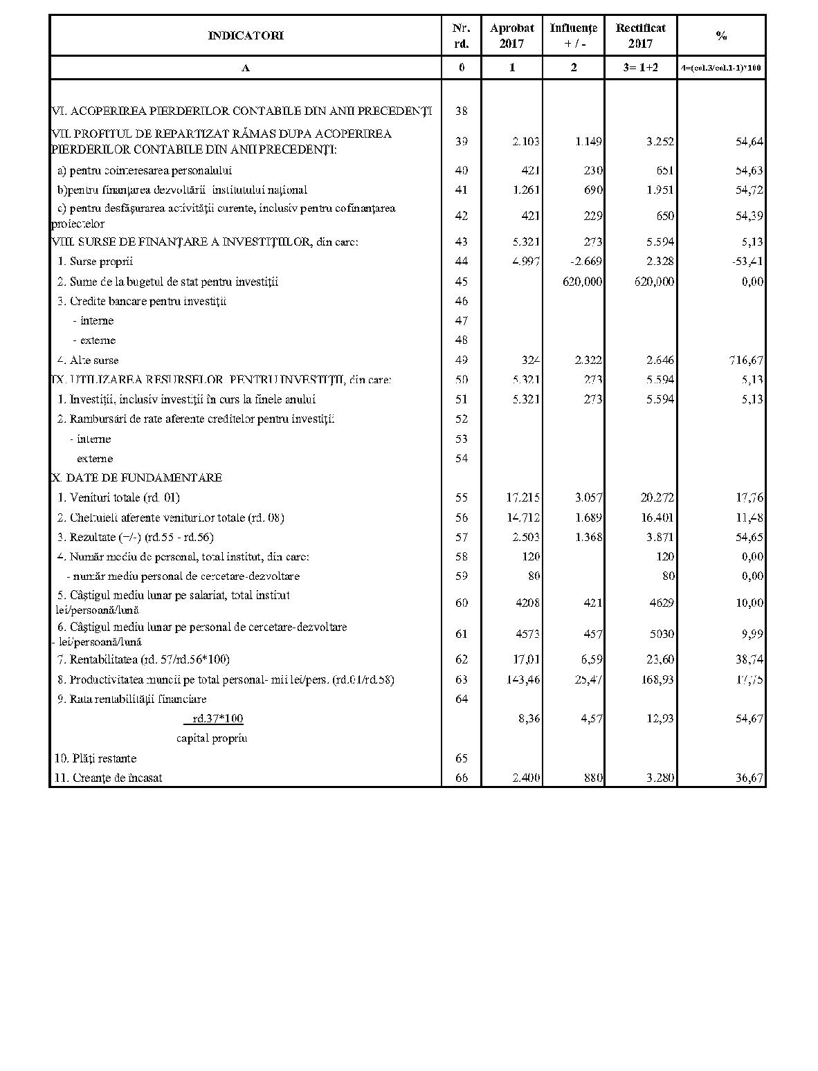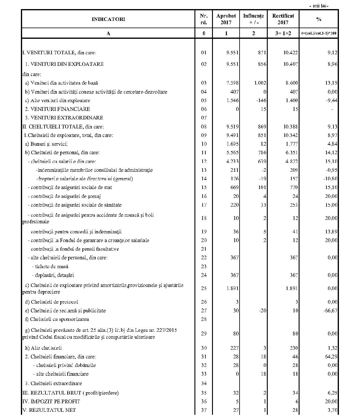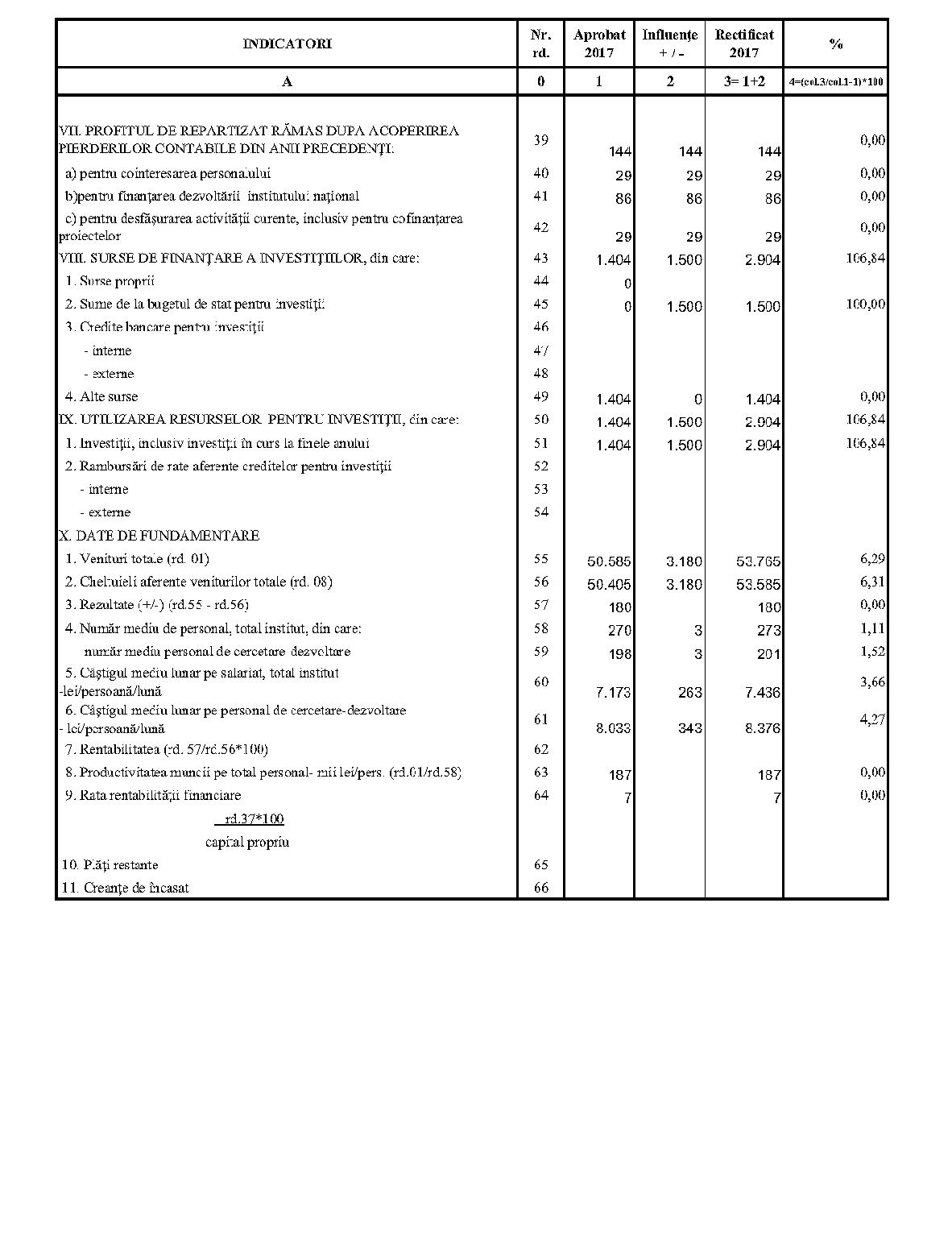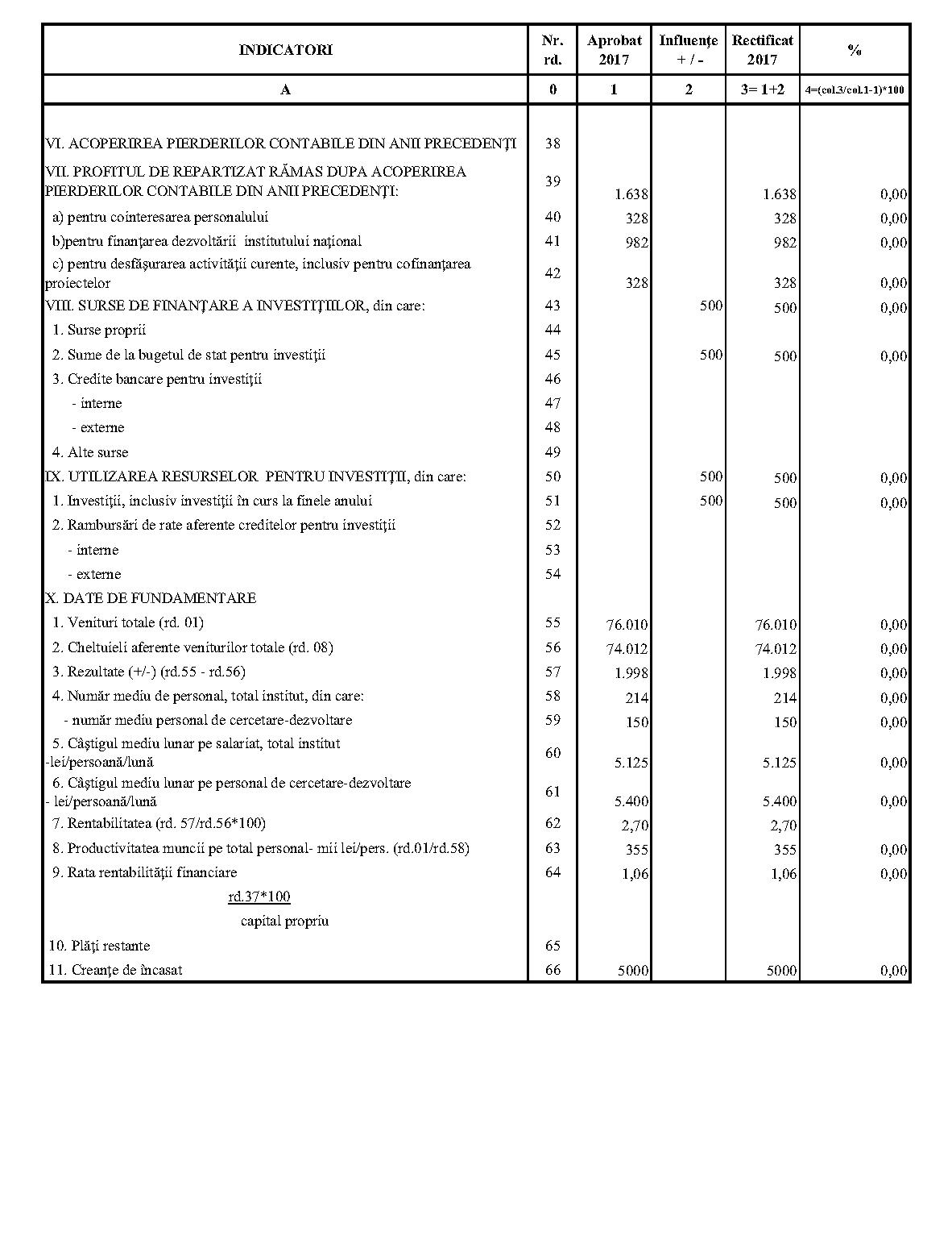Având în vedere prevederile art. 24 alin. (2) din Ordonanţa Guvernului nr. 57/2002 privind cercetarea ştiinţifică şi dezvoltarea tehnologică, aprobată cu modificări şi completări prin Legea nr. 324/2003, cu modificările şi completările ulterioare,în conformitate cu Ordonanţa de urgenţă a Guvernului nr. 1/2017 pentru stabilirea unor măsuri în domeniul administraţiei publice centrale şi pentru modificarea şi completarea unor acte normative, aprobată cu modificări şi completări prin Legea nr. 129/2017, cu modificările şi completările ulterioare,în temeiul prevederilor art. 10 alin. (3) din Hotărârea Guvernului nr. 13/2017 privind organizarea şi funcţionarea Ministerului Cercetării şi Inovării,ministrul cercetării şi inovării emite prezentul ordin. Articolul 1Se aprobă bugetele de venituri şi cheltuieli rectificate pe anul 2017 ale institutelor naţionale de cercetare-dezvoltare în coordonarea Ministerului Cercetării şi Inovării, prevăzute în anexele nr. 1-33*), care fac parte integrantă din prezentul ordin. *) Anexele nr. 1-33 sunt reproduse în facsimil. Articolul 2(1) Cheltuielile totale aferente veniturilor înscrise în bugetele de venituri şi cheltuieli rectificate prevăzute la art. 1 reprezintă limite maxime ce nu pot fi depăşite.(2) În cazul în care, în execuţie, se înregistrează nerealizări ale veniturilor aprobate, institutele naţionale de cercetare-dezvoltare vor efectua cheltuieli în funcţie de realizarea veniturilor, cu încadrarea în indicatorii de eficienţă aprobaţi. Articolul 3Institutele naţionale de cercetare-dezvoltare în coordonarea Ministerului Cercetării şi Inovării vor duce la îndeplinire prevederile prezentului ordin. Articolul 4 Prezentul ordin se publică în Monitorul Oficial al României, Partea I. Ministrul cercetării şi inovării, Puiu-Lucian Georgescu ANEXA Nr. 1MINISTERUL CERCETĂRII ŞI INOVĂRII INSTITUTUL NAŢIONAL DE CERCETARE-DEZVOLTARE TURBOMOTOARE - COMOTI BUCUREŞTI BUGETUL DE VENITURI ŞI CHELTUIELI RECTIFICAT pe anul 2017 ANEXA Nr. 2MINISTERUL CERCETĂRII ŞI INOVĂRII INSTITUTUL NAŢIONAL DE CERCETARE-DEZVOLTARE ÎN DOMENIUL GEOLOGIEI, GEOFIZICII, GEOCHIMIEI ŞI TELEDETECŢIEI - IGR BUCUREŞTI BUGETUL DE VENITURI ŞI CHELTUIELI RECTIFICAT pe anul 2017 ANEXA Nr. 3MINISTERUL CERCETĂRII ŞI INOVĂRII INSTITUTUL NAŢIONAL DE CERCETARE-DEZVOLTARE PENTRU TEXTILE ŞI PIELĂRIE - INCDTP BUCUREŞTI BUGETUL DE VENITURI ŞI CHELTUIELI RECTIFICAT pe anul 2017 ANEXA Nr. 4MINISTERUL CERCETĂRII ŞI INOVĂRII INSTITUTUL NAŢIONAL DE CERCETARE-DEZVOLTARE PENTRU MAŞINI AGRICOLE ŞI INSTALAŢII DESTINATE AGRICULTURII ŞI INDUSTRIEI ALIMENTARE - INMA BUCUREŞTI BUGETUL DE VENITURI ŞI CHELTUIELI RECTIFICAT pe anul 2017 ANEXA Nr. 5MINISTERUL CERCETĂRII ŞI INOVĂRII INSTITUTUL NAŢIONAL DE CERCETARE-DEZVOLTARE PENTRU FIZICA LASERILOR, PLASMEI ŞI RADIAŢIEI - INFLPR BUCUREŞTI BUGETUL DE VENITURI ŞI CHELTUIELI RECTIFICAT pe anul 2017 ANEXA Nr. 6MINISTERUL CERCETĂRII ŞI INOVĂRII INSTITUTUL NAŢIONAL DE CERCETARE-DEZVOLTARE PENTRU FIZICA MATERIALELOR - INCDFM BUCUREŞTI BUGETUL DE VENITURI ŞI CHELTUIELI RECTIFICAT pe anul 2017 ANEXA Nr. 7MINISTERUL CERCETĂRII ŞI INOVĂRII INSTITUTUL NAŢIONAL DE CERCETARE-DEZVOLTARE PENTRU FIZICA PĂMÂNTULUI - INCDFB BUCUREŞTI BUGETUL DE VENITURI ŞI CHELTUIELI RECTIFICAT pe anul 2017 ANEXA Nr. 8MINISTERUL CERCETĂRII ŞI INOVĂRII INSTITUTUL NAŢIONAL DE CERCETARE-DEZVOLTARE CHIMICO-FARMACEUTICĂ - ICCF BUCUREŞTI BUGETUL DE VENITURI ŞI CHELTUIELI RECTIFICAT pe anul 2017 ANEXA Nr. 9MINISTERUL CERCETĂRII ŞI INOVĂRII INSTITUTUL NAŢIONAL DE CERCETARE-DEZVOLTARE PENTRU ELECTROCHIMIE ŞI MATERIE CONDENSATĂ - INCEMC TIMIŞOARA BUGETUL DE VENITURI ŞI CHELTUIELI RECTIFICAT pe anul 2017 ANEXA Nr. 10MINISTERUL CERCETĂRII ŞI INOVĂRII INSTITUTUL NAŢIONAL DE CERCETARE-DEZVOLTARE PENTRU GEOLOGIE ŞI GEOECOLOGIE MARINĂ - GEOECOMAR BUCUREŞTI BUGETUL DE VENITURI ŞI CHELTUIELI RECTIFICAT pe anul 2017 ANEXA Nr. 11MINISTERUL CERCETĂRII ŞI INOVĂRII INSTITUTUL NAŢIONAL DE CERCETARE-DEZVOLTARE PENTRU ŞTIINŢE BIOLOGICE - INCDSB BUCUREŞTI BUGETUL DE VENITURI ŞI CHELTUIELI RECTIFICAT pe anul 2017 ANEXA Nr. 12MINISTERUL CERCETĂRII ŞI INOVĂRII INSTITUTUL NAŢIONAL DE CERCETARE-DEZVOLTARE PENTRU MICROTEHNOLOGIE IMT - BUCUREŞTI BUGETUL DE VENITURI ŞI CHELTUIELI RECTIFICAT pe anul 2017 ANEXA Nr. 13MINISTERUL CERCETĂRII ŞI INOVĂRII INSTITUTUL NAŢIONAL DE CERCETARE-DEZVOLTARE PENTRU INGINERIE ELECTRICĂ CERCETĂRI AVANSATE ICPE-CA BUCUREŞTI BUGETUL DE VENITURI ŞI CHELTUIELI RECTIFICAT pe anul 2017 ANEXA Nr. 14MINISTERUL CERCETĂRII ŞI INOVĂRII INSTITUTUL NAŢIONAL DE CERCETARE-DEZVOLTARE AEROSPAŢIALĂ „ELIE CARAFOLI" - I.N.C.A.S. BUGETUL DE VENITURI ŞI CHELTUIELI RECTIFICAT pe anul 2017 ANEXA Nr. 15MINISTERUL CERCETĂRII ŞI INOVĂRII INSTITUTUL NAŢIONAL DE CERCETARE-DEZVOLTARE PENTRU MECATRONICĂ ŞI TEHNICA MĂSURĂRII - INCDMTM BUCUREŞTI BUGETUL DE VENITURI ŞI CHELTUIELI RECTIFICAT pe anul 2017 ANEXA Nr. 16MINISTERUL CERCETĂRII ŞI INOVĂRII INSTITUTUL NAŢIONAL DE CERCETARE-DEZVOLTARE PENTRU ECOLOGIE INDUSTRIALĂ - ECOIND BUCUREŞTI BUGETUL DE VENITURI ŞI CHELTUIELI RECTIFICAT pe anul 2017 ANEXA Nr. 17MINISTERUL CERCETĂRII ŞI INOVĂRII INSTITUTUL NAŢIONAL DE CERCETARE-DEZVOLTARE ÎN SUDURĂ ŞI ÎNCERCĂRI DE MATERIALE - ISIM TIMIŞOARA BUGETUL DE VENITURI ŞI CHELTUIELI RECTIFICAT pe anul 2017 ANEXA Nr. 18MINISTERUL CERCETĂRII ŞI INOVĂRII INSTITUTUL NAŢIONAL DE CERCETARE-DEZVOLTARE PENTRU CHIMIE ŞI PETROCHIMIE - ICECHIM BUCUREŞTI BUGETUL DE VENITURI ŞI CHELTUIELI RECTIFICAT pe anul 2017 ANEXA Nr. 19MINISTERUL CERCETĂRII ŞI INOVĂRII INSTITUTUL NAŢIONAL PENTRU CERCETARE-DEZVOLTARE PENTRU METALE NEFEROASE ŞI RARE - IMNR BUCUREŞTI BUGETUL DE VENITURI ŞI CHELTUIELI RECTIFICAT pe anul 2017 ANEXA Nr. 20MINISTERUL CERCETĂRII ŞI INOVĂRII INSTITUTUL NAŢIONAL DE CERCETARE-DEZVOLTARE PENTRU SECURITATE MINIERĂ ŞI PROTECŢI