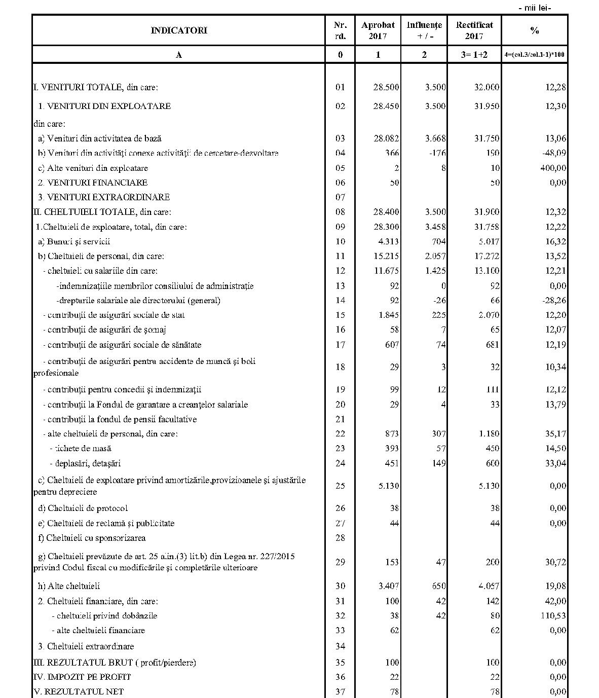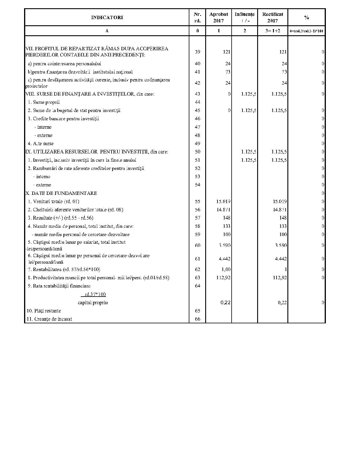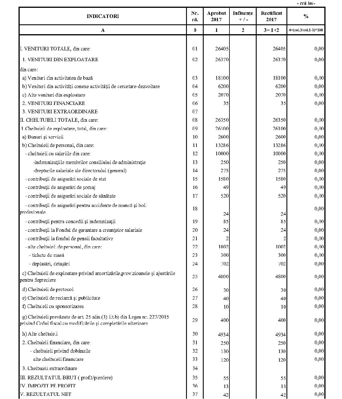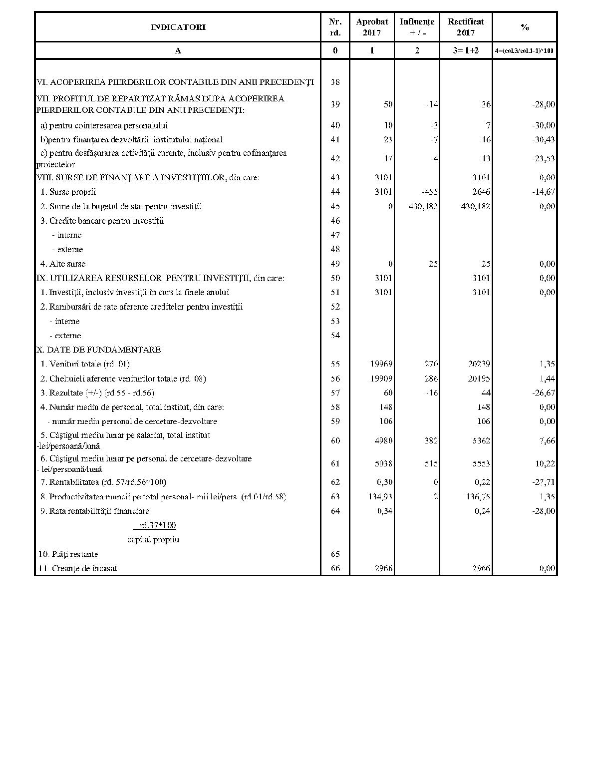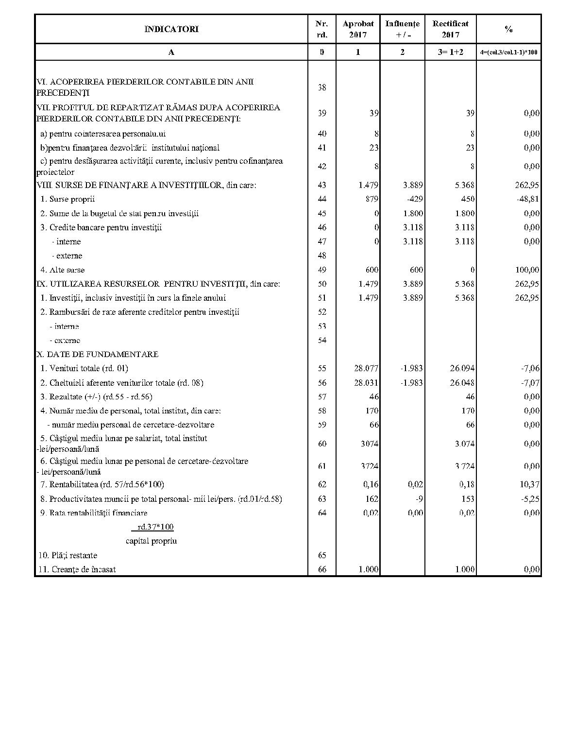 Având în vedere prevederile art. 24 alin. (2) din Ordonanţa Guvernului nr. 57/2002 privind cercetarea ştiinţifică şi dezvoltarea tehnologică, aprobată cu modificări şi completări prin Legea nr. 324/2003, cu modificările şi completările ulterioare,în conformitate cu Ordonanţa de urgenţă a Guvernului nr. 1/2017 pentru stabilirea unor măsuri în domeniul administraţiei publice centrale şi pentru modificarea şi completarea unor acte normative, aprobată cu modificări şi completări prin Legea nr. 129/2017, cu modificările şi completările ulterioare,în temeiul prevederilor art. 10 alin. (3) din Hotărârea Guvernului nr. 13/2017 privind organizarea şi funcţionarea Ministerului Cercetării şi Inovării,ministrul cercetării şi inovării emite prezentul ordin. Articolul 1Se aprobă bugetele de venituri şi cheltuieli rectificate pe anul 2017 ale institutelor naţionale de cercetare-dezvoltare în coordonarea Ministerului Cercetării şi Inovării, prevăzute în anexele nr. 1-33*), care fac parte integrantă din prezentul ordin. *) Anexele nr. 1-33 sunt reproduse în facsimil. Articolul 2(1) Cheltuielile totale aferente veniturilor înscrise în bugetele de venituri şi cheltuieli rectificate prevăzute la art. 1 reprezintă limite maxime ce nu pot fi depăşite.(2) În cazul în care, în execuţie, se înregistrează nerealizări ale veniturilor aprobate, institutele naţionale de cercetare-dezvoltare vor efectua cheltuieli în funcţie de realizarea veniturilor, cu încadrarea în indicatorii de eficienţă aprobaţi. Articolul 3Institutele naţionale de cercetare-dezvoltare în coordonarea Ministerului Cercetării şi Inovării vor duce la îndeplinire prevederile prezentului ordin. Articolul 4 Prezentul ordin se publică în Monitorul Oficial al României, Partea I. Ministrul cercetării şi inovării, Puiu-Lucian Georgescu ANEXA Nr. 1MINISTERUL CERCETĂRII ŞI INOVĂRII INSTITUTUL NAŢIONAL DE CERCETARE-DEZVOLTARE TURBOMOTOARE - COMOTI BUCUREŞTI BUGETUL DE VENITURI ŞI CHELTUIELI RECTIFICAT pe anul 2017 ANEXA Nr. 2MINISTERUL CERCETĂRII ŞI INOVĂRII INSTITUTUL NAŢIONAL DE CERCETARE-DEZVOLTARE ÎN DOMENIUL GEOLOGIEI, GEOFIZICII, GEOCHIMIEI ŞI TELEDETECŢIEI - IGR BUCUREŞTI BUGETUL DE VENITURI ŞI CHELTUIELI RECTIFICAT pe anul 2017 ANEXA Nr. 3MINISTERUL CERCETĂRII ŞI INOVĂRII INSTITUTUL NAŢIONAL DE CERCETARE-DEZVOLTARE PENTRU TEXTILE ŞI PIELĂRIE - INCDTP BUCUREŞTI BUGETUL DE VENITURI ŞI CHELTUIELI RECTIFICAT pe anul 2017 ANEXA Nr. 4MINISTERUL CERCETĂRII ŞI INOVĂRII INSTITUTUL NAŢIONAL DE CERCETARE-DEZVOLTARE PENTRU MAŞINI AGRICOLE ŞI INSTALAŢII DESTINATE AGRICULTURII ŞI INDUSTRIEI ALIMENTARE - INMA BUCUREŞTI BUGETUL DE VENITURI ŞI CHELTUIELI RECTIFICAT pe anul 2017 ANEXA Nr. 5MINISTERUL CERCETĂRII ŞI INOVĂRII INSTITUTUL NAŢIONAL DE CERCETARE-DEZVOLTARE PENTRU FIZICA LASERILOR, PLASMEI ŞI RADIAŢIEI - INFLPR BUCUREŞTI BUGETUL DE VENITURI ŞI CHELTUIELI RECTIFICAT pe anul 2017 ANEXA Nr. 6MINISTERUL CERCETĂRII ŞI INOVĂRII INSTITUTUL NAŢIONAL DE CERCETARE-DEZVOLTARE PENTRU FIZICA MATERIALELOR - INCDFM BUCUREŞTI BUGETUL DE VENITURI ŞI CHELTUIELI RECTIFICAT pe anul 2017 ANEXA Nr. 7MINISTERUL CERCETĂRII ŞI INOVĂRII INSTITUTUL NAŢIONAL DE CERCETARE-DEZVOLTARE PENTRU FIZICA PĂMÂNTULUI - INCDFB BUCUREŞTI BUGETUL DE VENITURI ŞI CHELTUIELI RECTIFICAT pe anul 2017 ANEXA Nr. 8MINISTERUL CERCETĂRII ŞI INOVĂRII INSTITUTUL NAŢIONAL DE CERCETARE-DEZVOLTARE CHIMICO-FARMACEUTICĂ - ICCF BUCUREŞTI BUGETUL DE VENITURI ŞI CHELTUIELI RECTIFICAT pe anul 2017 ANEXA Nr. 9MINISTERUL CERCETĂRII ŞI INOVĂRII INSTITUTUL NAŢIONAL DE CERCETARE-DEZVOLTARE PENTRU ELECTROCHIMIE ŞI MATERIE CONDENSATĂ - INCEMC TIMIŞOARA BUGETUL DE VENITURI ŞI CHELTUIELI RECTIFICAT pe anul 2017 ANEXA Nr. 10MINISTERUL CERCETĂRII ŞI INOVĂRII INSTITUTUL NAŢIONAL DE CERCETARE-DEZVOLTARE PENTRU GEOLOGIE ŞI GEOECOLOGIE MARINĂ - GEOECOMAR BUCUREŞTI BUGETUL DE VENITURI ŞI CHELTUIELI RECTIFICAT pe anul 2017 ANEXA Nr. 11MINISTERUL CERCETĂRII ŞI INOVĂRII INSTITUTUL NAŢIONAL DE CERCETARE-DEZVOLTARE PENTRU ŞTIINŢE BIOLOGICE - INCDSB BUCUREŞTI BUGETUL DE VENITURI ŞI CHELTUIELI RECTIFICAT pe anul 2017 ANEXA Nr. 12MINISTERUL CERCETĂRII ŞI INOVĂRII INSTITUTUL NAŢIONAL DE CERCETARE-DEZVOLTARE PENTRU MICROTEHNOLOGIE IMT - BUCUREŞTI BUGETUL DE VENITURI ŞI CHELTUIELI RECTIFICAT pe anul 2017 ANEXA Nr. 13MINISTERUL CERCETĂRII ŞI INOVĂRII INSTITUTUL NAŢIONAL DE CERCETARE-DEZVOLTARE PENTRU INGINERIE ELECTRICĂ CERCETĂRI AVANSATE ICPE-CA BUCUREŞTI BUGETUL DE VENITURI ŞI CHELTUIELI RECTIFICAT pe anul 2017 ANEXA Nr. 14MINISTERUL CERCETĂRII ŞI INOVĂRII INSTITUTUL NAŢIONAL DE CERCETARE-DEZVOLTARE AEROSPAŢIALĂ „ELIE CARAFOLI" - I.N.C.A.S. BUGETUL DE VENITURI ŞI CHELTUIELI RECTIFICAT pe anul 2017 ANEXA Nr. 15MINISTERUL CERCETĂRII ŞI INOVĂRII INSTITUTUL NAŢIONAL DE CERCETARE-DEZVOLTARE PENTRU MECATRONICĂ ŞI TEHNICA MĂSURĂRII - INCDMTM BUCUREŞTI BUGETUL DE VENITURI ŞI CHELTUIELI RECTIFICAT pe anul 2017 ANEXA Nr. 16MINISTERUL CERCETĂRII ŞI INOVĂRII INSTITUTUL NAŢIONAL DE CERCETARE-DEZVOLTARE PENTRU ECOLOGIE INDUSTRIALĂ - ECOIND BUCUREŞTI BUGETUL DE VENITURI ŞI CHELTUIELI RECTIFICAT pe anul 2017 ANEXA Nr. 17MINISTERUL CERCETĂRII ŞI INOVĂRII INSTITUTUL NAŢIONAL DE CERCETARE-DEZVOLTARE ÎN SUDURĂ ŞI ÎNCERCĂRI DE MATERIALE - ISIM TIMIŞOARA BUGETUL DE VENITURI ŞI CHELTUIELI RECTIFICAT pe anul 2017 ANEXA Nr. 18MINISTERUL CERCETĂRII ŞI INOVĂRII INSTITUTUL NAŢIONAL DE CERCETARE-DEZVOLTARE PENTRU CHIMIE ŞI PETROCHIMIE - ICECHIM BUCUREŞTI BUGETUL DE VENITURI ŞI CHELTUIELI RECTIFICAT pe anul 2017 ANEXA Nr. 19MINISTERUL CERCETĂRII ŞI INOVĂRII INSTITUTUL NAŢIONAL PENTRU CERCETARE-DEZVOLTARE PENTRU METALE NEFEROASE ŞI RARE - IMNR BUCUREŞTI BUGETUL DE VENITURI ŞI CHELTUIELI RECTIFICAT pe anul 2017 ANEXA Nr. 20MINISTERUL CERCETĂRII ŞI INOVĂRII INSTITUTUL NAŢIONAL DE CERCETARE-DEZVOLTARE PENTRU SECURITATE MINIERĂ ŞI PROTECŢI