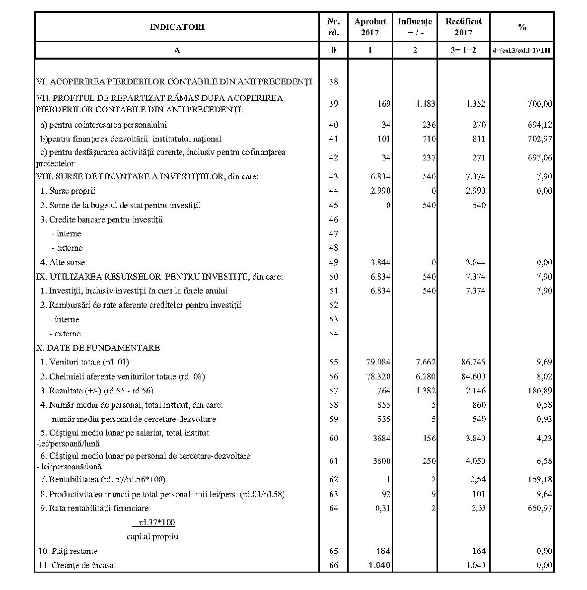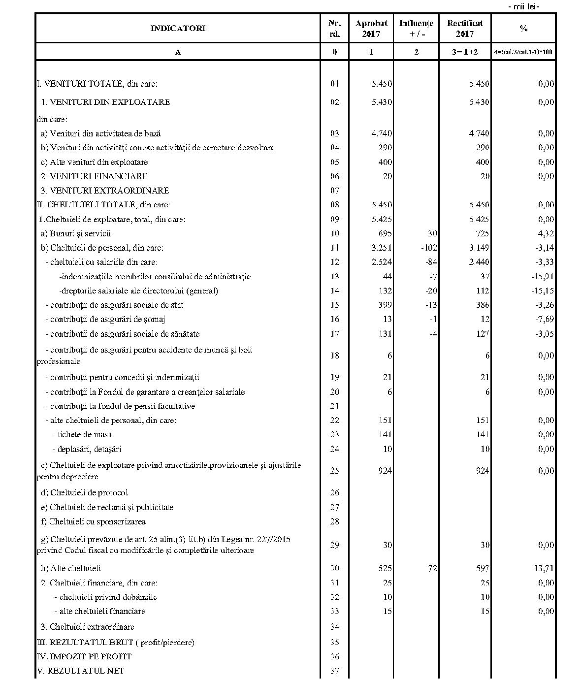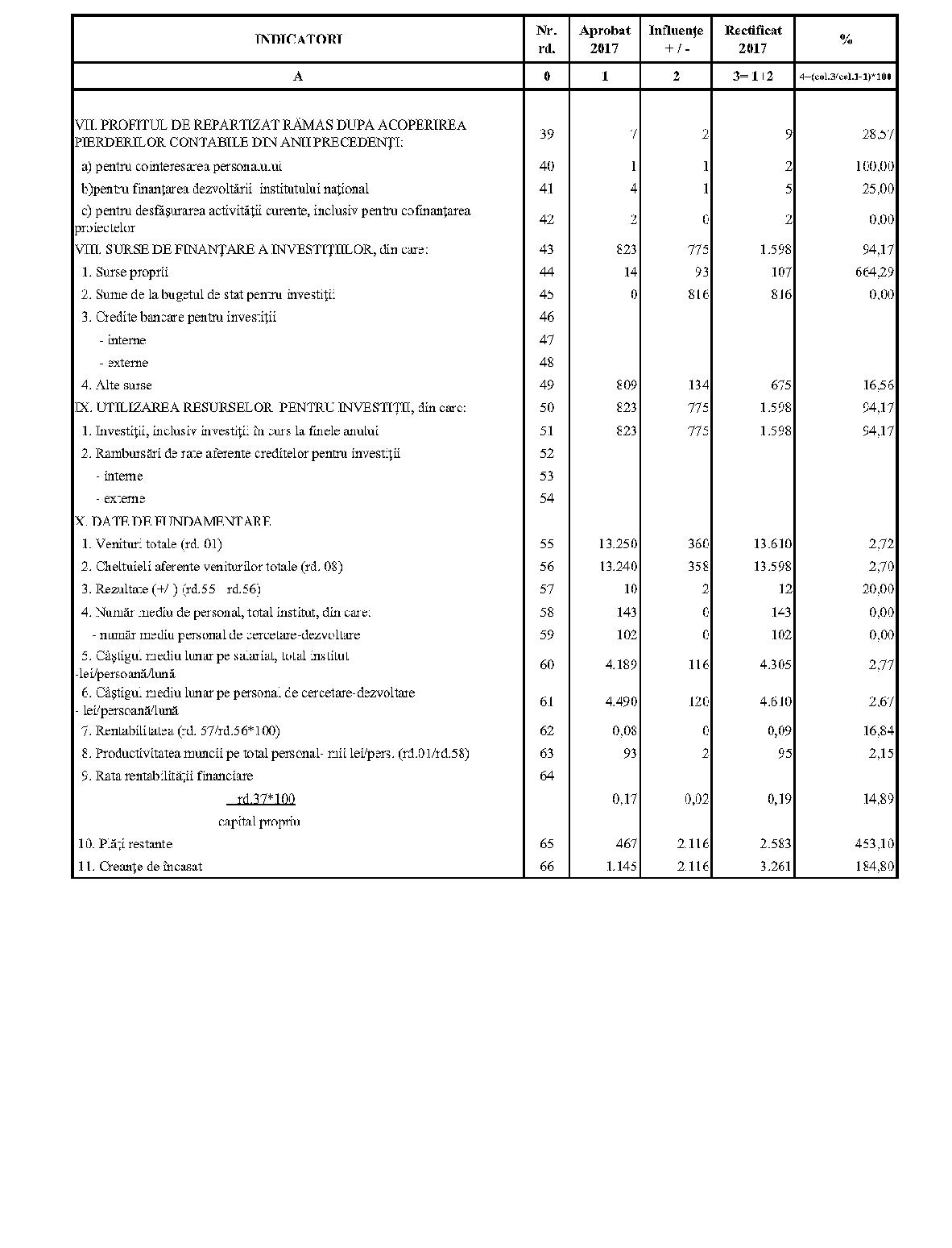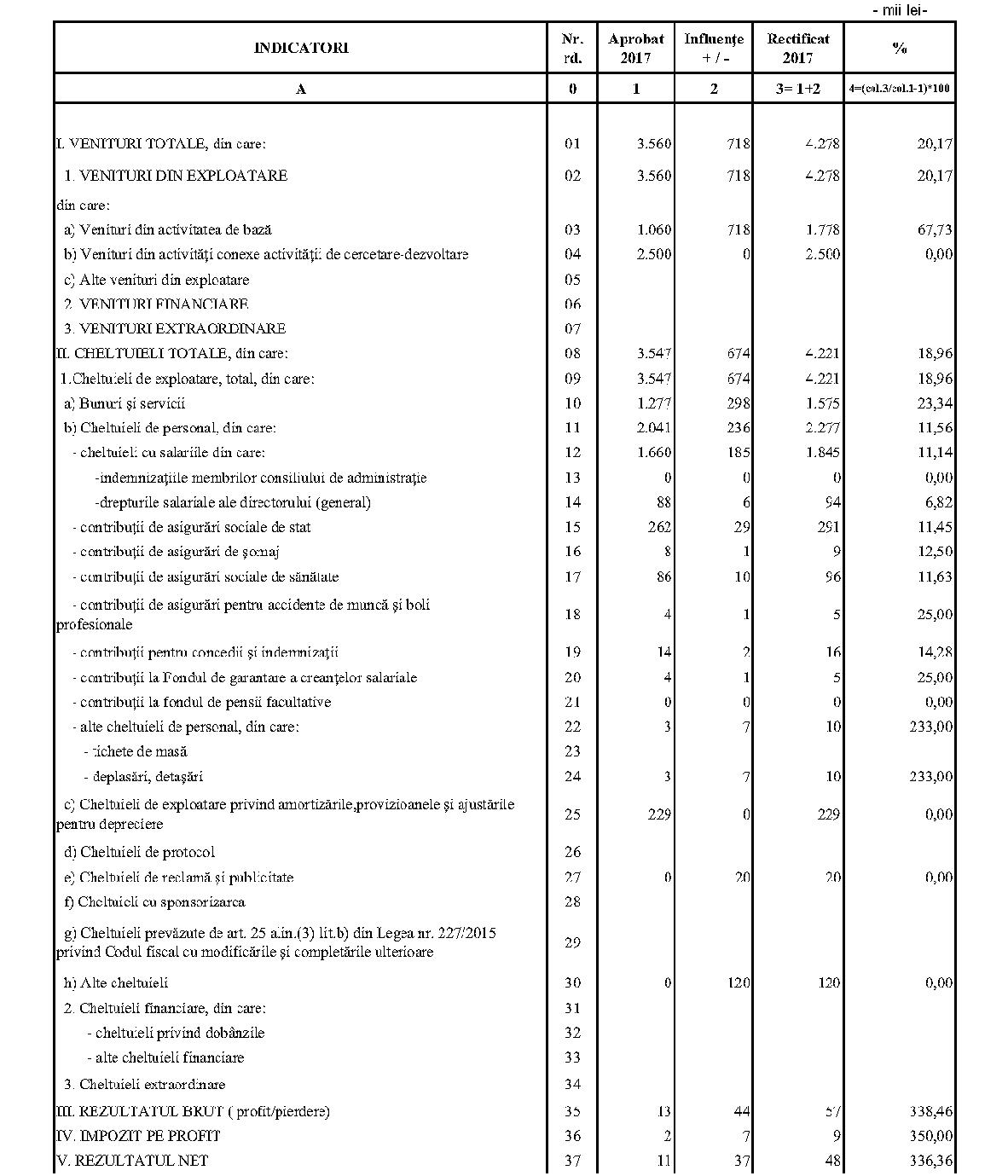 Având în vedere prevederile art. 24 alin. (2) din Ordonanţa Guvernului nr. 57/2002 privind cercetarea ştiinţifică şi dezvoltarea tehnologică, aprobată cu modificări şi completări prin Legea nr. 324/2003, cu modificările şi completările ulterioare,în conformitate cu Ordonanţa de urgenţă a Guvernului nr. 1/2017 pentru stabilirea unor măsuri în domeniul administraţiei publice centrale şi pentru modificarea şi completarea unor acte normative, aprobată cu modificări şi completări prin Legea nr. 129/2017, cu modificările şi completările ulterioare,în temeiul prevederilor art. 10 alin. (3) din Hotărârea Guvernului nr. 13/2017 privind organizarea şi funcţionarea Ministerului Cercetării şi Inovării,ministrul cercetării şi inovării emite prezentul ordin. Articolul 1Se aprobă bugetele de venituri şi cheltuieli rectificate pe anul 2017 ale institutelor naţionale de cercetare-dezvoltare în coordonarea Ministerului Cercetării şi Inovării, prevăzute în anexele nr. 1-33*), care fac parte integrantă din prezentul ordin. *) Anexele nr. 1-33 sunt reproduse în facsimil. Articolul 2(1) Cheltuielile totale aferente veniturilor înscrise în bugetele de venituri şi cheltuieli rectificate prevăzute la art. 1 reprezintă limite maxime ce nu pot fi depăşite.(2) În cazul în care, în execuţie, se înregistrează nerealizări ale veniturilor aprobate, institutele naţionale de cercetare-dezvoltare vor efectua cheltuieli în funcţie de realizarea veniturilor, cu încadrarea în indicatorii de eficienţă aprobaţi. Articolul 3Institutele naţionale de cercetare-dezvoltare în coordonarea Ministerului Cercetării şi Inovării vor duce la îndeplinire prevederile prezentului ordin. Articolul 4 Prezentul ordin se publică în Monitorul Oficial al României, Partea I. Ministrul cercetării şi inovării, Puiu-Lucian Georgescu ANEXA Nr. 1MINISTERUL CERCETĂRII ŞI INOVĂRII INSTITUTUL NAŢIONAL DE CERCETARE-DEZVOLTARE TURBOMOTOARE - COMOTI BUCUREŞTI BUGETUL DE VENITURI ŞI CHELTUIELI RECTIFICAT pe anul 2017 ANEXA Nr. 2MINISTERUL CERCETĂRII ŞI INOVĂRII INSTITUTUL NAŢIONAL DE CERCETARE-DEZVOLTARE ÎN DOMENIUL GEOLOGIEI, GEOFIZICII, GEOCHIMIEI ŞI TELEDETECŢIEI - IGR BUCUREŞTI BUGETUL DE VENITURI ŞI CHELTUIELI RECTIFICAT pe anul 2017 ANEXA Nr. 3MINISTERUL CERCETĂRII ŞI INOVĂRII INSTITUTUL NAŢIONAL DE CERCETARE-DEZVOLTARE PENTRU TEXTILE ŞI PIELĂRIE - INCDTP BUCUREŞTI BUGETUL DE VENITURI ŞI CHELTUIELI RECTIFICAT pe anul 2017 ANEXA Nr. 4MINISTERUL CERCETĂRII ŞI INOVĂRII INSTITUTUL NAŢIONAL DE CERCETARE-DEZVOLTARE PENTRU MAŞINI AGRICOLE ŞI INSTALAŢII DESTINATE AGRICULTURII ŞI INDUSTRIEI ALIMENTARE - INMA BUCUREŞTI BUGETUL DE VENITURI ŞI CHELTUIELI RECTIFICAT pe anul 2017 ANEXA Nr. 5MINISTERUL CERCETĂRII ŞI INOVĂRII INSTITUTUL NAŢIONAL DE CERCETARE-DEZVOLTARE PENTRU FIZICA LASERILOR, PLASMEI ŞI RADIAŢIEI - INFLPR BUCUREŞTI BUGETUL DE VENITURI ŞI CHELTUIELI RECTIFICAT pe anul 2017 ANEXA Nr. 6MINISTERUL CERCETĂRII ŞI INOVĂRII INSTITUTUL NAŢIONAL DE CERCETARE-DEZVOLTARE PENTRU FIZICA MATERIALELOR - INCDFM BUCUREŞTI BUGETUL DE VENITURI ŞI CHELTUIELI RECTIFICAT pe anul 2017 ANEXA Nr. 7MINISTERUL CERCETĂRII ŞI INOVĂRII INSTITUTUL NAŢIONAL DE CERCETARE-DEZVOLTARE PENTRU FIZICA PĂMÂNTULUI - INCDFB BUCUREŞTI BUGETUL DE VENITURI ŞI CHELTUIELI RECTIFICAT pe anul 2017 ANEXA Nr. 8MINISTERUL CERCETĂRII ŞI INOVĂRII INSTITUTUL NAŢIONAL DE CERCETARE-DEZVOLTARE CHIMICO-FARMACEUTICĂ - ICCF BUCUREŞTI BUGETUL DE VENITURI ŞI CHELTUIELI RECTIFICAT pe anul 2017 ANEXA Nr. 9MINISTERUL CERCETĂRII ŞI INOVĂRII INSTITUTUL NAŢIONAL DE CERCETARE-DEZVOLTARE PENTRU ELECTROCHIMIE ŞI MATERIE CONDENSATĂ - INCEMC TIMIŞOARA BUGETUL DE VENITURI ŞI CHELTUIELI RECTIFICAT pe anul 2017 ANEXA Nr. 10MINISTERUL CERCETĂRII ŞI INOVĂRII INSTITUTUL NAŢIONAL DE CERCETARE-DEZVOLTARE PENTRU GEOLOGIE ŞI GEOECOLOGIE MARINĂ - GEOECOMAR BUCUREŞTI BUGETUL DE VENITURI ŞI CHELTUIELI RECTIFICAT pe anul 2017 ANEXA Nr. 11MINISTERUL CERCETĂRII ŞI INOVĂRII INSTITUTUL NAŢIONAL DE CERCETARE-DEZVOLTARE PENTRU ŞTIINŢE BIOLOGICE - INCDSB BUCUREŞTI BUGETUL DE VENITURI ŞI CHELTUIELI RECTIFICAT pe anul 2017 ANEXA Nr. 12MINISTERUL CERCETĂRII ŞI INOVĂRII INSTITUTUL NAŢIONAL DE CERCETARE-DEZVOLTARE PENTRU MICROTEHNOLOGIE IMT - BUCUREŞTI BUGETUL DE VENITURI ŞI CHELTUIELI RECTIFICAT pe anul 2017 ANEXA Nr. 13MINISTERUL CERCETĂRII ŞI INOVĂRII INSTITUTUL NAŢIONAL DE CERCETARE-DEZVOLTARE PENTRU INGINERIE ELECTRICĂ CERCETĂRI AVANSATE ICPE-CA BUCUREŞTI BUGETUL DE VENITURI ŞI CHELTUIELI RECTIFICAT pe anul 2017 ANEXA Nr. 14MINISTERUL CERCETĂRII ŞI INOVĂRII INSTITUTUL NAŢIONAL DE CERCETARE-DEZVOLTARE AEROSPAŢIALĂ „ELIE CARAFOLI" - I.N.C.A.S. BUGETUL DE VENITURI ŞI CHELTUIELI RECTIFICAT pe anul 2017 ANEXA Nr. 15MINISTERUL CERCETĂRII ŞI INOVĂRII INSTITUTUL NAŢIONAL DE CERCETARE-DEZVOLTARE PENTRU MECATRONICĂ ŞI TEHNICA MĂSURĂRII - INCDMTM BUCUREŞTI BUGETUL DE VENITURI ŞI CHELTUIELI RECTIFICAT pe anul 2017 ANEXA Nr. 16MINISTERUL CERCETĂRII ŞI INOVĂRII INSTITUTUL NAŢIONAL DE CERCETARE-DEZVOLTARE PENTRU ECOLOGIE INDUSTRIALĂ - ECOIND BUCUREŞTI BUGETUL DE VENITURI ŞI CHELTUIELI RECTIFICAT pe anul 2017 ANEXA Nr. 17MINISTERUL CERCETĂRII ŞI INOVĂRII INSTITUTUL NAŢIONAL DE CERCETARE-DEZVOLTARE ÎN SUDURĂ ŞI ÎNCERCĂRI DE MATERIALE - ISIM TIMIŞOARA BUGETUL DE VENITURI ŞI CHELTUIELI RECTIFICAT pe anul 2017 ANEXA Nr. 18MINISTERUL CERCETĂRII ŞI INOVĂRII INSTITUTUL NAŢIONAL DE CERCETARE-DEZVOLTARE PENTRU CHIMIE ŞI PETROCHIMIE - ICECHIM BUCUREŞTI BUGETUL DE VENITURI ŞI CHELTUIELI RECTIFICAT pe anul 2017 ANEXA Nr. 19MINISTERUL CERCETĂRII ŞI INOVĂRII INSTITUTUL NAŢIONAL PENTRU CERCETARE-DEZVOLTARE PENTRU METALE NEFEROASE ŞI RARE - IMNR BUCUREŞTI BUGETUL DE VENITURI ŞI CHELTUIELI RECTIFICAT pe anul 2017 ANEXA Nr. 20MINISTERUL CERCETĂRII ŞI INOVĂRII INSTITUTUL NAŢIONAL DE CERCETARE-DEZVOLTARE PENTRU SECURITATE MINIERĂ ŞI PROTECŢI
