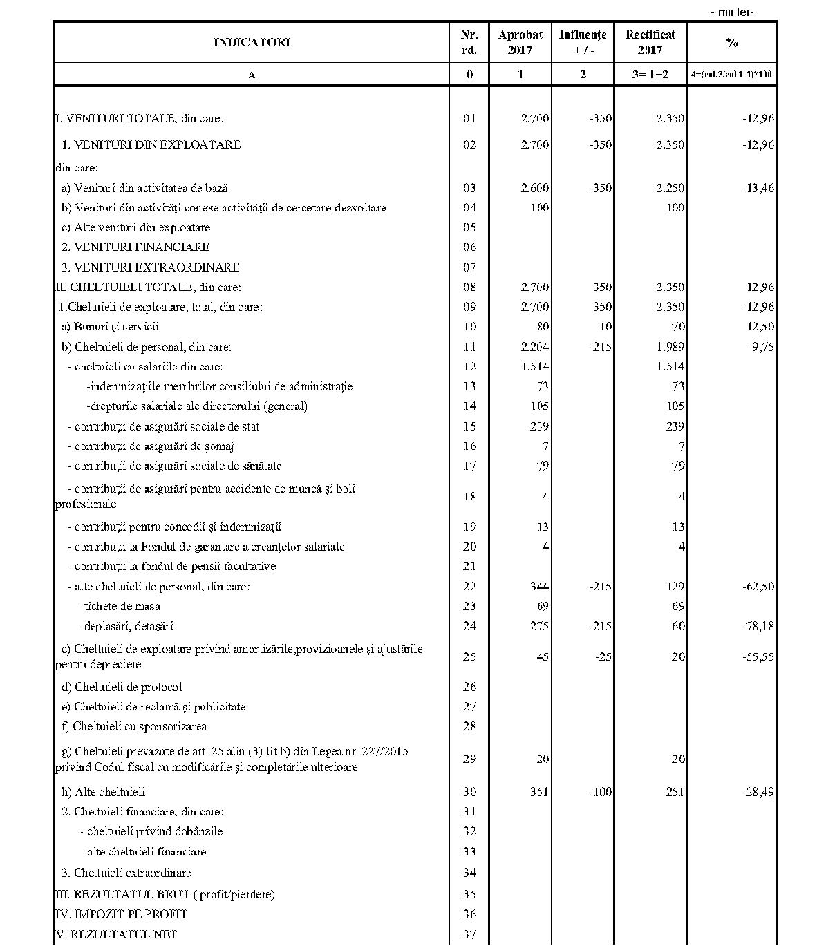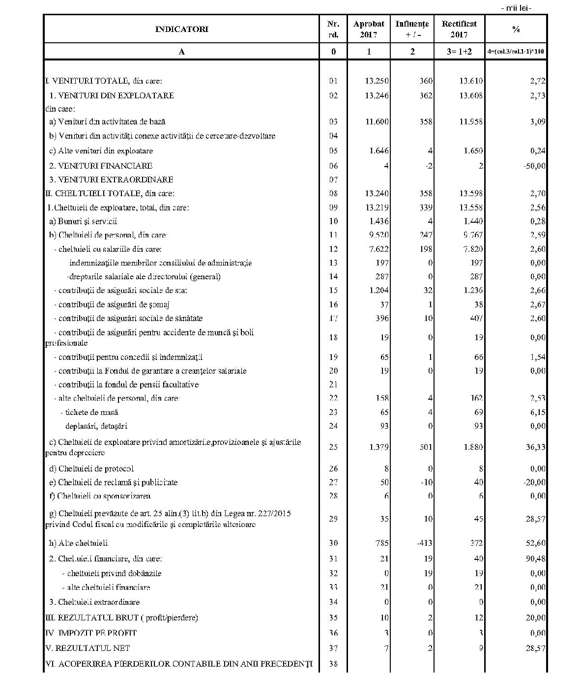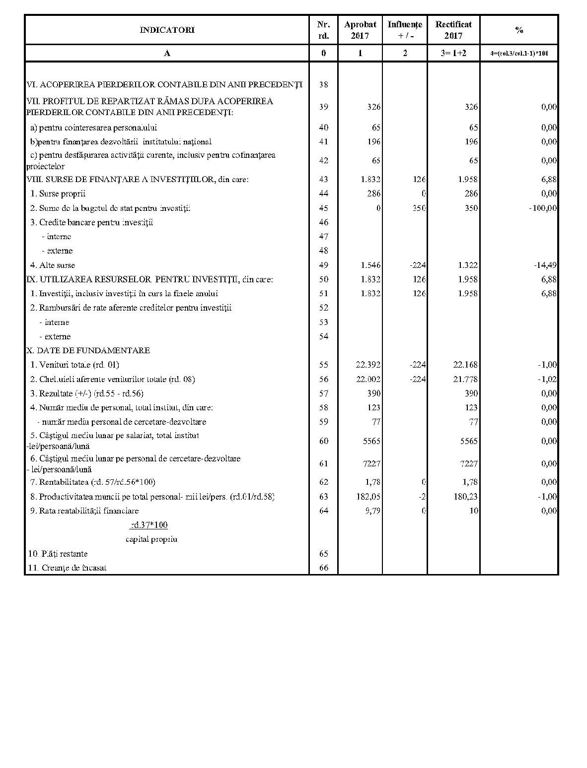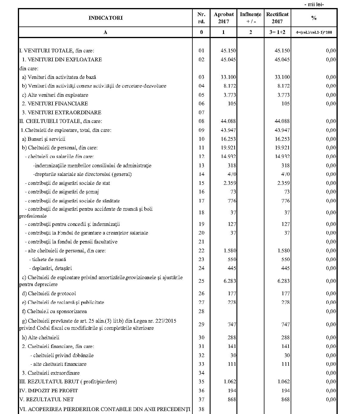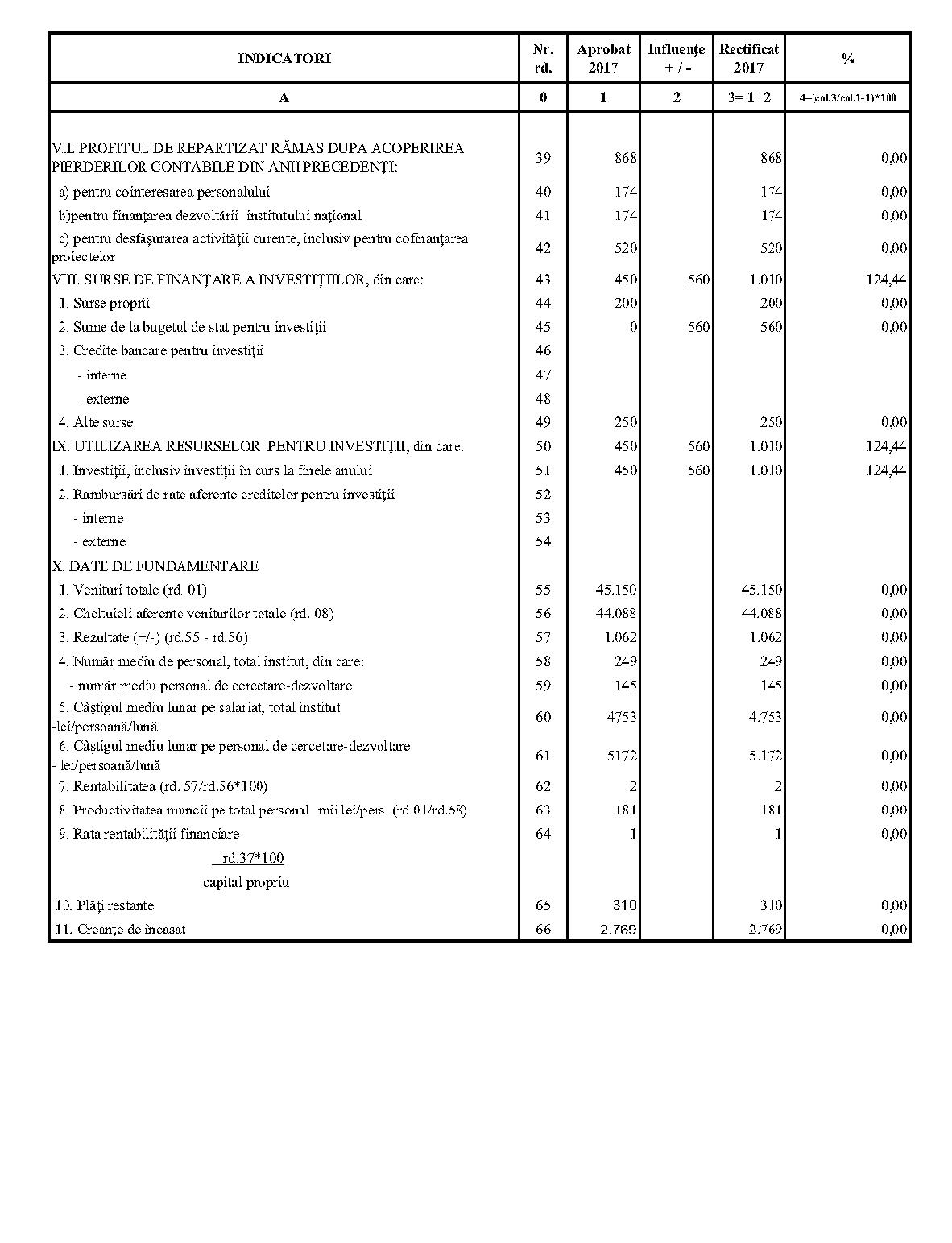 Având în vedere prevederile art. 24 alin. (2) din Ordonanţa Guvernului nr. 57/2002 privind cercetarea ştiinţifică şi dezvoltarea tehnologică, aprobată cu modificări şi completări prin Legea nr. 324/2003, cu modificările şi completările ulterioare,în conformitate cu Ordonanţa de urgenţă a Guvernului nr. 1/2017 pentru stabilirea unor măsuri în domeniul administraţiei publice centrale şi pentru modificarea şi completarea unor acte normative, aprobată cu modificări şi completări prin Legea nr. 129/2017, cu modificările şi completările ulterioare,în temeiul prevederilor art. 10 alin. (3) din Hotărârea Guvernului nr. 13/2017 privind organizarea şi funcţionarea Ministerului Cercetării şi Inovării,ministrul cercetării şi inovării emite prezentul ordin. Articolul 1Se aprobă bugetele de venituri şi cheltuieli rectificate pe anul 2017 ale institutelor naţionale de cercetare-dezvoltare în coordonarea Ministerului Cercetării şi Inovării, prevăzute în anexele nr. 1-33*), care fac parte integrantă din prezentul ordin. *) Anexele nr. 1-33 sunt reproduse în facsimil. Articolul 2(1) Cheltuielile totale aferente veniturilor înscrise în bugetele de venituri şi cheltuieli rectificate prevăzute la art. 1 reprezintă limite maxime ce nu pot fi depăşite.(2) În cazul în care, în execuţie, se înregistrează nerealizări ale veniturilor aprobate, institutele naţionale de cercetare-dezvoltare vor efectua cheltuieli în funcţie de realizarea veniturilor, cu încadrarea în indicatorii de eficienţă aprobaţi. Articolul 3Institutele naţionale de cercetare-dezvoltare în coordonarea Ministerului Cercetării şi Inovării vor duce la îndeplinire prevederile prezentului ordin. Articolul 4 Prezentul ordin se publică în Monitorul Oficial al României, Partea I. Ministrul cercetării şi inovării, Puiu-Lucian Georgescu ANEXA Nr. 1MINISTERUL CERCETĂRII ŞI INOVĂRII INSTITUTUL NAŢIONAL DE CERCETARE-DEZVOLTARE TURBOMOTOARE - COMOTI BUCUREŞTI BUGETUL DE VENITURI ŞI CHELTUIELI RECTIFICAT pe anul 2017 ANEXA Nr. 2MINISTERUL CERCETĂRII ŞI INOVĂRII INSTITUTUL NAŢIONAL DE CERCETARE-DEZVOLTARE ÎN DOMENIUL GEOLOGIEI, GEOFIZICII, GEOCHIMIEI ŞI TELEDETECŢIEI - IGR BUCUREŞTI BUGETUL DE VENITURI ŞI CHELTUIELI RECTIFICAT pe anul 2017 ANEXA Nr. 3MINISTERUL CERCETĂRII ŞI INOVĂRII INSTITUTUL NAŢIONAL DE CERCETARE-DEZVOLTARE PENTRU TEXTILE ŞI PIELĂRIE - INCDTP BUCUREŞTI BUGETUL DE VENITURI ŞI CHELTUIELI RECTIFICAT pe anul 2017 ANEXA Nr. 4MINISTERUL CERCETĂRII ŞI INOVĂRII INSTITUTUL NAŢIONAL DE CERCETARE-DEZVOLTARE PENTRU MAŞINI AGRICOLE ŞI INSTALAŢII DESTINATE AGRICULTURII ŞI INDUSTRIEI ALIMENTARE - INMA BUCUREŞTI BUGETUL DE VENITURI ŞI CHELTUIELI RECTIFICAT pe anul 2017 ANEXA Nr. 5MINISTERUL CERCETĂRII ŞI INOVĂRII INSTITUTUL NAŢIONAL DE CERCETARE-DEZVOLTARE PENTRU FIZICA LASERILOR, PLASMEI ŞI RADIAŢIEI - INFLPR BUCUREŞTI BUGETUL DE VENITURI ŞI CHELTUIELI RECTIFICAT pe anul 2017 ANEXA Nr. 6MINISTERUL CERCETĂRII ŞI INOVĂRII INSTITUTUL NAŢIONAL DE CERCETARE-DEZVOLTARE PENTRU FIZICA MATERIALELOR - INCDFM BUCUREŞTI BUGETUL DE VENITURI ŞI CHELTUIELI RECTIFICAT pe anul 2017 ANEXA Nr. 7MINISTERUL CERCETĂRII ŞI INOVĂRII INSTITUTUL NAŢIONAL DE CERCETARE-DEZVOLTARE PENTRU FIZICA PĂMÂNTULUI - INCDFB BUCUREŞTI BUGETUL DE VENITURI ŞI CHELTUIELI RECTIFICAT pe anul 2017 ANEXA Nr. 8MINISTERUL CERCETĂRII ŞI INOVĂRII INSTITUTUL NAŢIONAL DE CERCETARE-DEZVOLTARE CHIMICO-FARMACEUTICĂ - ICCF BUCUREŞTI BUGETUL DE VENITURI ŞI CHELTUIELI RECTIFICAT pe anul 2017 ANEXA Nr. 9MINISTERUL CERCETĂRII ŞI INOVĂRII INSTITUTUL NAŢIONAL DE CERCETARE-DEZVOLTARE PENTRU ELECTROCHIMIE ŞI MATERIE CONDENSATĂ - INCEMC TIMIŞOARA BUGETUL DE VENITURI ŞI CHELTUIELI RECTIFICAT pe anul 2017 ANEXA Nr. 10MINISTERUL CERCETĂRII ŞI INOVĂRII INSTITUTUL NAŢIONAL DE CERCETARE-DEZVOLTARE PENTRU GEOLOGIE ŞI GEOECOLOGIE MARINĂ - GEOECOMAR BUCUREŞTI BUGETUL DE VENITURI ŞI CHELTUIELI RECTIFICAT pe anul 2017 ANEXA Nr. 11MINISTERUL CERCETĂRII ŞI INOVĂRII INSTITUTUL NAŢIONAL DE CERCETARE-DEZVOLTARE PENTRU ŞTIINŢE BIOLOGICE - INCDSB BUCUREŞTI BUGETUL DE VENITURI ŞI CHELTUIELI RECTIFICAT pe anul 2017 ANEXA Nr. 12MINISTERUL CERCETĂRII ŞI INOVĂRII INSTITUTUL NAŢIONAL DE CERCETARE-DEZVOLTARE PENTRU MICROTEHNOLOGIE IMT - BUCUREŞTI BUGETUL DE VENITURI ŞI CHELTUIELI RECTIFICAT pe anul 2017 ANEXA Nr. 13MINISTERUL CERCETĂRII ŞI INOVĂRII INSTITUTUL NAŢIONAL DE CERCETARE-DEZVOLTARE PENTRU INGINERIE ELECTRICĂ CERCETĂRI AVANSATE ICPE-CA BUCUREŞTI BUGETUL DE VENITURI ŞI CHELTUIELI RECTIFICAT pe anul 2017 ANEXA Nr. 14MINISTERUL CERCETĂRII ŞI INOVĂRII INSTITUTUL NAŢIONAL DE CERCETARE-DEZVOLTARE AEROSPAŢIALĂ „ELIE CARAFOLI" - I.N.C.A.S. BUGETUL DE VENITURI ŞI CHELTUIELI RECTIFICAT pe anul 2017 ANEXA Nr. 15MINISTERUL CERCETĂRII ŞI INOVĂRII INSTITUTUL NAŢIONAL DE CERCETARE-DEZVOLTARE PENTRU MECATRONICĂ ŞI TEHNICA MĂSURĂRII - INCDMTM BUCUREŞTI BUGETUL DE VENITURI ŞI CHELTUIELI RECTIFICAT pe anul 2017 ANEXA Nr. 16MINISTERUL CERCETĂRII ŞI INOVĂRII INSTITUTUL NAŢIONAL DE CERCETARE-DEZVOLTARE PENTRU ECOLOGIE INDUSTRIALĂ - ECOIND BUCUREŞTI BUGETUL DE VENITURI ŞI CHELTUIELI RECTIFICAT pe anul 2017 ANEXA Nr. 17MINISTERUL CERCETĂRII ŞI INOVĂRII INSTITUTUL NAŢIONAL DE CERCETARE-DEZVOLTARE ÎN SUDURĂ ŞI ÎNCERCĂRI DE MATERIALE - ISIM TIMIŞOARA BUGETUL DE VENITURI ŞI CHELTUIELI RECTIFICAT pe anul 2017 ANEXA Nr. 18MINISTERUL CERCETĂRII ŞI INOVĂRII INSTITUTUL NAŢIONAL DE CERCETARE-DEZVOLTARE PENTRU CHIMIE ŞI PETROCHIMIE - ICECHIM BUCUREŞTI BUGETUL DE VENITURI ŞI CHELTUIELI RECTIFICAT pe anul 2017 ANEXA Nr. 19MINISTERUL CERCETĂRII ŞI INOVĂRII INSTITUTUL NAŢIONAL PENTRU CERCETARE-DEZVOLTARE PENTRU METALE NEFEROASE ŞI RARE - IMNR BUCUREŞTI BUGETUL DE VENITURI ŞI CHELTUIELI RECTIFICAT pe anul 2017 ANEXA Nr. 20MINISTERUL CERCETĂRII ŞI INOVĂRII INSTITUTUL NAŢIONAL DE CERCETARE-DEZVOLTARE PENTRU SECURITATE MINIERĂ ŞI PROTECŢI