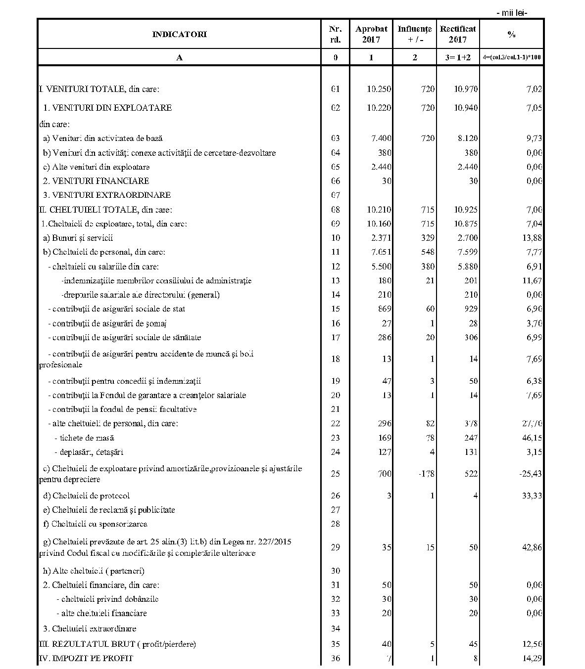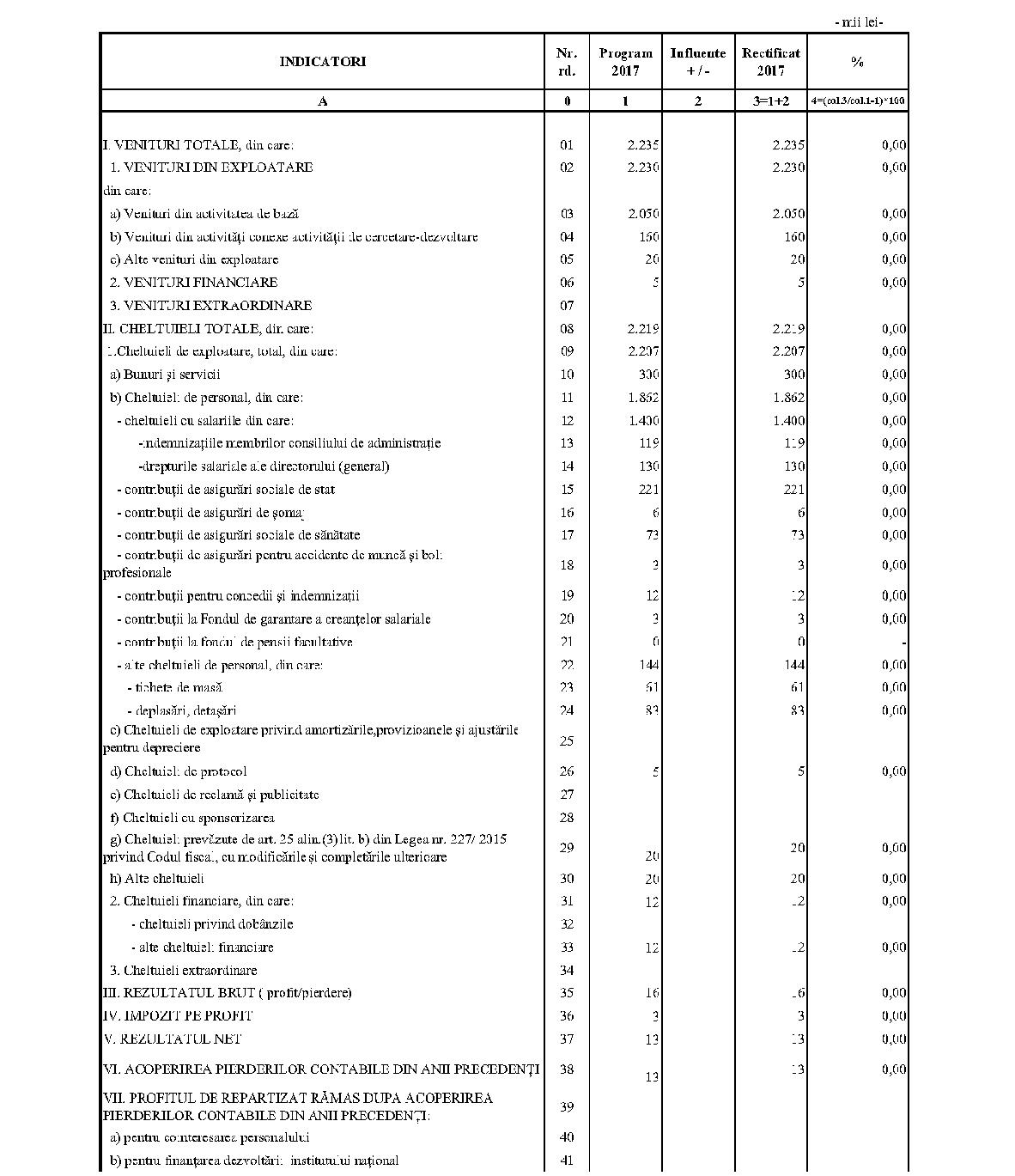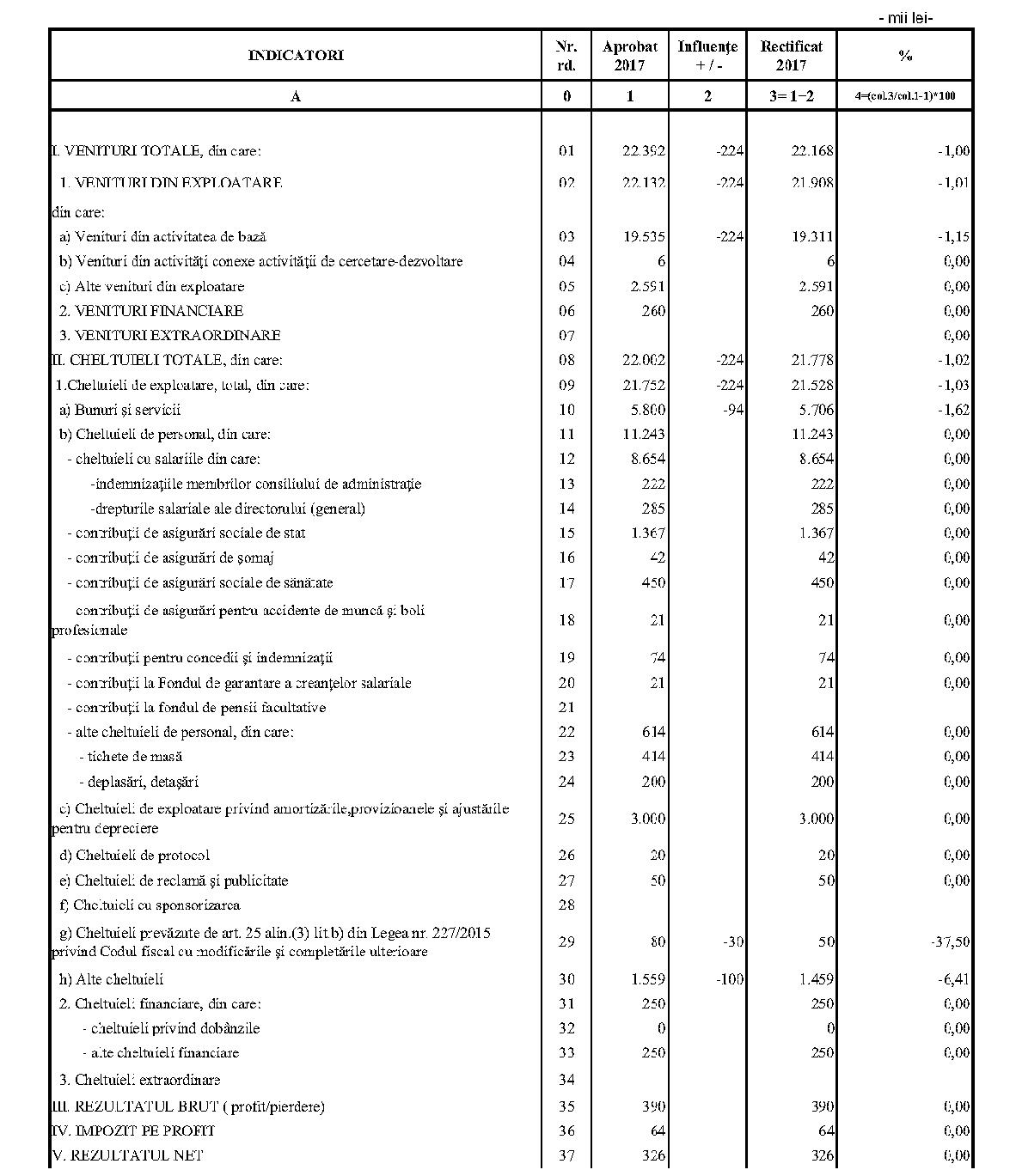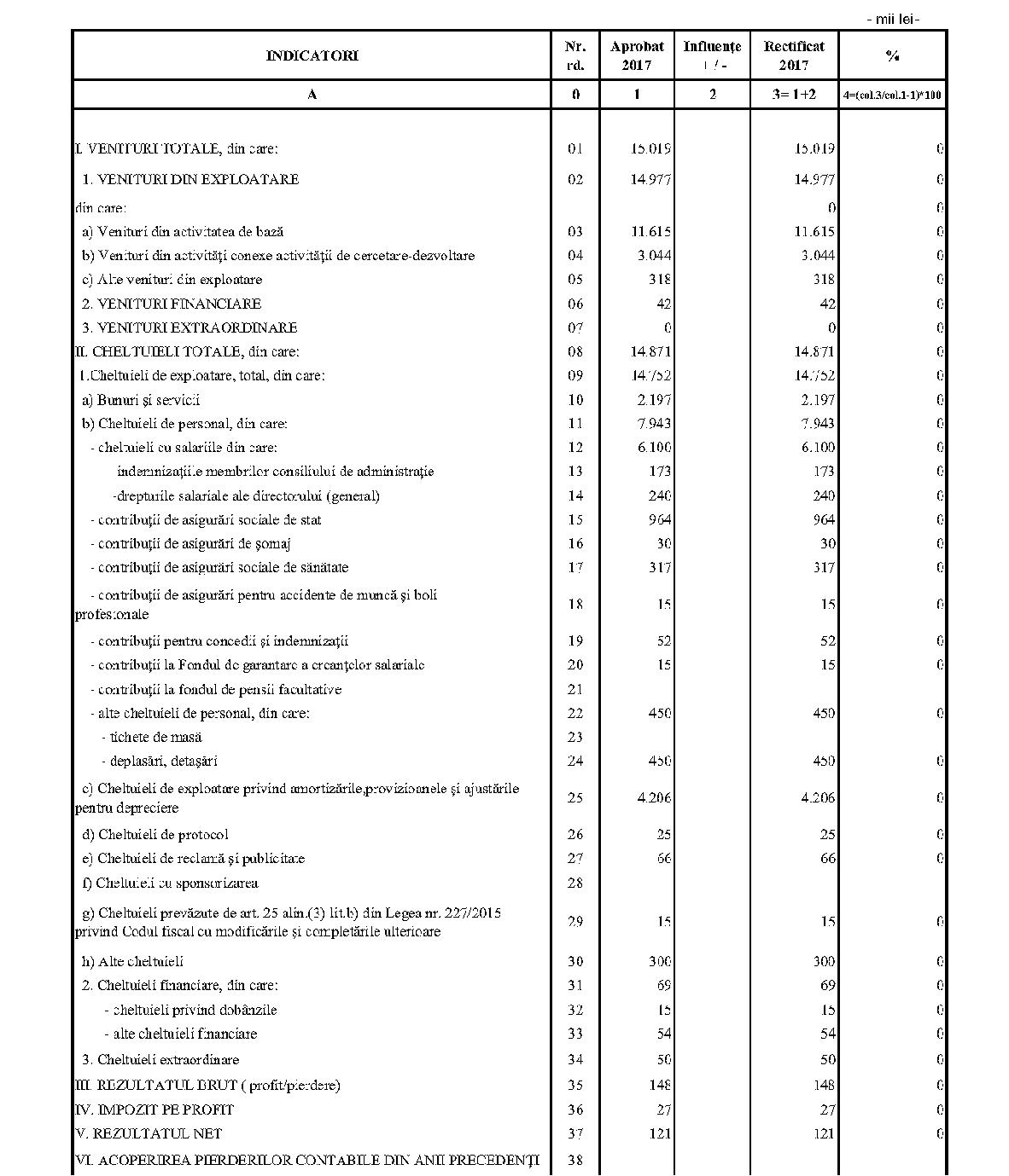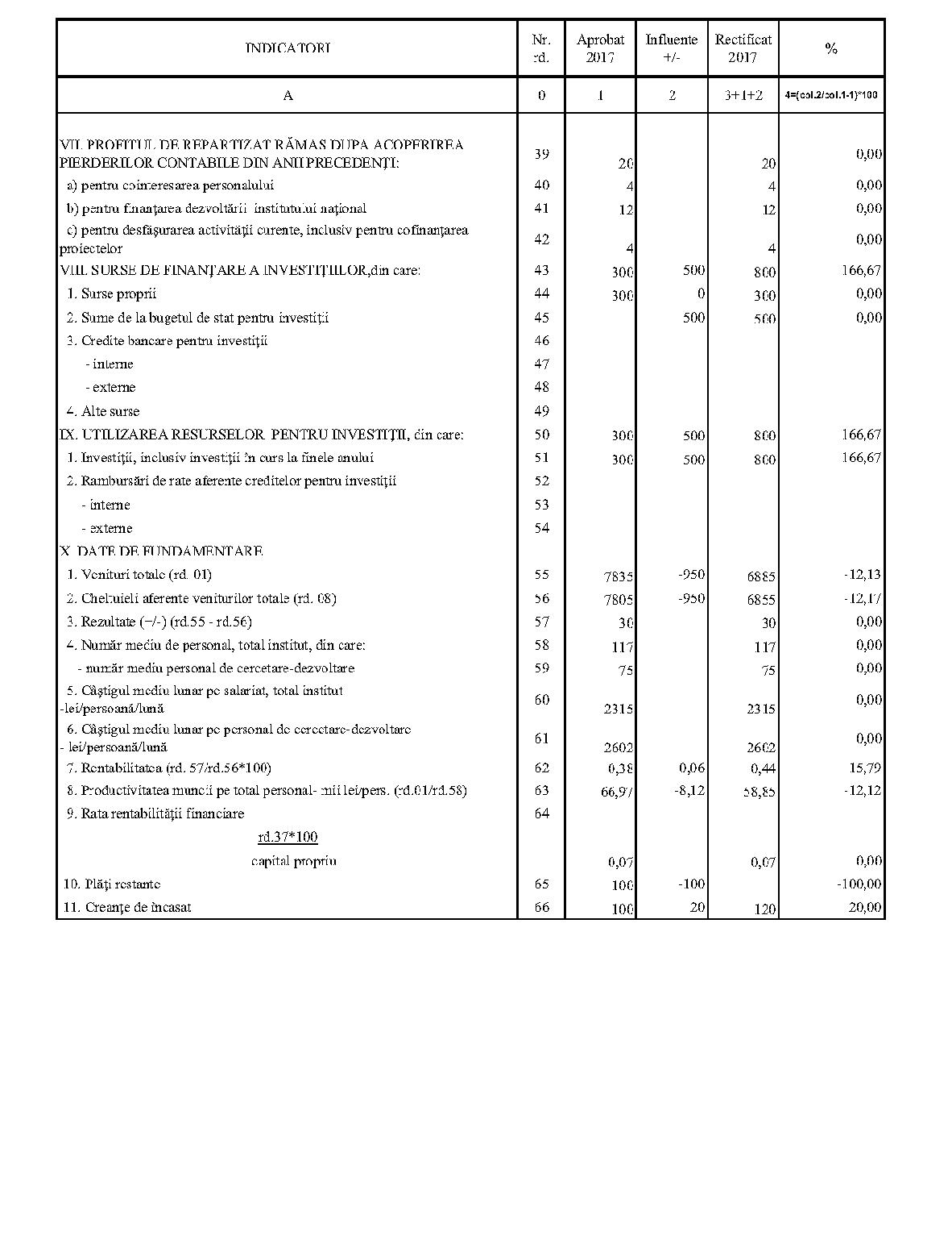 Având în vedere prevederile art. 24 alin. (2) din Ordonanţa Guvernului nr. 57/2002 privind cercetarea ştiinţifică şi dezvoltarea tehnologică, aprobată cu modificări şi completări prin Legea nr. 324/2003, cu modificările şi completările ulterioare,în conformitate cu Ordonanţa de urgenţă a Guvernului nr. 1/2017 pentru stabilirea unor măsuri în domeniul administraţiei publice centrale şi pentru modificarea şi completarea unor acte normative, aprobată cu modificări şi completări prin Legea nr. 129/2017, cu modificările şi completările ulterioare,în temeiul prevederilor art. 10 alin. (3) din Hotărârea Guvernului nr. 13/2017 privind organizarea şi funcţionarea Ministerului Cercetării şi Inovării,ministrul cercetării şi inovării emite prezentul ordin. Articolul 1Se aprobă bugetele de venituri şi cheltuieli rectificate pe anul 2017 ale institutelor naţionale de cercetare-dezvoltare în coordonarea Ministerului Cercetării şi Inovării, prevăzute în anexele nr. 1-33*), care fac parte integrantă din prezentul ordin. *) Anexele nr. 1-33 sunt reproduse în facsimil. Articolul 2(1) Cheltuielile totale aferente veniturilor înscrise în bugetele de venituri şi cheltuieli rectificate prevăzute la art. 1 reprezintă limite maxime ce nu pot fi depăşite.(2) În cazul în care, în execuţie, se înregistrează nerealizări ale veniturilor aprobate, institutele naţionale de cercetare-dezvoltare vor efectua cheltuieli în funcţie de realizarea veniturilor, cu încadrarea în indicatorii de eficienţă aprobaţi. Articolul 3Institutele naţionale de cercetare-dezvoltare în coordonarea Ministerului Cercetării şi Inovării vor duce la îndeplinire prevederile prezentului ordin. Articolul 4 Prezentul ordin se publică în Monitorul Oficial al României, Partea I. Ministrul cercetării şi inovării, Puiu-Lucian Georgescu ANEXA Nr. 1MINISTERUL CERCETĂRII ŞI INOVĂRII INSTITUTUL NAŢIONAL DE CERCETARE-DEZVOLTARE TURBOMOTOARE - COMOTI BUCUREŞTI BUGETUL DE VENITURI ŞI CHELTUIELI RECTIFICAT pe anul 2017 ANEXA Nr. 2MINISTERUL CERCETĂRII ŞI INOVĂRII INSTITUTUL NAŢIONAL DE CERCETARE-DEZVOLTARE ÎN DOMENIUL GEOLOGIEI, GEOFIZICII, GEOCHIMIEI ŞI TELEDETECŢIEI - IGR BUCUREŞTI BUGETUL DE VENITURI ŞI CHELTUIELI RECTIFICAT pe anul 2017 ANEXA Nr. 3MINISTERUL CERCETĂRII ŞI INOVĂRII INSTITUTUL NAŢIONAL DE CERCETARE-DEZVOLTARE PENTRU TEXTILE ŞI PIELĂRIE - INCDTP BUCUREŞTI BUGETUL DE VENITURI ŞI CHELTUIELI RECTIFICAT pe anul 2017 ANEXA Nr. 4MINISTERUL CERCETĂRII ŞI INOVĂRII INSTITUTUL NAŢIONAL DE CERCETARE-DEZVOLTARE PENTRU MAŞINI AGRICOLE ŞI INSTALAŢII DESTINATE AGRICULTURII ŞI INDUSTRIEI ALIMENTARE - INMA BUCUREŞTI BUGETUL DE VENITURI ŞI CHELTUIELI RECTIFICAT pe anul 2017 ANEXA Nr. 5MINISTERUL CERCETĂRII ŞI INOVĂRII INSTITUTUL NAŢIONAL DE CERCETARE-DEZVOLTARE PENTRU FIZICA LASERILOR, PLASMEI ŞI RADIAŢIEI - INFLPR BUCUREŞTI BUGETUL DE VENITURI ŞI CHELTUIELI RECTIFICAT pe anul 2017 ANEXA Nr. 6MINISTERUL CERCETĂRII ŞI INOVĂRII INSTITUTUL NAŢIONAL DE CERCETARE-DEZVOLTARE PENTRU FIZICA MATERIALELOR - INCDFM BUCUREŞTI BUGETUL DE VENITURI ŞI CHELTUIELI RECTIFICAT pe anul 2017 ANEXA Nr. 7MINISTERUL CERCETĂRII ŞI INOVĂRII INSTITUTUL NAŢIONAL DE CERCETARE-DEZVOLTARE PENTRU FIZICA PĂMÂNTULUI - INCDFB BUCUREŞTI BUGETUL DE VENITURI ŞI CHELTUIELI RECTIFICAT pe anul 2017 ANEXA Nr. 8MINISTERUL CERCETĂRII ŞI INOVĂRII INSTITUTUL NAŢIONAL DE CERCETARE-DEZVOLTARE CHIMICO-FARMACEUTICĂ - ICCF BUCUREŞTI BUGETUL DE VENITURI ŞI CHELTUIELI RECTIFICAT pe anul 2017 ANEXA Nr. 9MINISTERUL CERCETĂRII ŞI INOVĂRII INSTITUTUL NAŢIONAL DE CERCETARE-DEZVOLTARE PENTRU ELECTROCHIMIE ŞI MATERIE CONDENSATĂ - INCEMC TIMIŞOARA BUGETUL DE VENITURI ŞI CHELTUIELI RECTIFICAT pe anul 2017 ANEXA Nr. 10MINISTERUL CERCETĂRII ŞI INOVĂRII INSTITUTUL NAŢIONAL DE CERCETARE-DEZVOLTARE PENTRU GEOLOGIE ŞI GEOECOLOGIE MARINĂ - GEOECOMAR BUCUREŞTI BUGETUL DE VENITURI ŞI CHELTUIELI RECTIFICAT pe anul 2017 ANEXA Nr. 11MINISTERUL CERCETĂRII ŞI INOVĂRII INSTITUTUL NAŢIONAL DE CERCETARE-DEZVOLTARE PENTRU ŞTIINŢE BIOLOGICE - INCDSB BUCUREŞTI BUGETUL DE VENITURI ŞI CHELTUIELI RECTIFICAT pe anul 2017 ANEXA Nr. 12MINISTERUL CERCETĂRII ŞI INOVĂRII INSTITUTUL NAŢIONAL DE CERCETARE-DEZVOLTARE PENTRU MICROTEHNOLOGIE IMT - BUCUREŞTI BUGETUL DE VENITURI ŞI CHELTUIELI RECTIFICAT pe anul 2017 ANEXA Nr. 13MINISTERUL CERCETĂRII ŞI INOVĂRII INSTITUTUL NAŢIONAL DE CERCETARE-DEZVOLTARE PENTRU INGINERIE ELECTRICĂ CERCETĂRI AVANSATE ICPE-CA BUCUREŞTI BUGETUL DE VENITURI ŞI CHELTUIELI RECTIFICAT pe anul 2017 ANEXA Nr. 14MINISTERUL CERCETĂRII ŞI INOVĂRII INSTITUTUL NAŢIONAL DE CERCETARE-DEZVOLTARE AEROSPAŢIALĂ „ELIE CARAFOLI" - I.N.C.A.S. BUGETUL DE VENITURI ŞI CHELTUIELI RECTIFICAT pe anul 2017 ANEXA Nr. 15MINISTERUL CERCETĂRII ŞI INOVĂRII INSTITUTUL NAŢIONAL DE CERCETARE-DEZVOLTARE PENTRU MECATRONICĂ ŞI TEHNICA MĂSURĂRII - INCDMTM BUCUREŞTI BUGETUL DE VENITURI ŞI CHELTUIELI RECTIFICAT pe anul 2017 ANEXA Nr. 16MINISTERUL CERCETĂRII ŞI INOVĂRII INSTITUTUL NAŢIONAL DE CERCETARE-DEZVOLTARE PENTRU ECOLOGIE INDUSTRIALĂ - ECOIND BUCUREŞTI BUGETUL DE VENITURI ŞI CHELTUIELI RECTIFICAT pe anul 2017 ANEXA Nr. 17MINISTERUL CERCETĂRII ŞI INOVĂRII INSTITUTUL NAŢIONAL DE CERCETARE-DEZVOLTARE ÎN SUDURĂ ŞI ÎNCERCĂRI DE MATERIALE - ISIM TIMIŞOARA BUGETUL DE VENITURI ŞI CHELTUIELI RECTIFICAT pe anul 2017 ANEXA Nr. 18MINISTERUL CERCETĂRII ŞI INOVĂRII INSTITUTUL NAŢIONAL DE CERCETARE-DEZVOLTARE PENTRU CHIMIE ŞI PETROCHIMIE - ICECHIM BUCUREŞTI BUGETUL DE VENITURI ŞI CHELTUIELI RECTIFICAT pe anul 2017 ANEXA Nr. 19MINISTERUL CERCETĂRII ŞI INOVĂRII INSTITUTUL NAŢIONAL PENTRU CERCETARE-DEZVOLTARE PENTRU METALE NEFEROASE ŞI RARE - IMNR BUCUREŞTI BUGETUL DE VENITURI ŞI CHELTUIELI RECTIFICAT pe anul 2017 ANEXA Nr. 20MINISTERUL CERCETĂRII ŞI INOVĂRII INSTITUTUL NAŢIONAL DE CERCETARE-DEZVOLTARE PENTRU SECURITATE MINIERĂ ŞI PROTECŢI