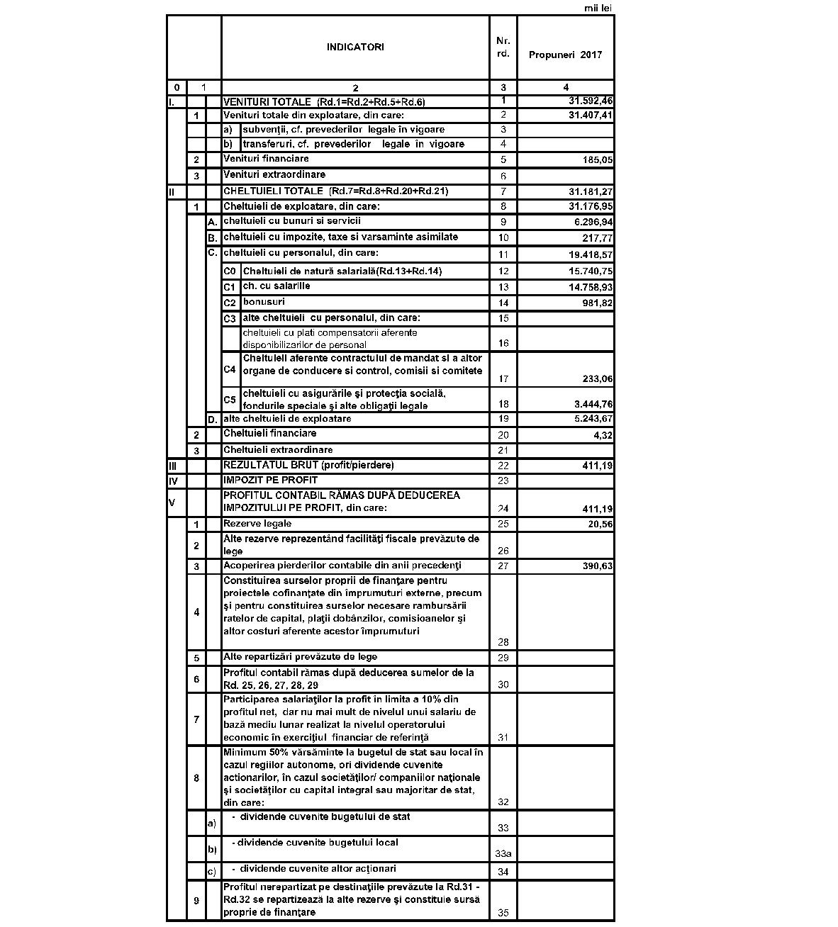 În temeiul art. 4 alin. (1) lit. b) din Ordonanţa Guvernului nr. 26/2013 privind întărirea disciplinei financiare la nivelul unor operatori economici la care statul sau unităţile administrativ-teritoriale sunt acţionari unici ori majoritari sau deţin direct ori indirect o participaţie majoritară, aprobată cu completări prin Legea nr. 47/2014, cu modificările şi completările ulterioare, al art. 5 alin. (4) din Hotărârea Guvernului nr. 21/2015 privind organizarea şi funcţionarea Ministerului Transporturilor, cu modificările şi completările ulterioare, al art. 10 alin. (4) din Hotărârea Guvernului nr. 34/2009 privind organizarea şi funcţionarea Ministerului Finanţelor Publice, cu modificările şi completările ulterioare, şi al art. 17 alin. (3) din Hotărârea Guvernului nr. 12/2017 privind organizarea şi funcţionarea Ministerului Muncii şi Justiţiei Sociale, precum şi modificarea unor acte normative,ministrul transporturilor, ministrul finanţelor publice şi ministrul muncii şi justiţiei sociale emit următorul ordin: Articolul 1Se aprobă bugetul de venituri şi cheltuieli pe anul 2017 al Societăţii Comerciale „Informatică Feroviară" - S.A., filiala Companiei Naţionale de Căi Ferate „C.F.R." - S.A., prevăzut în anexa care face parte integrantă din prezentul ordin. Articolul 2Prezentul ordin se publică în Monitorul Oficial al României, Partea I. Articolul 3 Societatea Comercială „Informatică Feroviară" - S.A. va duce la îndeplinire prevederile prezentului ordin.Ministrul transporturilor,Alexandru-Răzvan CucMinistrul finanţelor publice,Viorel ŞtefanMinistrul muncii şi justiţiei sociale,Lia-Olguţa VasilescuANEXĂ*)*) Anexa este reprodusă în facsimil.MINISTERUL TRANSPORTURILOR Societatea Comercială „Informatică Feroviară" - S.A. Str. Gării de Nord nr. 1, sectorul 1 Cod unic de înregistrare: 14966210 BUGETUL DE VENITURI ŞI CHELTUIELI pe anul 2017