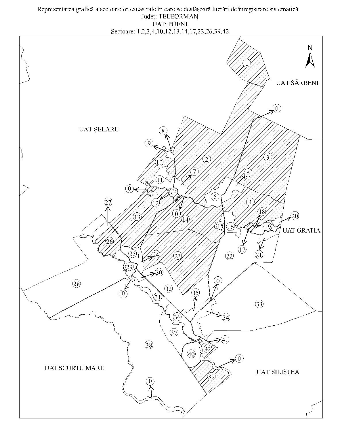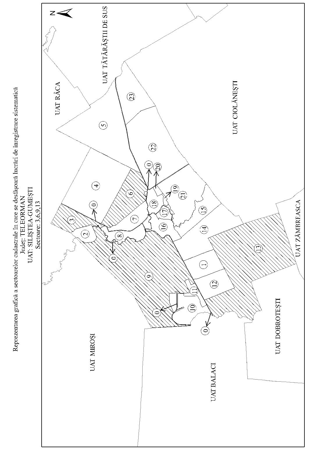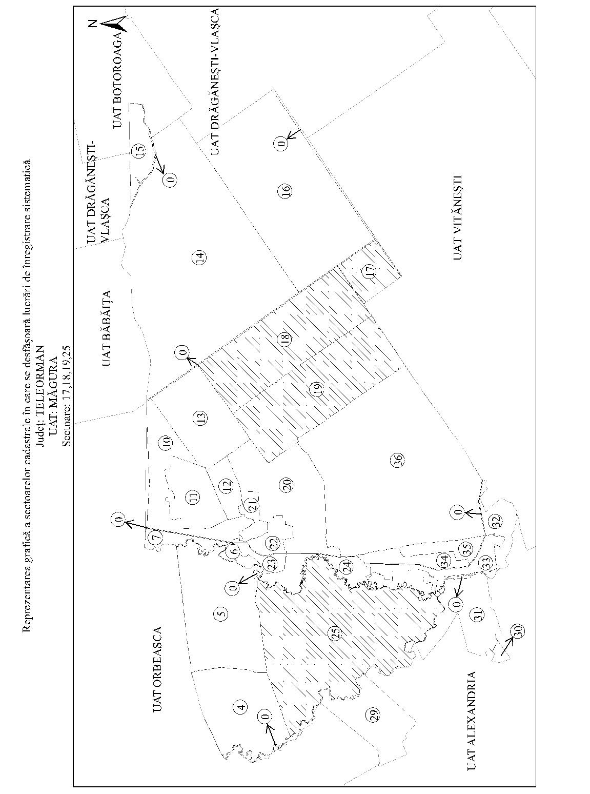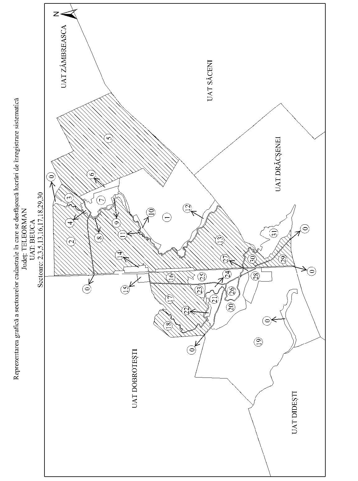 Având în vedere prevederile art. 11 alin. (1) din Legea cadastrului şi a publicităţii imobiliare nr. 7/1996, republicată, cu modificările şi completările ulterioare,în temeiul art. 3 alin. (13) din Legea cadastrului şi a publicităţii imobiliare nr. 7/1996, republicată, cu modificările şi completările ulterioare,directorul general al Agenţiei Naţionale de Cadastru şi Publicitate Imobiliară emite prezentul ordin: Articolul 1Se aprobă începerea lucrărilor de înregistrare sistematică a imobilelor, pe sectoare cadastrale, situate pe teritoriul a 21 de unităţi administrativ-teritoriale din judeţul Teleorman, după cum urmează: a)unitatea administrativ-teritorială Băbăiţa - sectoarele cadastrale nr. 21, 22, 24, 25; b)unitatea administrativ-teritorială Beuca - sectoarele cadastrale nr. 2, 3, 5, 13, 16, 17, 18, 29, 30; c)unitatea administrativ-teritorială Crevenicu - sectoarele cadastrale nr. 1, 4, 5, 8, 9, 12, 13, 14, 18; d)unitatea administrativ-teritorială Dideşti - sectoarele cadastrale nr. 4, 18; e)unitatea administrativ-teritorială Dobroteşti - sectoarele cadastrale nr. 4, 8, 12, 14, 26, 27, 51; f)unitatea administrativ-teritorială Gălăteni - sectoarele cadastrale nr. 1, 10, 11; g)unitatea administrativ-teritorială Lisa - sectoarele cadastrale nr. 17, 19, 22; h)unitatea administrativ-teritorială Măgura - sectoarele cadastrale nr. 17, 18, 19, 25; i)unitatea administrativ-teritorială Nenciuleşti - sectoarele cadastrale nr. 1, 24; j)unitatea administrativ-teritorială Olteni - sectoarele cadastrale nr. 2, 4, 8, 14, 26, 27; k)unitatea administrativ-teritorială Pietroşani - sectoarele cadastrale nr. 1, 2, 3, 4; l)unitatea administrativ-teritorială Plopii-Slăviteşti - sectoarele cadastrale nr. 4, 12; m)unitatea administrativ-teritorială Plosca - sectoarele cadastrale nr. 16, 18; n)unitatea administrativ-teritorială Poeni - sectoarele cadastrale nr. 1, 2, 3, 4, 10, 12, 13, 14, 17, 23, 26, 39, 42; o)unitatea administrativ-teritorială Rădoieşti - sectoarele cadastrale nr. 6, 7, 8, 33; p)unitatea administrativ-teritorială Siliştea-Gumeşti - sectoarele cadastrale nr. 3, 6, 9, 13; q)unitatea administrativ-teritorială Slobozia Mândra - sectoarele cadastrale nr. 1, 10, 21, 22, 23; r)unitatea administrativ-teritorială Tătărăştii de Jos - sectoarele cadastrale nr. 6, 13, 21, 32, 33, 36; s)unitatea administrativ-teritorială Trivalea-Moşteni - sectoarele cadastrale nr. 10, 17, 19, 31; t)unitatea administrativ-teritorială Videle - sectoarele cadastrale nr. 2, 6, 7, 8, 10, 16, 21, 52, 54, 55, 57; u)unitatea administrativ-teritorială Vităneşti - sectoarele cadastrale nr. 25, 26, 41. Articolul 2Reprezentarea grafică a sectoarelor cadastrale în care se desfăşoară lucrările de înregistrare sistematică a imobilelor este prevăzută în anexele nr. 1-21 la prezentul ordin. Articolul 3Anexele nr. 1-21*) fac parte integrantă din prezentul ordin.*) Anexele nr. 1-21 sunt reproduse în facsimil. Articolul 4 Prezentul ordin se publică în Monitorul Oficial al României, Partea I. Directorul general al Agenţiei Naţionale de Cadastru şi Publicitate Imobiliară, Radu-Codruţ Ştefănescu ANEXA Nr. 1