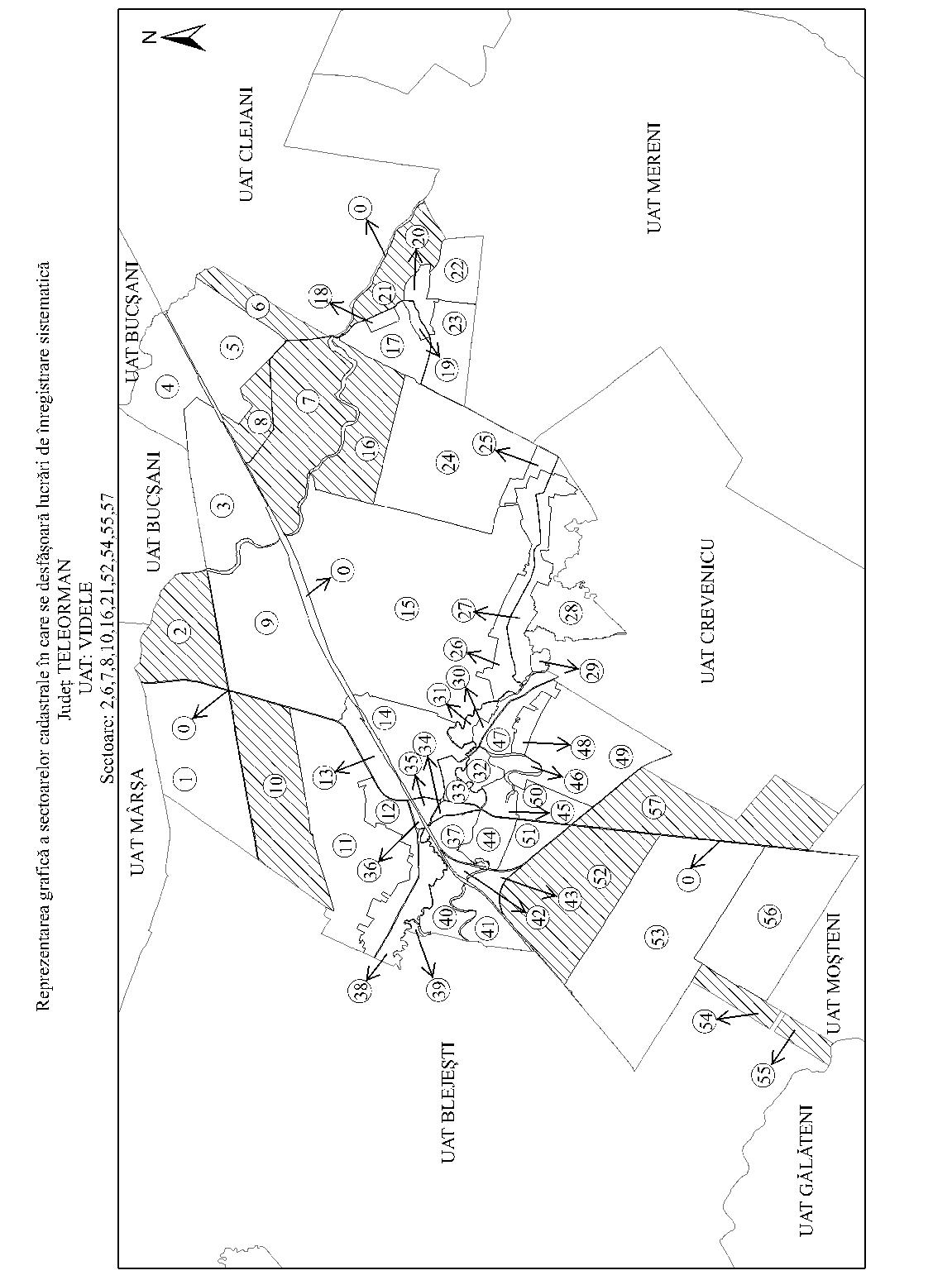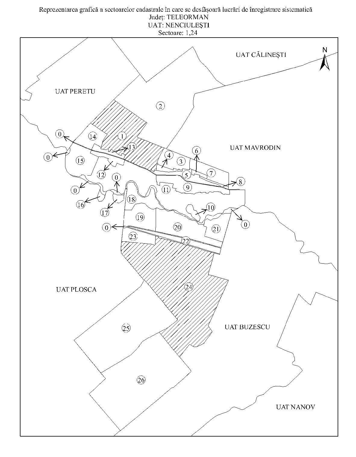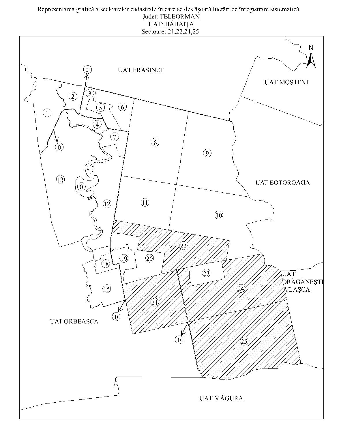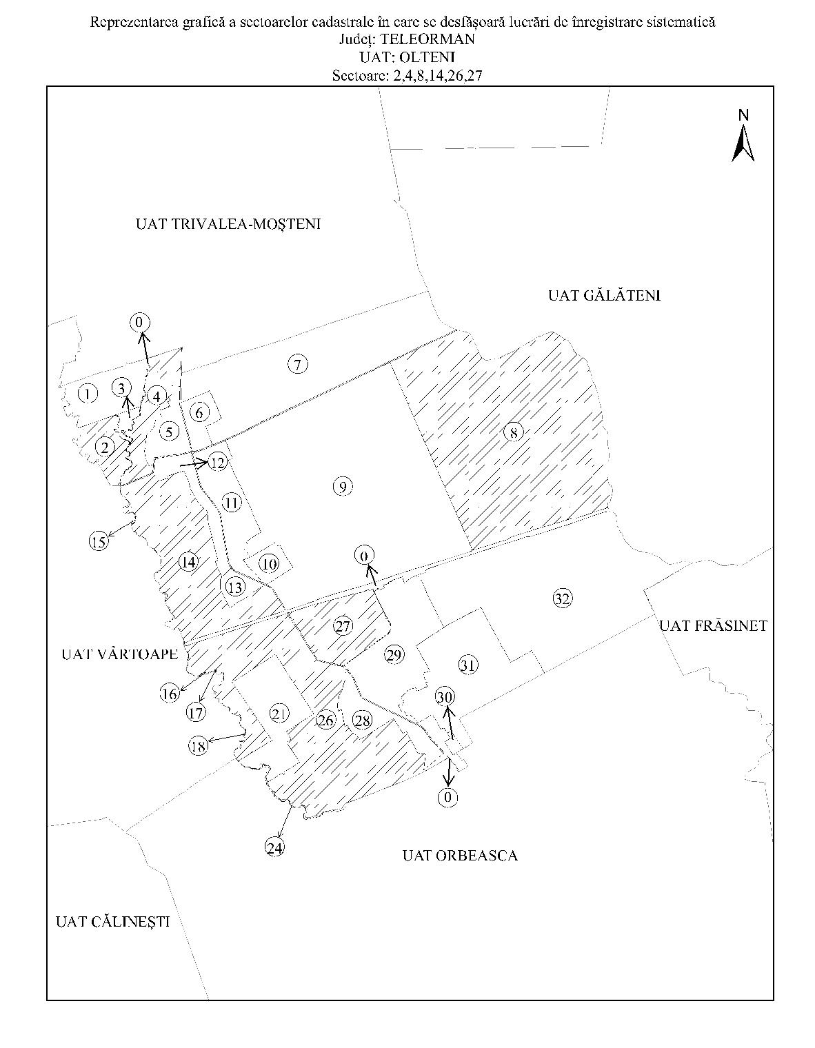 Având în vedere prevederile art. 11 alin. (1) din Legea cadastrului şi a publicităţii imobiliare nr. 7/1996, republicată, cu modificările şi completările ulterioare,în temeiul art. 3 alin. (13) din Legea cadastrului şi a publicităţii imobiliare nr. 7/1996, republicată, cu modificările şi completările ulterioare,directorul general al Agenţiei Naţionale de Cadastru şi Publicitate Imobiliară emite prezentul ordin: Articolul 1Se aprobă începerea lucrărilor de înregistrare sistematică a imobilelor, pe sectoare cadastrale, situate pe teritoriul a 21 de unităţi administrativ-teritoriale din judeţul Teleorman, după cum urmează: a)unitatea administrativ-teritorială Băbăiţa - sectoarele cadastrale nr. 21, 22, 24, 25; b)unitatea administrativ-teritorială Beuca - sectoarele cadastrale nr. 2, 3, 5, 13, 16, 17, 18, 29, 30; c)unitatea administrativ-teritorială Crevenicu - sectoarele cadastrale nr. 1, 4, 5, 8, 9, 12, 13, 14, 18; d)unitatea administrativ-teritorială Dideşti - sectoarele cadastrale nr. 4, 18; e)unitatea administrativ-teritorială Dobroteşti - sectoarele cadastrale nr. 4, 8, 12, 14, 26, 27, 51; f)unitatea administrativ-teritorială Gălăteni - sectoarele cadastrale nr. 1, 10, 11; g)unitatea administrativ-teritorială Lisa - sectoarele cadastrale nr. 17, 19, 22; h)unitatea administrativ-teritorială Măgura - sectoarele cadastrale nr. 17, 18, 19, 25; i)unitatea administrativ-teritorială Nenciuleşti - sectoarele cadastrale nr. 1, 24; j)unitatea administrativ-teritorială Olteni - sectoarele cadastrale nr. 2, 4, 8, 14, 26, 27; k)unitatea administrativ-teritorială Pietroşani - sectoarele cadastrale nr. 1, 2, 3, 4; l)unitatea administrativ-teritorială Plopii-Slăviteşti - sectoarele cadastrale nr. 4, 12; m)unitatea administrativ-teritorială Plosca - sectoarele cadastrale nr. 16, 18; n)unitatea administrativ-teritorială Poeni - sectoarele cadastrale nr. 1, 2, 3, 4, 10, 12, 13, 14, 17, 23, 26, 39, 42; o)unitatea administrativ-teritorială Rădoieşti - sectoarele cadastrale nr. 6, 7, 8, 33; p)unitatea administrativ-teritorială Siliştea-Gumeşti - sectoarele cadastrale nr. 3, 6, 9, 13; q)unitatea administrativ-teritorială Slobozia Mândra - sectoarele cadastrale nr. 1, 10, 21, 22, 23; r)unitatea administrativ-teritorială Tătărăştii de Jos - sectoarele cadastrale nr. 6, 13, 21, 32, 33, 36; s)unitatea administrativ-teritorială Trivalea-Moşteni - sectoarele cadastrale nr. 10, 17, 19, 31; t)unitatea administrativ-teritorială Videle - sectoarele cadastrale nr. 2, 6, 7, 8, 10, 16, 21, 52, 54, 55, 57; u)unitatea administrativ-teritorială Vităneşti - sectoarele cadastrale nr. 25, 26, 41. Articolul 2Reprezentarea grafică a sectoarelor cadastrale în care se desfăşoară lucrările de înregistrare sistematică a imobilelor este prevăzută în anexele nr. 1-21 la prezentul ordin. Articolul 3Anexele nr. 1-21*) fac parte integrantă din prezentul ordin.*) Anexele nr. 1-21 sunt reproduse în facsimil. Articolul 4 Prezentul ordin se publică în Monitorul Oficial al României, Partea I. Directorul general al Agenţiei Naţionale de Cadastru şi Publicitate Imobiliară, Radu-Codruţ Ştefănescu ANEXA Nr. 1