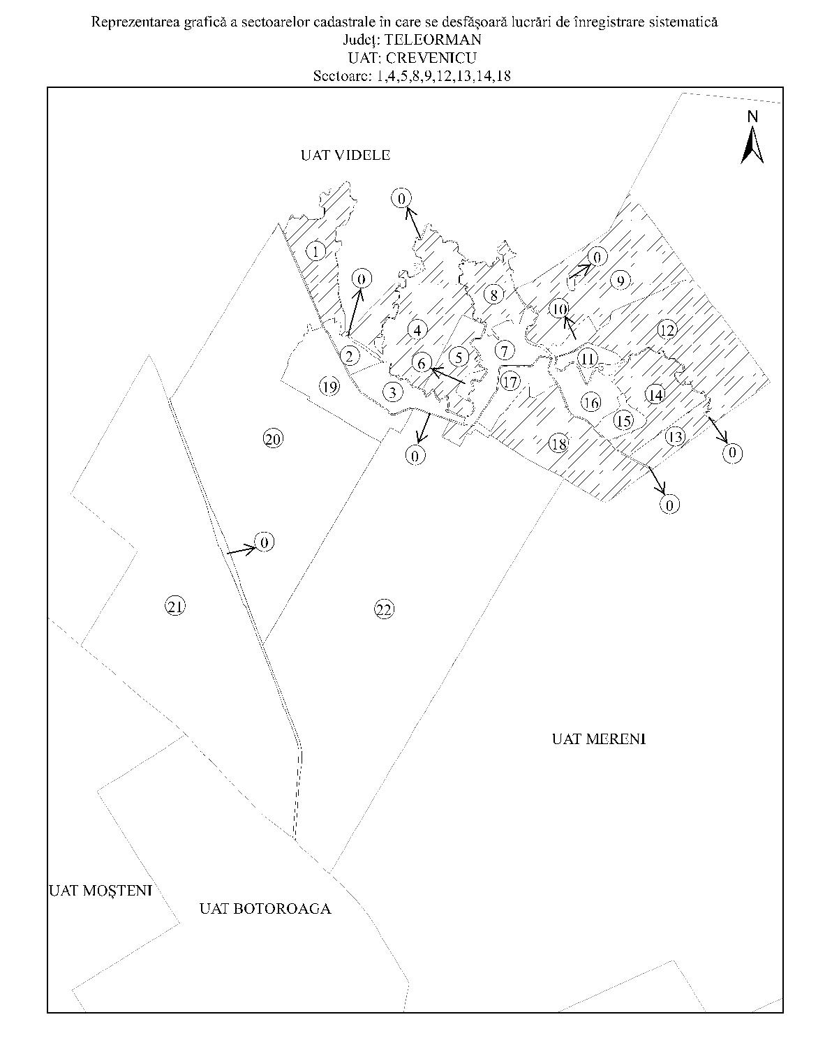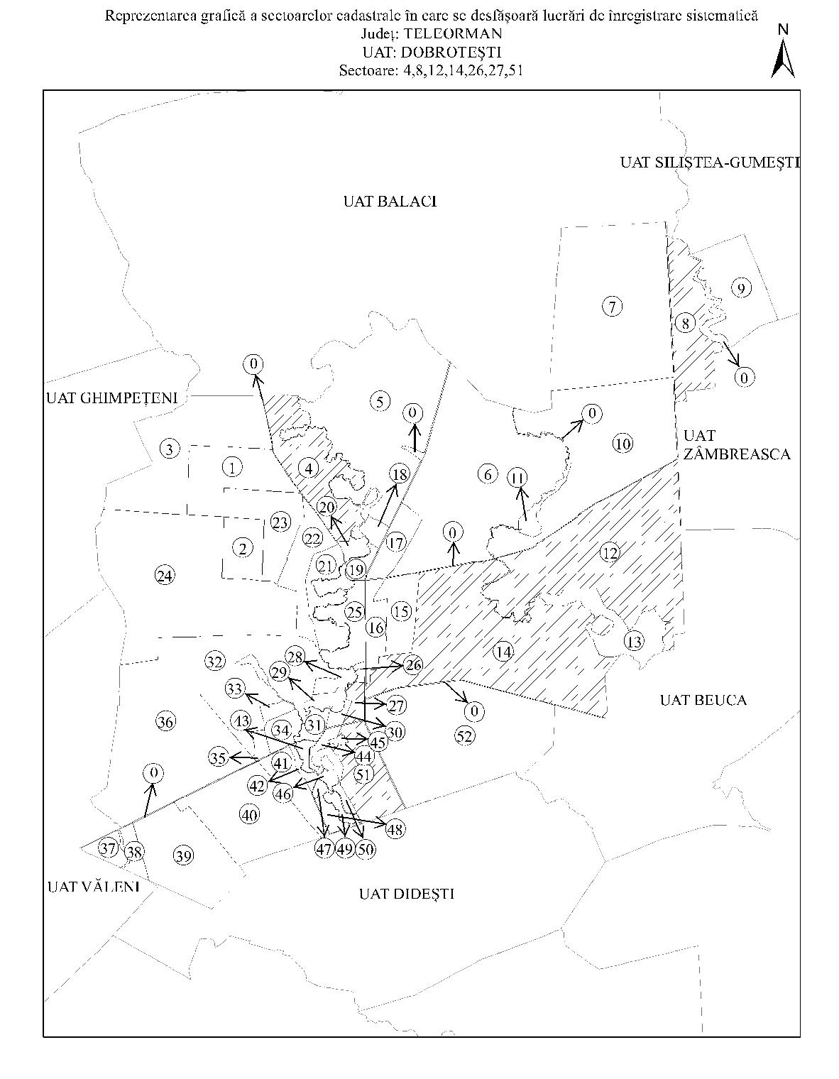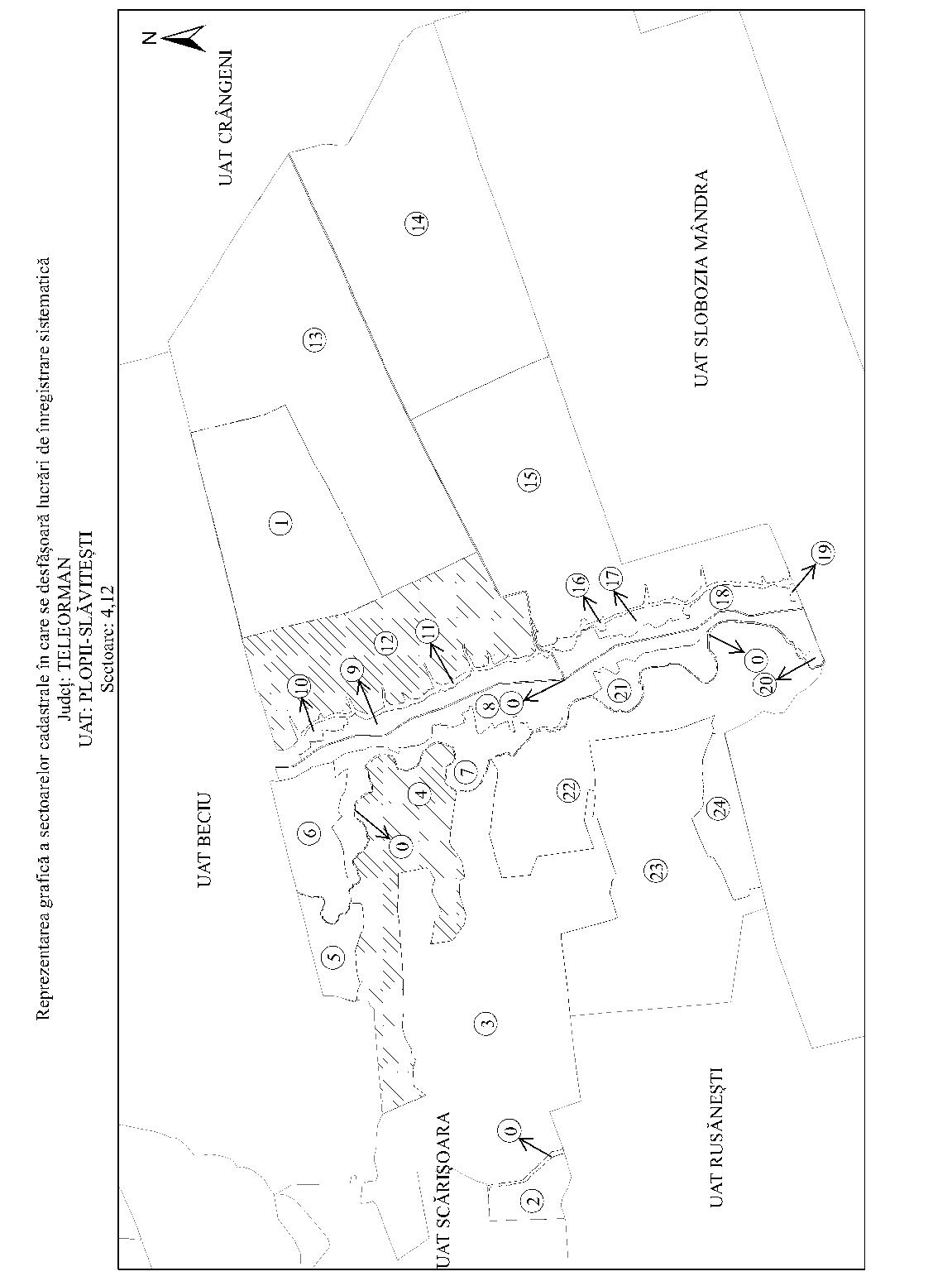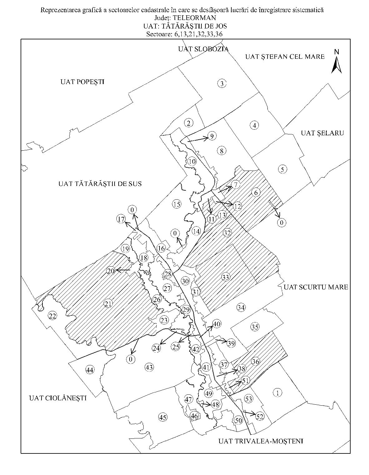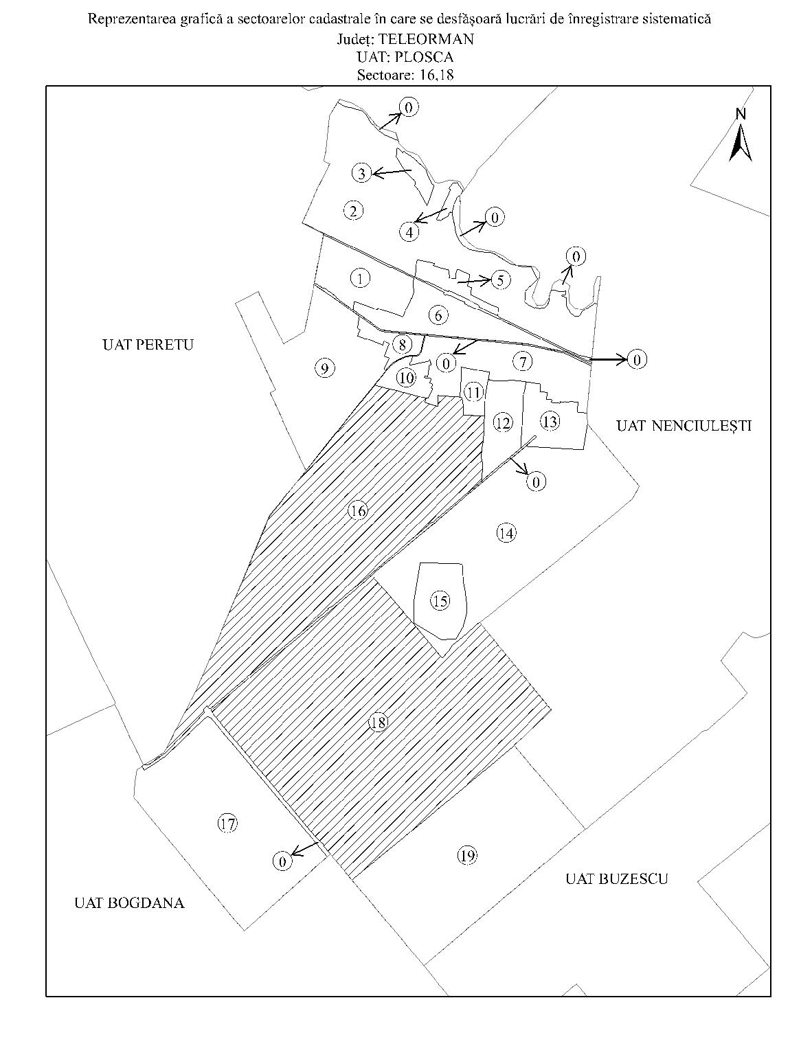 Având în vedere prevederile art. 11 alin. (1) din Legea cadastrului şi a publicităţii imobiliare nr. 7/1996, republicată, cu modificările şi completările ulterioare,în temeiul art. 3 alin. (13) din Legea cadastrului şi a publicităţii imobiliare nr. 7/1996, republicată, cu modificările şi completările ulterioare,directorul general al Agenţiei Naţionale de Cadastru şi Publicitate Imobiliară emite prezentul ordin: Articolul 1Se aprobă începerea lucrărilor de înregistrare sistematică a imobilelor, pe sectoare cadastrale, situate pe teritoriul a 21 de unităţi administrativ-teritoriale din judeţul Teleorman, după cum urmează: a)unitatea administrativ-teritorială Băbăiţa - sectoarele cadastrale nr. 21, 22, 24, 25; b)unitatea administrativ-teritorială Beuca - sectoarele cadastrale nr. 2, 3, 5, 13, 16, 17, 18, 29, 30; c)unitatea administrativ-teritorială Crevenicu - sectoarele cadastrale nr. 1, 4, 5, 8, 9, 12, 13, 14, 18; d)unitatea administrativ-teritorială Dideşti - sectoarele cadastrale nr. 4, 18; e)unitatea administrativ-teritorială Dobroteşti - sectoarele cadastrale nr. 4, 8, 12, 14, 26, 27, 51; f)unitatea administrativ-teritorială Gălăteni - sectoarele cadastrale nr. 1, 10, 11; g)unitatea administrativ-teritorială Lisa - sectoarele cadastrale nr. 17, 19, 22; h)unitatea administrativ-teritorială Măgura - sectoarele cadastrale nr. 17, 18, 19, 25; i)unitatea administrativ-teritorială Nenciuleşti - sectoarele cadastrale nr. 1, 24; j)unitatea administrativ-teritorială Olteni - sectoarele cadastrale nr. 2, 4, 8, 14, 26, 27; k)unitatea administrativ-teritorială Pietroşani - sectoarele cadastrale nr. 1, 2, 3, 4; l)unitatea administrativ-teritorială Plopii-Slăviteşti - sectoarele cadastrale nr. 4, 12; m)unitatea administrativ-teritorială Plosca - sectoarele cadastrale nr. 16, 18; n)unitatea administrativ-teritorială Poeni - sectoarele cadastrale nr. 1, 2, 3, 4, 10, 12, 13, 14, 17, 23, 26, 39, 42; o)unitatea administrativ-teritorială Rădoieşti - sectoarele cadastrale nr. 6, 7, 8, 33; p)unitatea administrativ-teritorială Siliştea-Gumeşti - sectoarele cadastrale nr. 3, 6, 9, 13; q)unitatea administrativ-teritorială Slobozia Mândra - sectoarele cadastrale nr. 1, 10, 21, 22, 23; r)unitatea administrativ-teritorială Tătărăştii de Jos - sectoarele cadastrale nr. 6, 13, 21, 32, 33, 36; s)unitatea administrativ-teritorială Trivalea-Moşteni - sectoarele cadastrale nr. 10, 17, 19, 31; t)unitatea administrativ-teritorială Videle - sectoarele cadastrale nr. 2, 6, 7, 8, 10, 16, 21, 52, 54, 55, 57; u)unitatea administrativ-teritorială Vităneşti - sectoarele cadastrale nr. 25, 26, 41. Articolul 2Reprezentarea grafică a sectoarelor cadastrale în care se desfăşoară lucrările de înregistrare sistematică a imobilelor este prevăzută în anexele nr. 1-21 la prezentul ordin. Articolul 3Anexele nr. 1-21*) fac parte integrantă din prezentul ordin.*) Anexele nr. 1-21 sunt reproduse în facsimil. Articolul 4 Prezentul ordin se publică în Monitorul Oficial al României, Partea I. Directorul general al Agenţiei Naţionale de Cadastru şi Publicitate Imobiliară, Radu-Codruţ Ştefănescu ANEXA Nr. 1