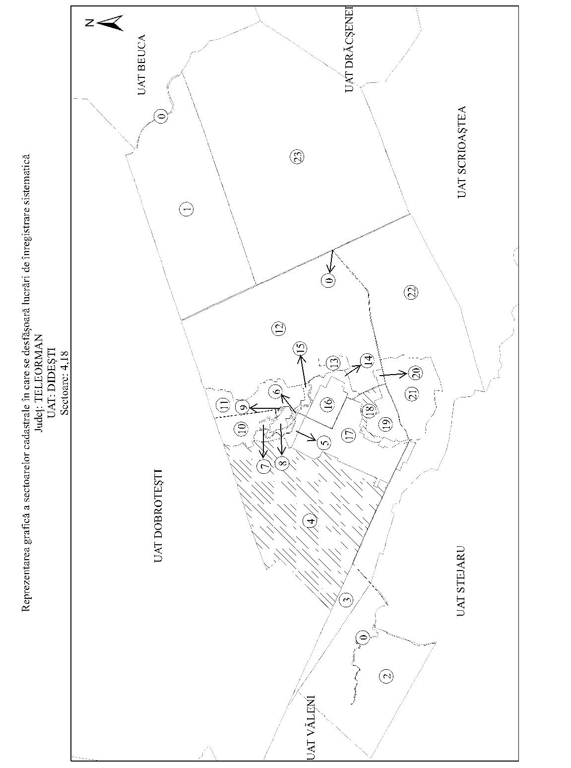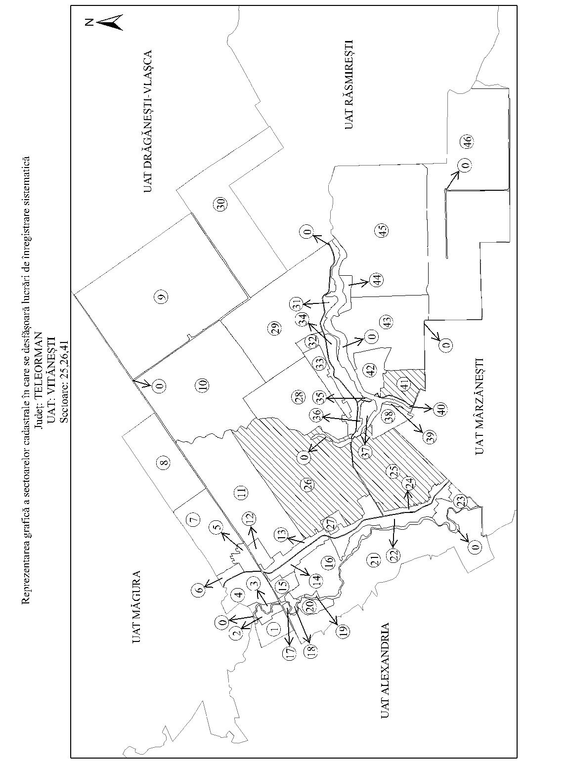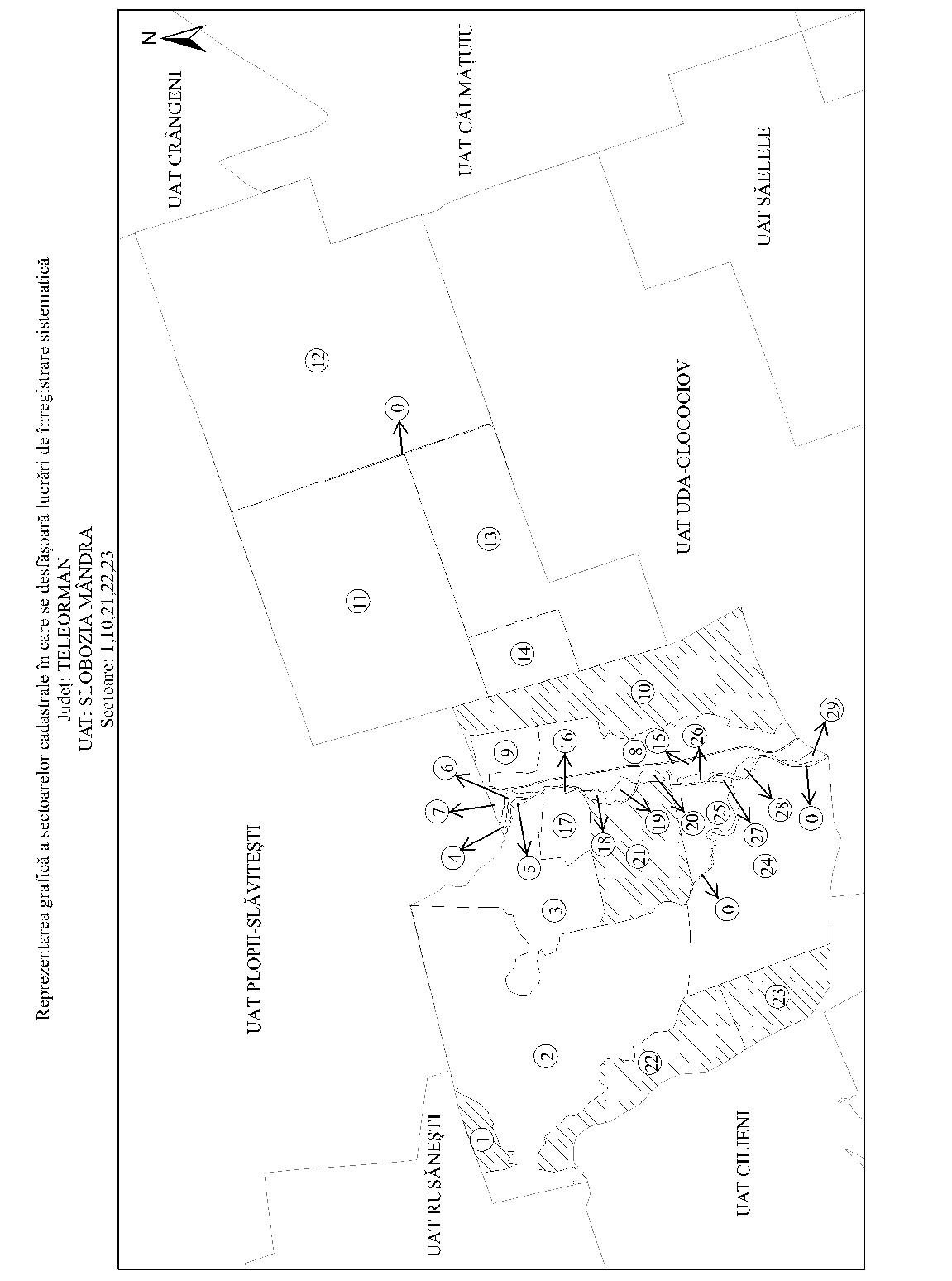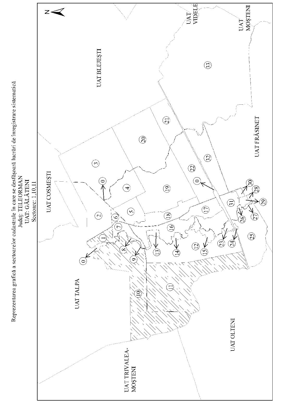 Având în vedere prevederile art. 11 alin. (1) din Legea cadastrului şi a publicităţii imobiliare nr. 7/1996, republicată, cu modificările şi completările ulterioare,în temeiul art. 3 alin. (13) din Legea cadastrului şi a publicităţii imobiliare nr. 7/1996, republicată, cu modificările şi completările ulterioare,directorul general al Agenţiei Naţionale de Cadastru şi Publicitate Imobiliară emite prezentul ordin: Articolul 1Se aprobă începerea lucrărilor de înregistrare sistematică a imobilelor, pe sectoare cadastrale, situate pe teritoriul a 21 de unităţi administrativ-teritoriale din judeţul Teleorman, după cum urmează: a)unitatea administrativ-teritorială Băbăiţa - sectoarele cadastrale nr. 21, 22, 24, 25; b)unitatea administrativ-teritorială Beuca - sectoarele cadastrale nr. 2, 3, 5, 13, 16, 17, 18, 29, 30; c)unitatea administrativ-teritorială Crevenicu - sectoarele cadastrale nr. 1, 4, 5, 8, 9, 12, 13, 14, 18; d)unitatea administrativ-teritorială Dideşti - sectoarele cadastrale nr. 4, 18; e)unitatea administrativ-teritorială Dobroteşti - sectoarele cadastrale nr. 4, 8, 12, 14, 26, 27, 51; f)unitatea administrativ-teritorială Gălăteni - sectoarele cadastrale nr. 1, 10, 11; g)unitatea administrativ-teritorială Lisa - sectoarele cadastrale nr. 17, 19, 22; h)unitatea administrativ-teritorială Măgura - sectoarele cadastrale nr. 17, 18, 19, 25; i)unitatea administrativ-teritorială Nenciuleşti - sectoarele cadastrale nr. 1, 24; j)unitatea administrativ-teritorială Olteni - sectoarele cadastrale nr. 2, 4, 8, 14, 26, 27; k)unitatea administrativ-teritorială Pietroşani - sectoarele cadastrale nr. 1, 2, 3, 4; l)unitatea administrativ-teritorială Plopii-Slăviteşti - sectoarele cadastrale nr. 4, 12; m)unitatea administrativ-teritorială Plosca - sectoarele cadastrale nr. 16, 18; n)unitatea administrativ-teritorială Poeni - sectoarele cadastrale nr. 1, 2, 3, 4, 10, 12, 13, 14, 17, 23, 26, 39, 42; o)unitatea administrativ-teritorială Rădoieşti - sectoarele cadastrale nr. 6, 7, 8, 33; p)unitatea administrativ-teritorială Siliştea-Gumeşti - sectoarele cadastrale nr. 3, 6, 9, 13; q)unitatea administrativ-teritorială Slobozia Mândra - sectoarele cadastrale nr. 1, 10, 21, 22, 23; r)unitatea administrativ-teritorială Tătărăştii de Jos - sectoarele cadastrale nr. 6, 13, 21, 32, 33, 36; s)unitatea administrativ-teritorială Trivalea-Moşteni - sectoarele cadastrale nr. 10, 17, 19, 31; t)unitatea administrativ-teritorială Videle - sectoarele cadastrale nr. 2, 6, 7, 8, 10, 16, 21, 52, 54, 55, 57; u)unitatea administrativ-teritorială Vităneşti - sectoarele cadastrale nr. 25, 26, 41. Articolul 2Reprezentarea grafică a sectoarelor cadastrale în care se desfăşoară lucrările de înregistrare sistematică a imobilelor este prevăzută în anexele nr. 1-21 la prezentul ordin. Articolul 3Anexele nr. 1-21*) fac parte integrantă din prezentul ordin.*) Anexele nr. 1-21 sunt reproduse în facsimil. Articolul 4 Prezentul ordin se publică în Monitorul Oficial al României, Partea I. Directorul general al Agenţiei Naţionale de Cadastru şi Publicitate Imobiliară, Radu-Codruţ Ştefănescu ANEXA Nr. 1