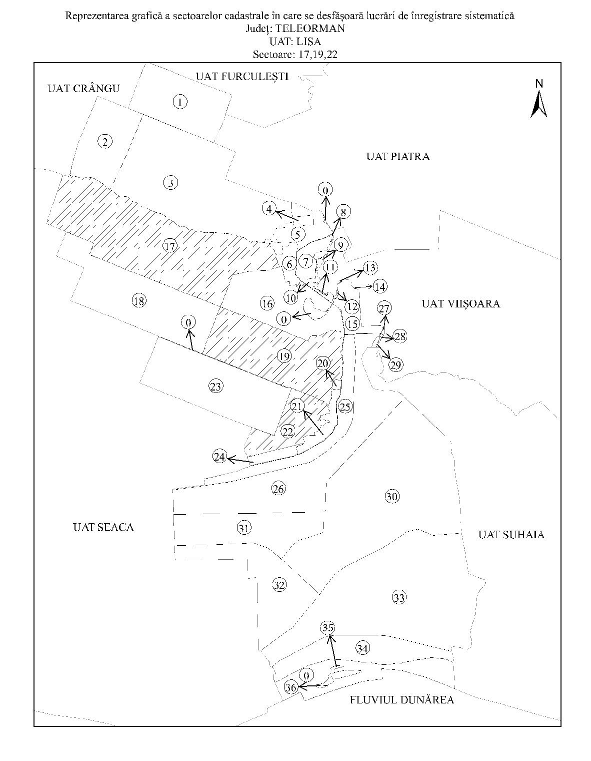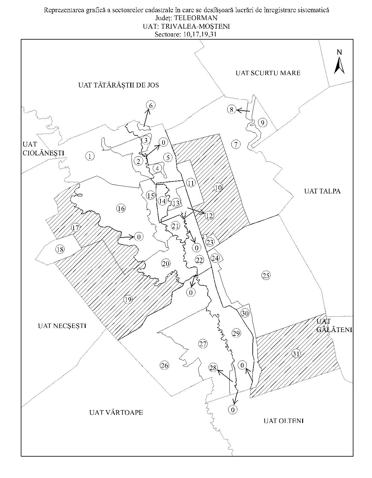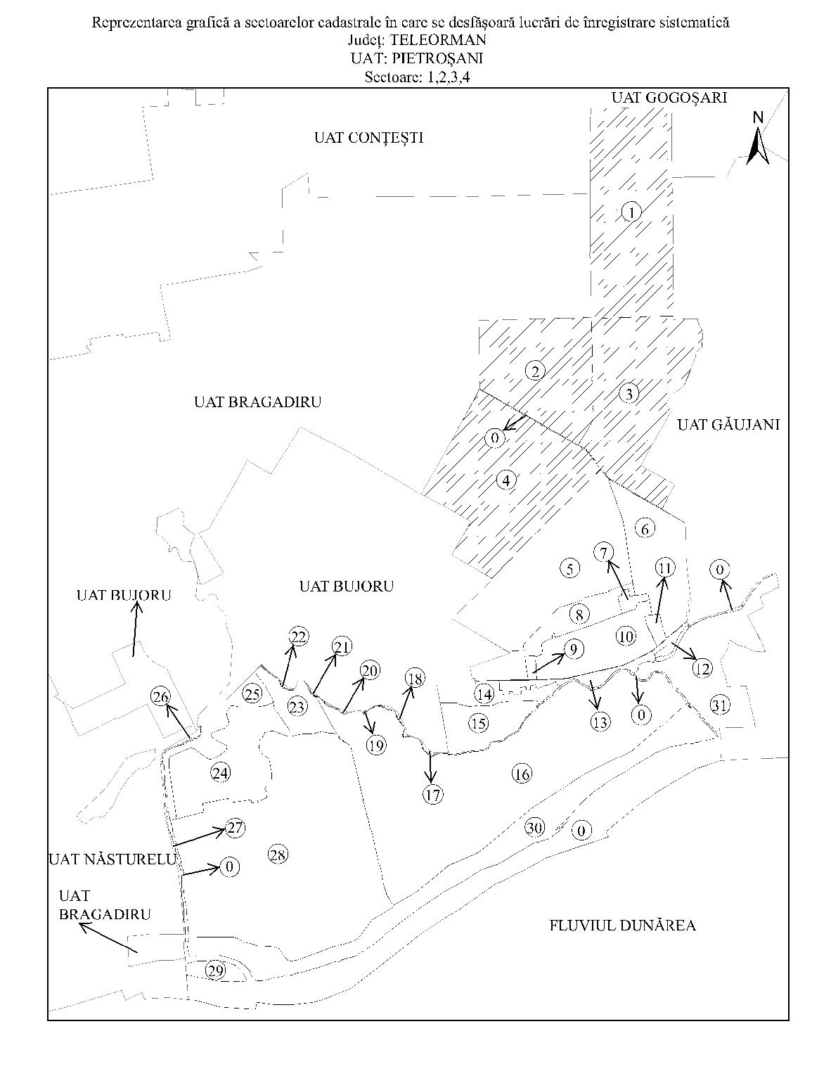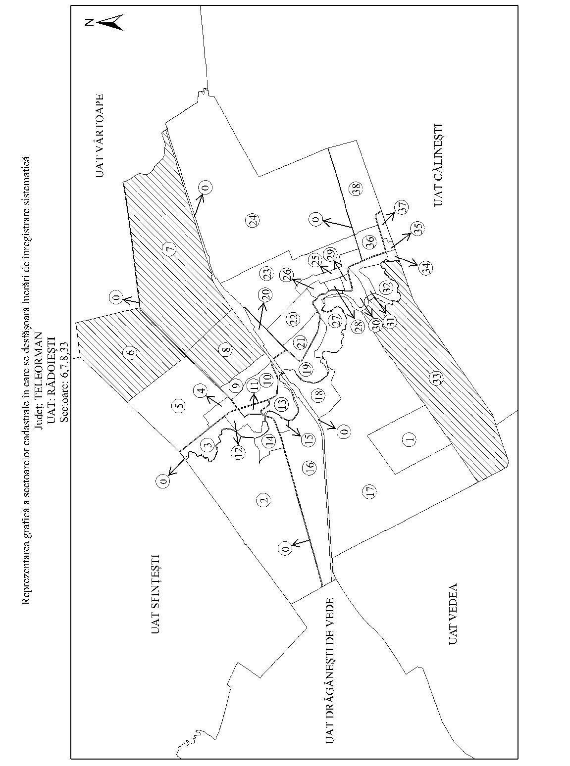 Având în vedere prevederile art. 11 alin. (1) din Legea cadastrului şi a publicităţii imobiliare nr. 7/1996, republicată, cu modificările şi completările ulterioare,în temeiul art. 3 alin. (13) din Legea cadastrului şi a publicităţii imobiliare nr. 7/1996, republicată, cu modificările şi completările ulterioare,directorul general al Agenţiei Naţionale de Cadastru şi Publicitate Imobiliară emite prezentul ordin: Articolul 1Se aprobă începerea lucrărilor de înregistrare sistematică a imobilelor, pe sectoare cadastrale, situate pe teritoriul a 21 de unităţi administrativ-teritoriale din judeţul Teleorman, după cum urmează: a)unitatea administrativ-teritorială Băbăiţa - sectoarele cadastrale nr. 21, 22, 24, 25; b)unitatea administrativ-teritorială Beuca - sectoarele cadastrale nr. 2, 3, 5, 13, 16, 17, 18, 29, 30; c)unitatea administrativ-teritorială Crevenicu - sectoarele cadastrale nr. 1, 4, 5, 8, 9, 12, 13, 14, 18; d)unitatea administrativ-teritorială Dideşti - sectoarele cadastrale nr. 4, 18; e)unitatea administrativ-teritorială Dobroteşti - sectoarele cadastrale nr. 4, 8, 12, 14, 26, 27, 51; f)unitatea administrativ-teritorială Gălăteni - sectoarele cadastrale nr. 1, 10, 11; g)unitatea administrativ-teritorială Lisa - sectoarele cadastrale nr. 17, 19, 22; h)unitatea administrativ-teritorială Măgura - sectoarele cadastrale nr. 17, 18, 19, 25; i)unitatea administrativ-teritorială Nenciuleşti - sectoarele cadastrale nr. 1, 24; j)unitatea administrativ-teritorială Olteni - sectoarele cadastrale nr. 2, 4, 8, 14, 26, 27; k)unitatea administrativ-teritorială Pietroşani - sectoarele cadastrale nr. 1, 2, 3, 4; l)unitatea administrativ-teritorială Plopii-Slăviteşti - sectoarele cadastrale nr. 4, 12; m)unitatea administrativ-teritorială Plosca - sectoarele cadastrale nr. 16, 18; n)unitatea administrativ-teritorială Poeni - sectoarele cadastrale nr. 1, 2, 3, 4, 10, 12, 13, 14, 17, 23, 26, 39, 42; o)unitatea administrativ-teritorială Rădoieşti - sectoarele cadastrale nr. 6, 7, 8, 33; p)unitatea administrativ-teritorială Siliştea-Gumeşti - sectoarele cadastrale nr. 3, 6, 9, 13; q)unitatea administrativ-teritorială Slobozia Mândra - sectoarele cadastrale nr. 1, 10, 21, 22, 23; r)unitatea administrativ-teritorială Tătărăştii de Jos - sectoarele cadastrale nr. 6, 13, 21, 32, 33, 36; s)unitatea administrativ-teritorială Trivalea-Moşteni - sectoarele cadastrale nr. 10, 17, 19, 31; t)unitatea administrativ-teritorială Videle - sectoarele cadastrale nr. 2, 6, 7, 8, 10, 16, 21, 52, 54, 55, 57; u)unitatea administrativ-teritorială Vităneşti - sectoarele cadastrale nr. 25, 26, 41. Articolul 2Reprezentarea grafică a sectoarelor cadastrale în care se desfăşoară lucrările de înregistrare sistematică a imobilelor este prevăzută în anexele nr. 1-21 la prezentul ordin. Articolul 3Anexele nr. 1-21*) fac parte integrantă din prezentul ordin.*) Anexele nr. 1-21 sunt reproduse în facsimil. Articolul 4 Prezentul ordin se publică în Monitorul Oficial al României, Partea I. Directorul general al Agenţiei Naţionale de Cadastru şi Publicitate Imobiliară, Radu-Codruţ Ştefănescu ANEXA Nr. 1